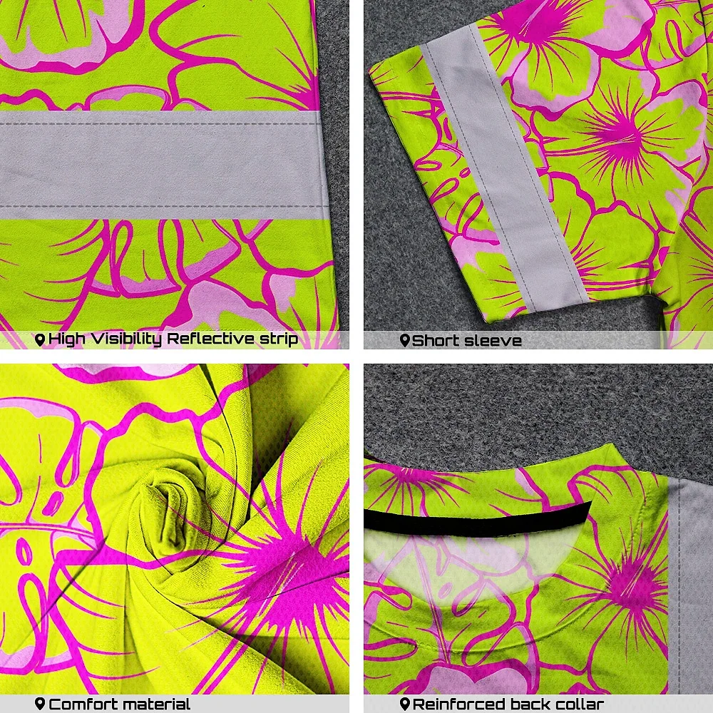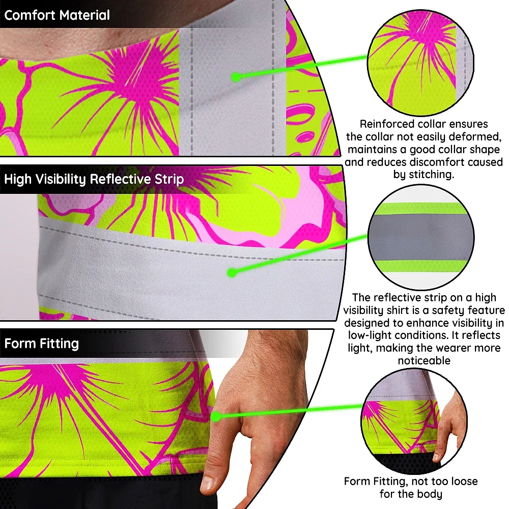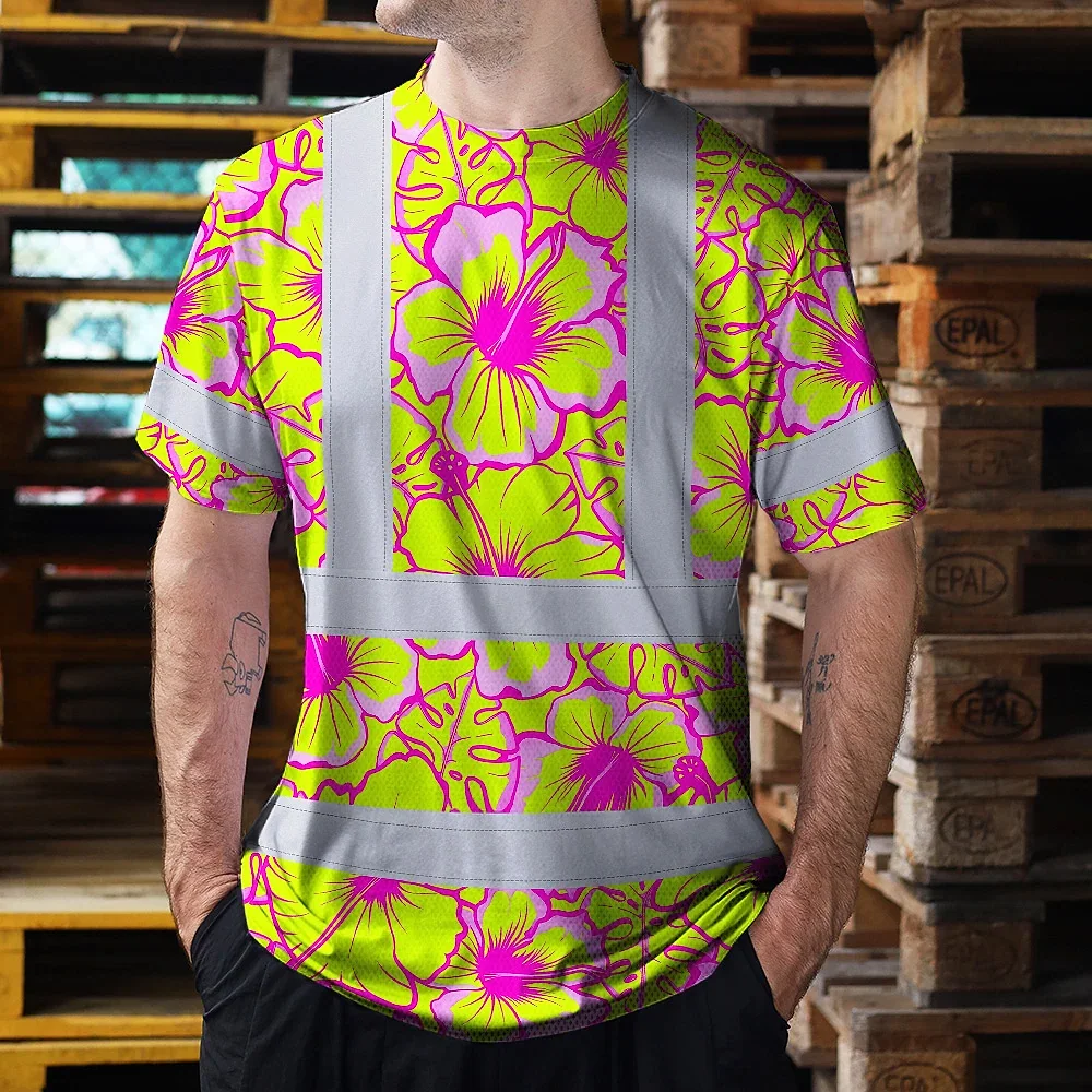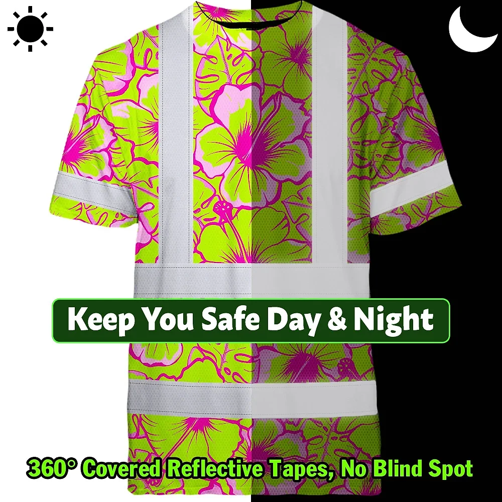 Hi Vis T Shirt Reflective Tapes Pink Neon And Lime Flowers Hawaii Custom Name Safety Workwear For Workers, Truckers, Operators