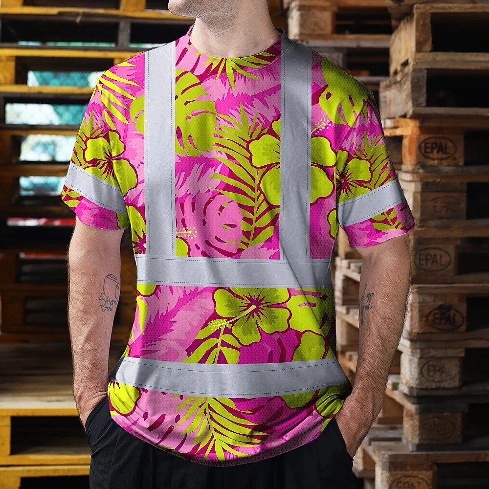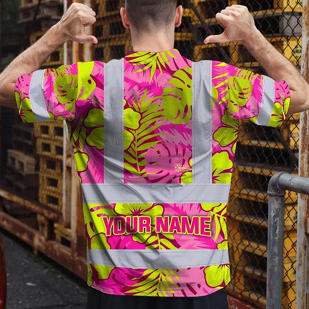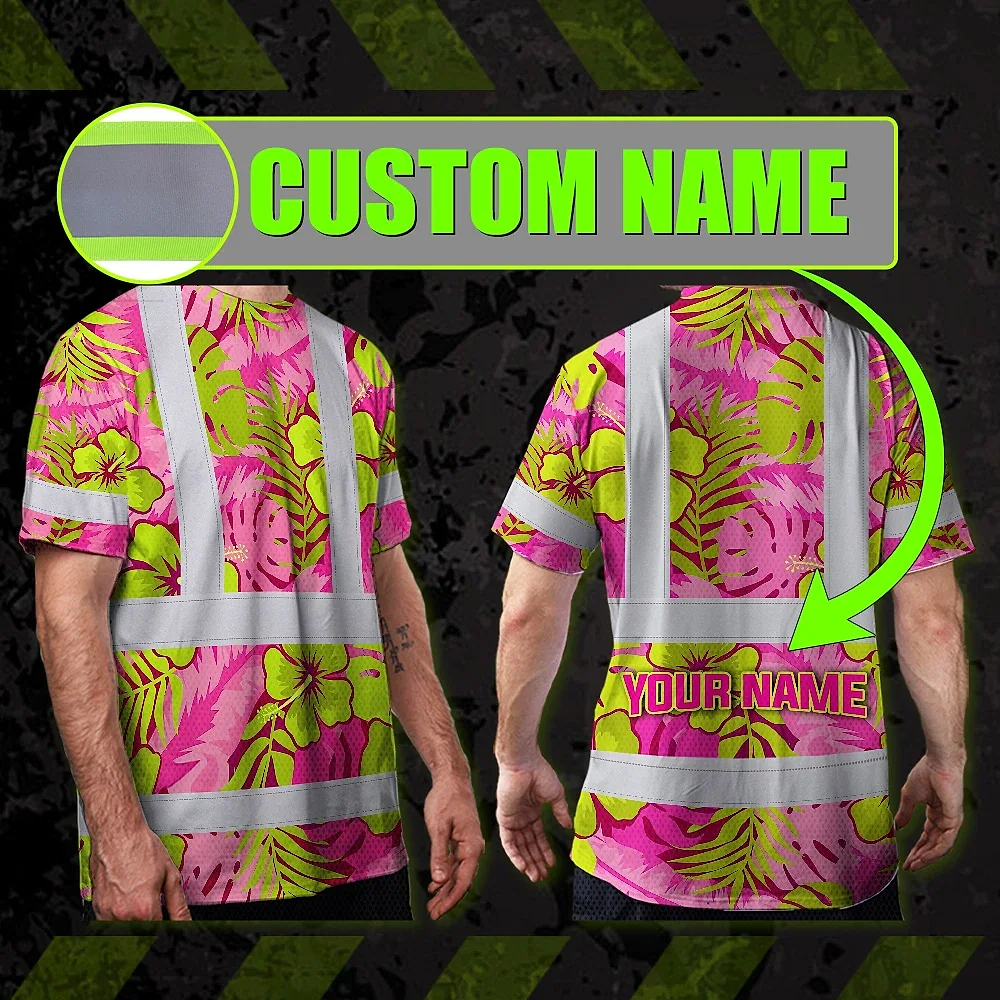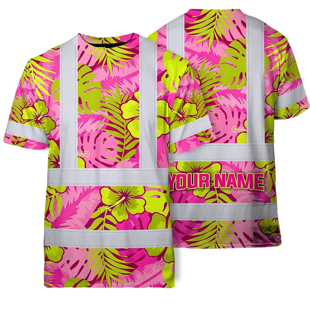 Hi Vis T Shirt Reflective Tapes Pink Neon And Lime Flowers Hawaii Custom Name Safety Workwear For Workers, Truckers, Operators