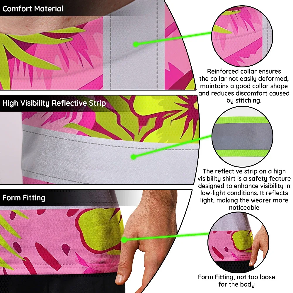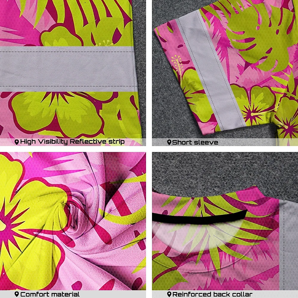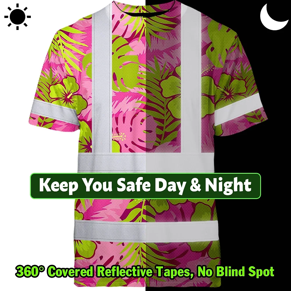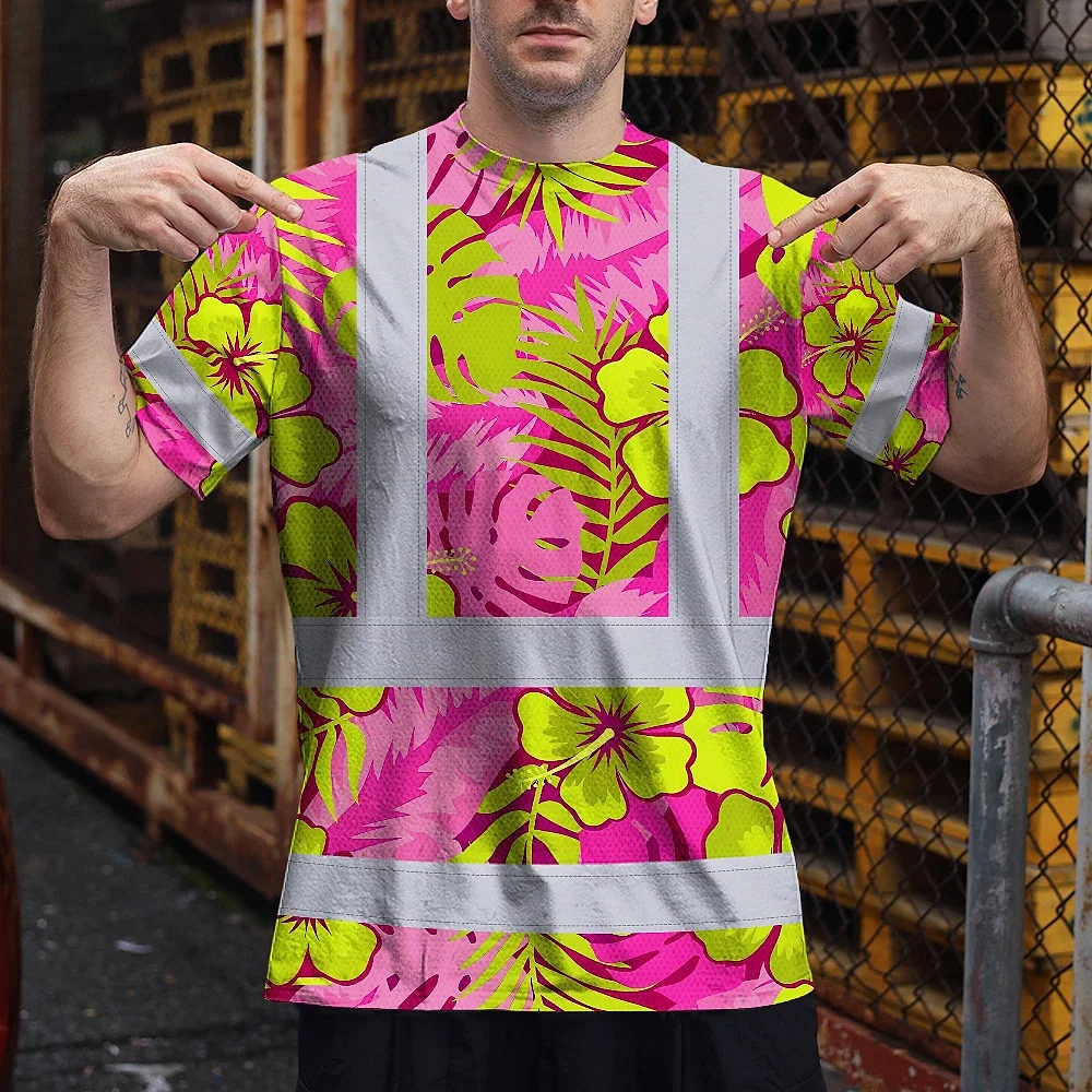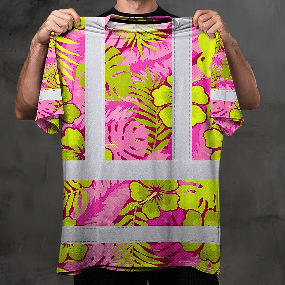 Hi Vis T Shirt Reflective Tapes Pink Neon And Lime Flowers Hawaii Custom Name Safety Workwear For Workers, Truckers, Operators