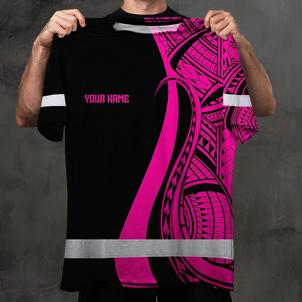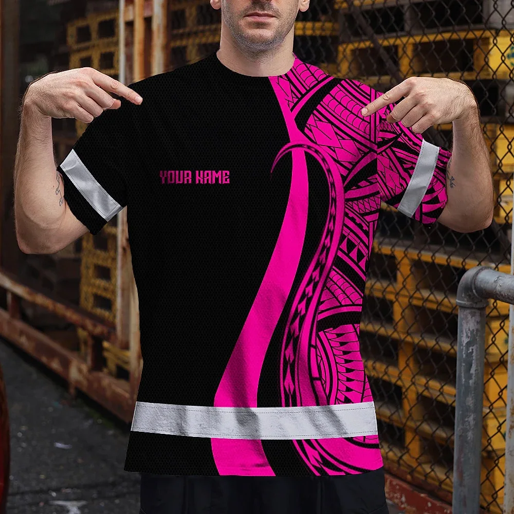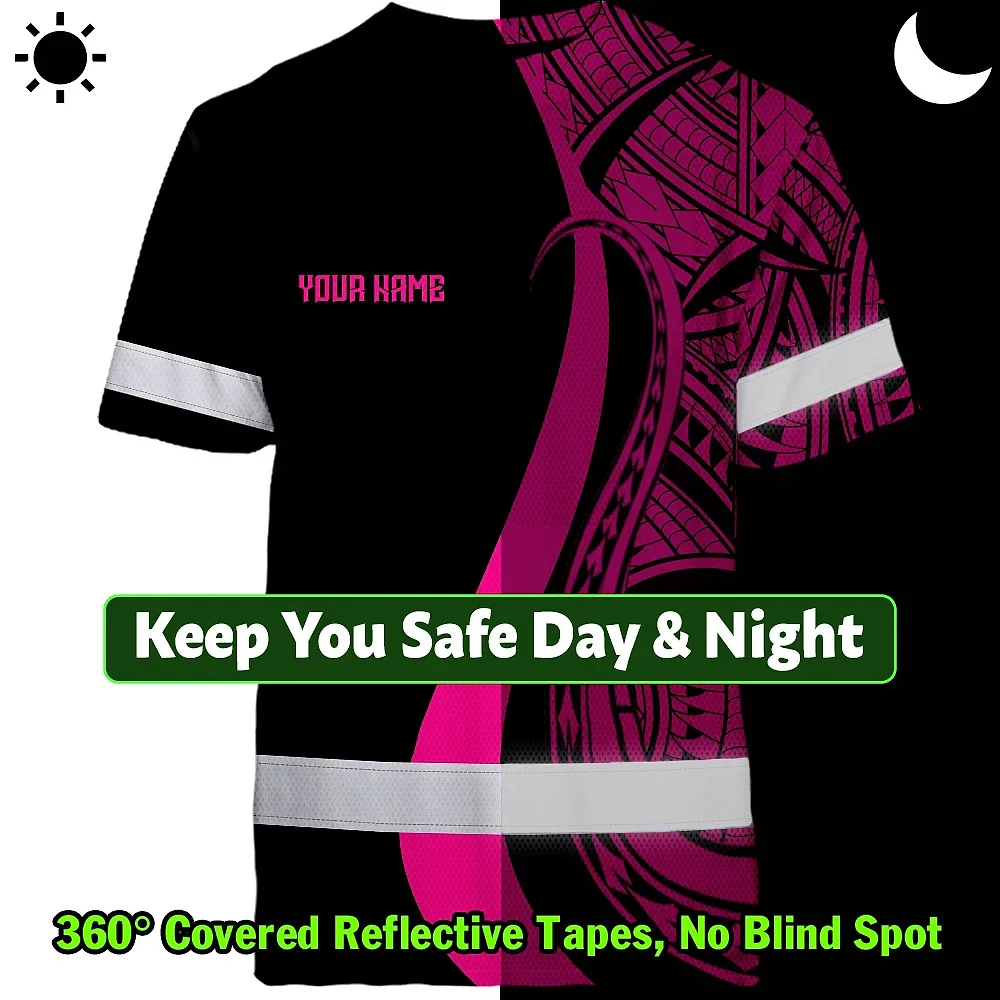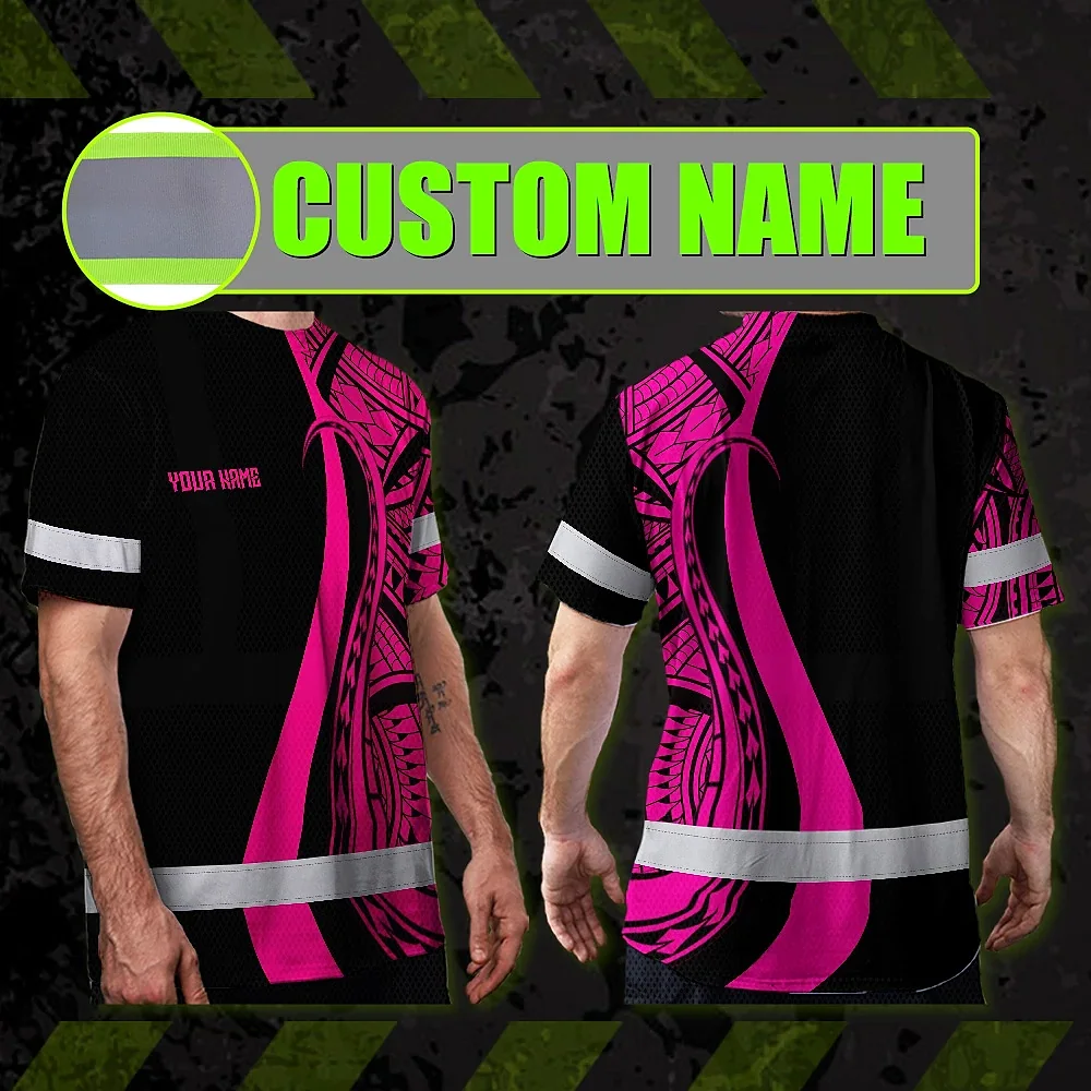 Hi Vis T Shirt Reflective Tapes Pink Neon Hawaii Custom Name Safety Workwear For Workers, Truckers, Operators