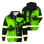 Hi Vis Zip Hoodie Reflective Green Neon Canada Flag And Skull Custom Name Safety Workwear For Workers, Runners, Cyclists, Patriotic