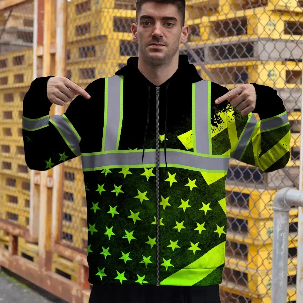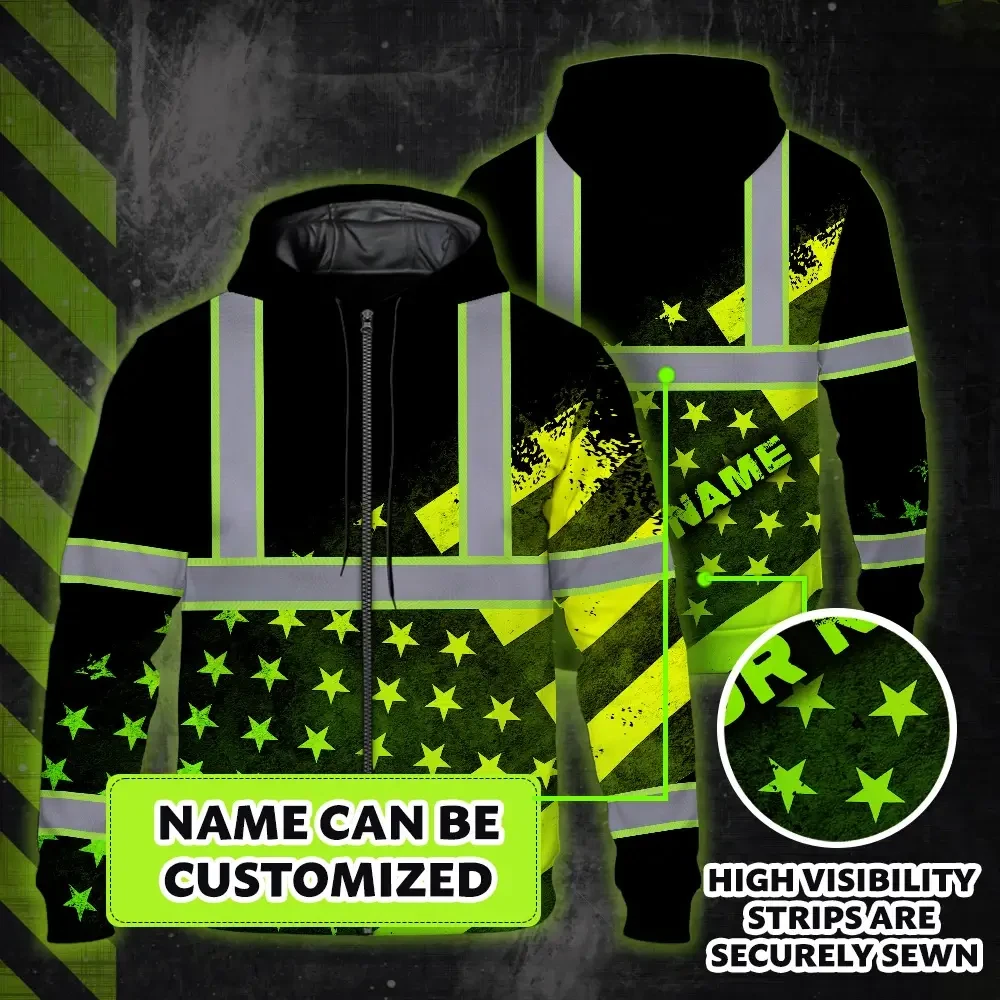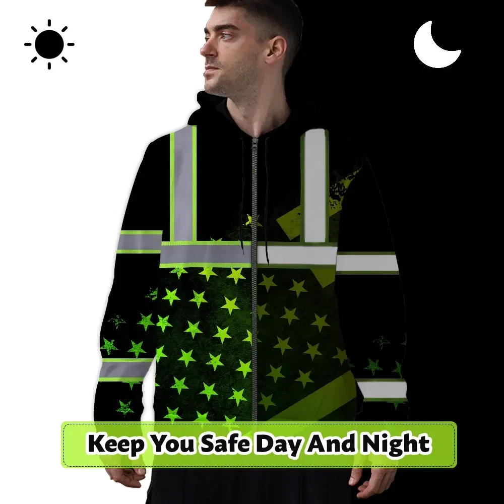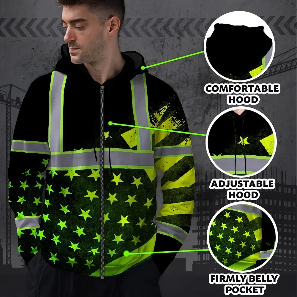 Hi Vis Zip Hoodie Reflective Gradient USA Flag Custom Name Safety Workwear