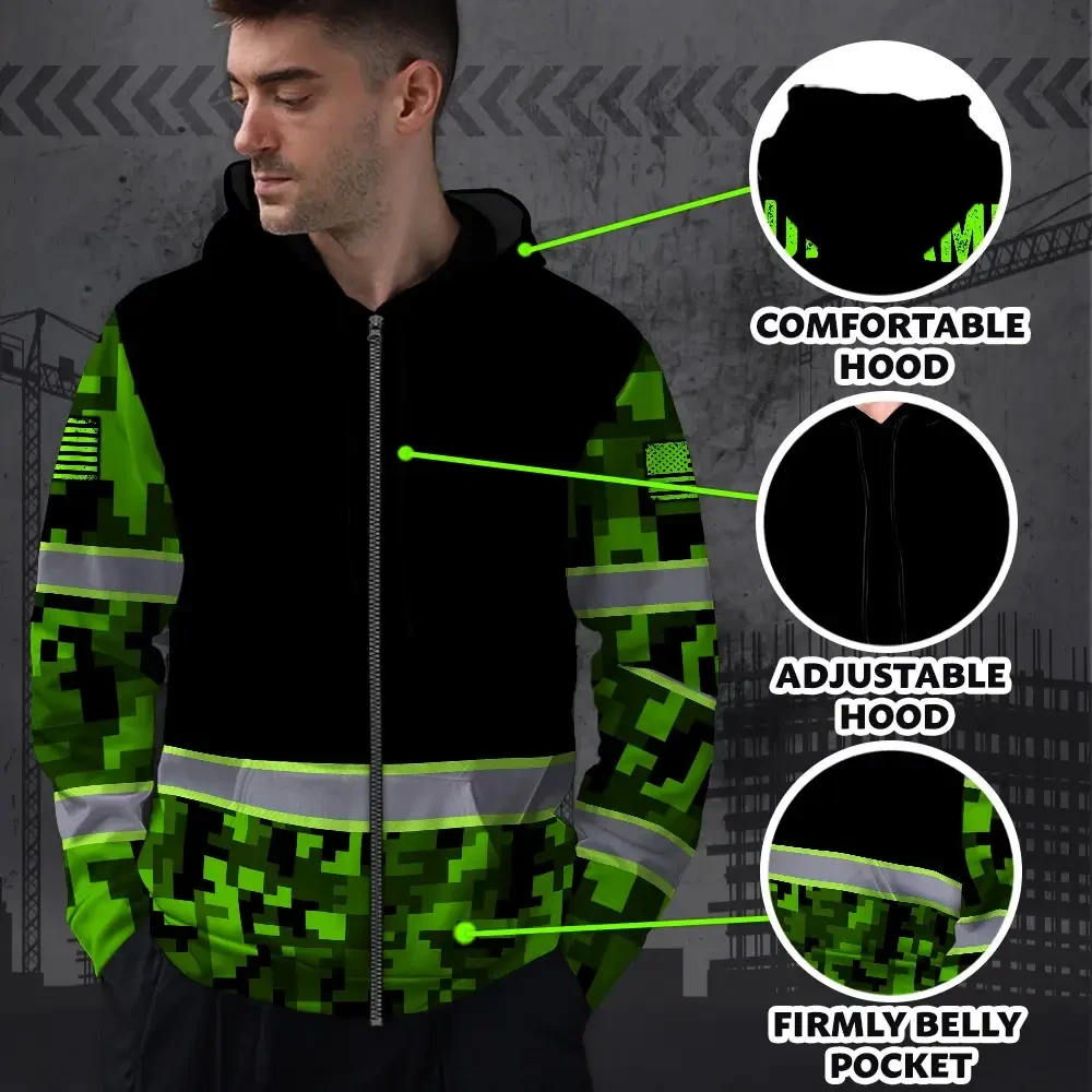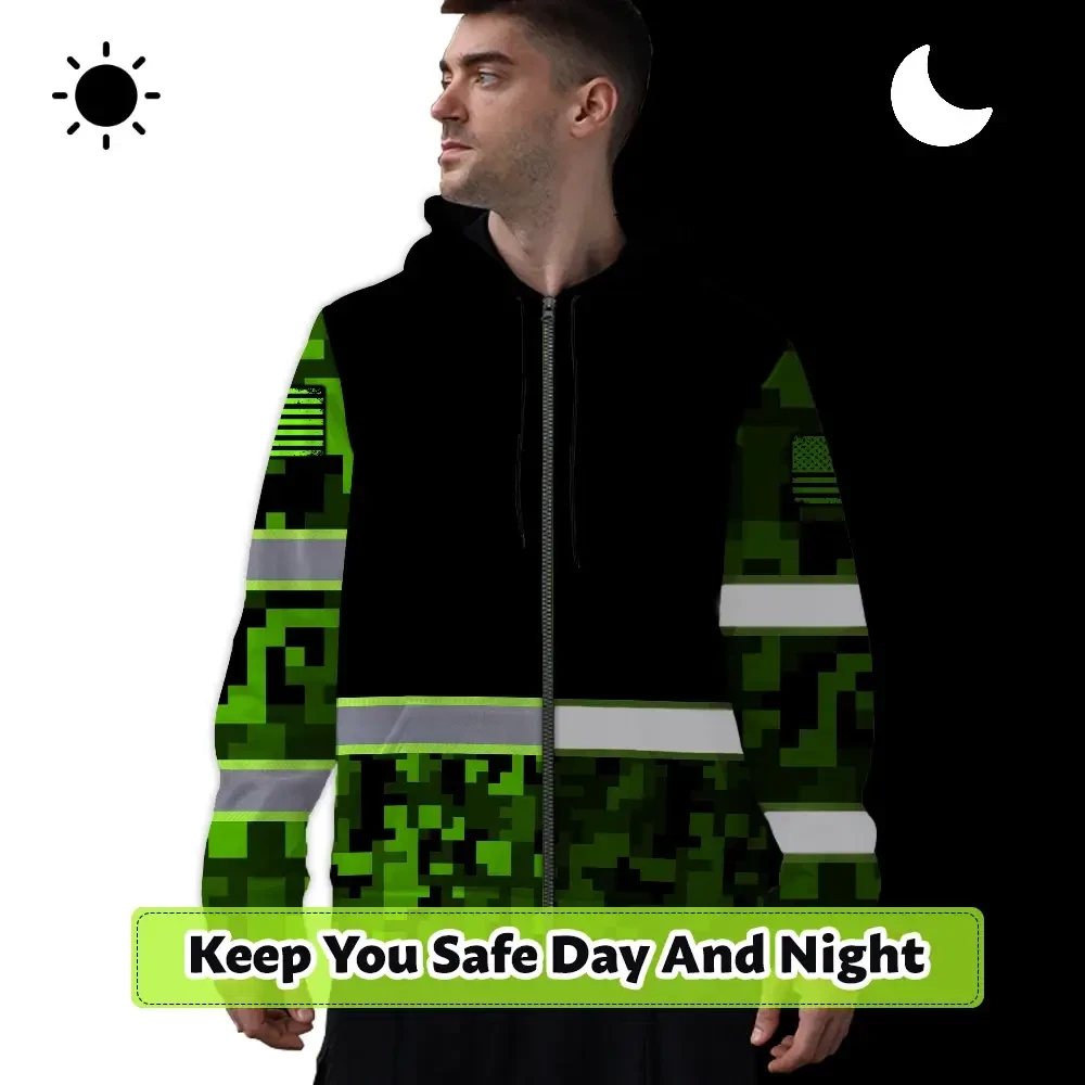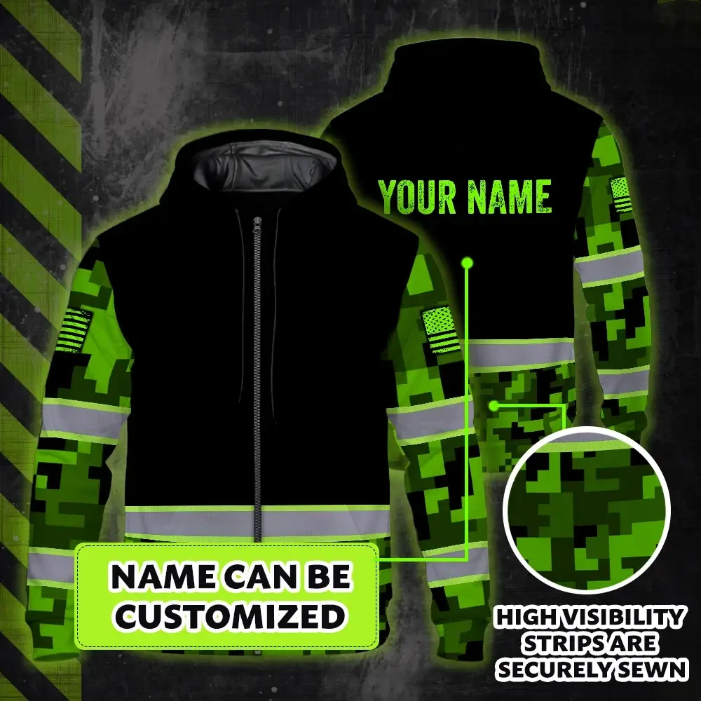 Hi Vis Zip Hoodie Reflective Green Camo Custom Name Safety Workwear