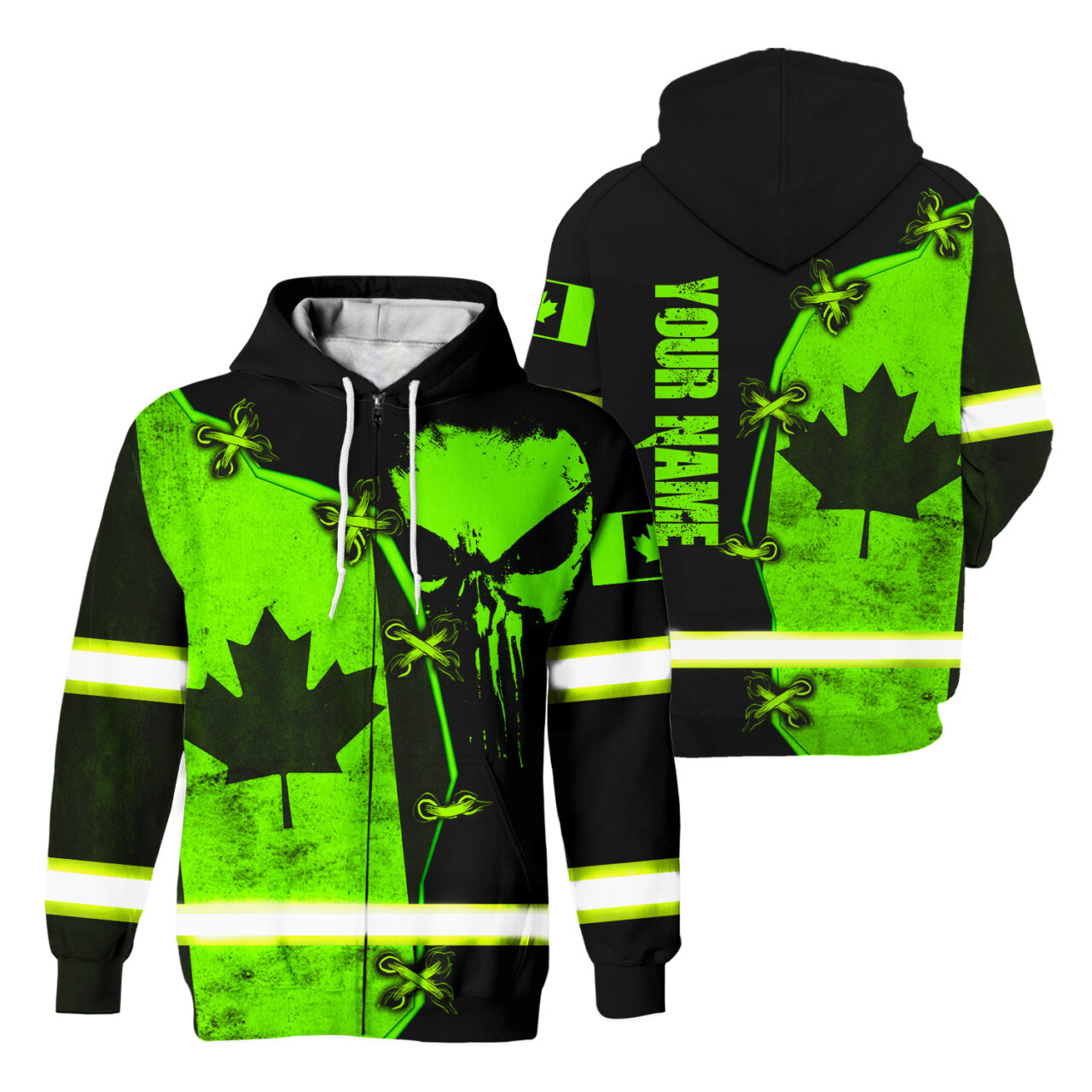 Hi Vis Zip Hoodie Reflective Green Neon Canada Flag And Skull Custom Name Safety Workwear For Workers, Runners, Cyclists, Patriotic