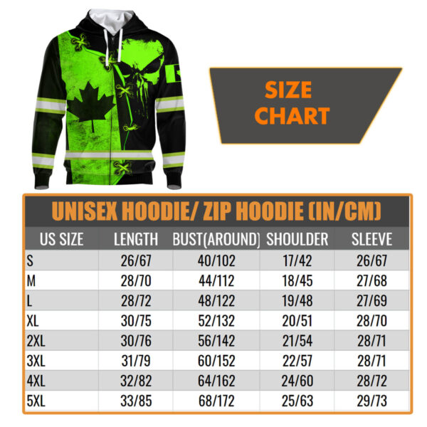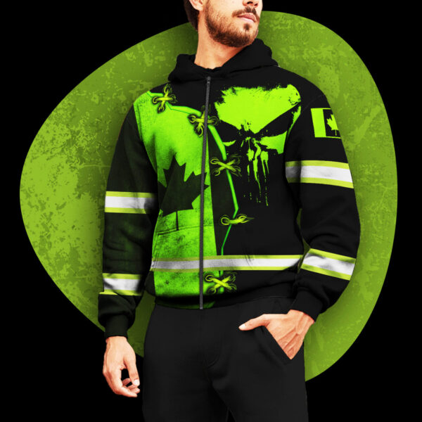 Hi Vis Zip Hoodie Reflective Green Neon Canada Flag And Skull Custom Name Safety Workwear For Workers, Runners, Cyclists, Patriotic quantity