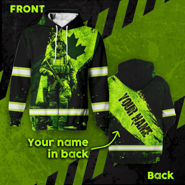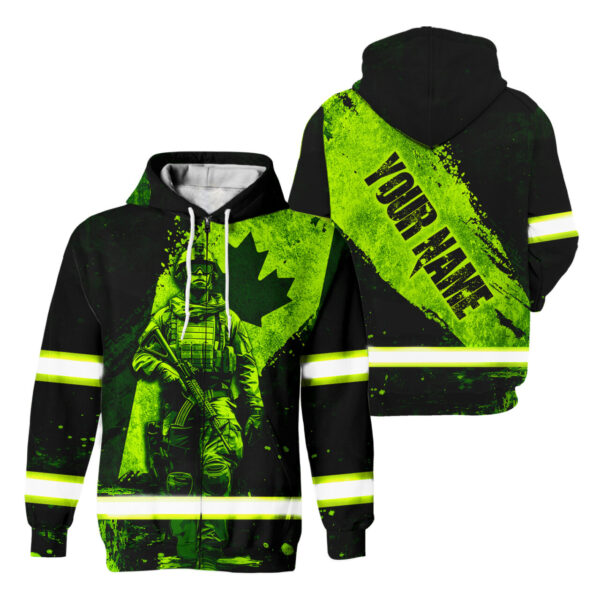 Hi Vis Zip Hoodie Reflective Green Neon Canada Flag Soldier Custom Name Safety Workwear For Workers, Runners, Cyclists, Patriotic