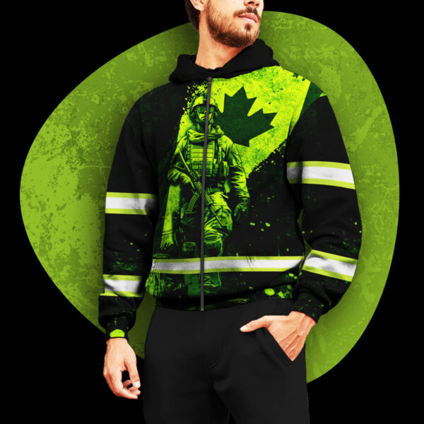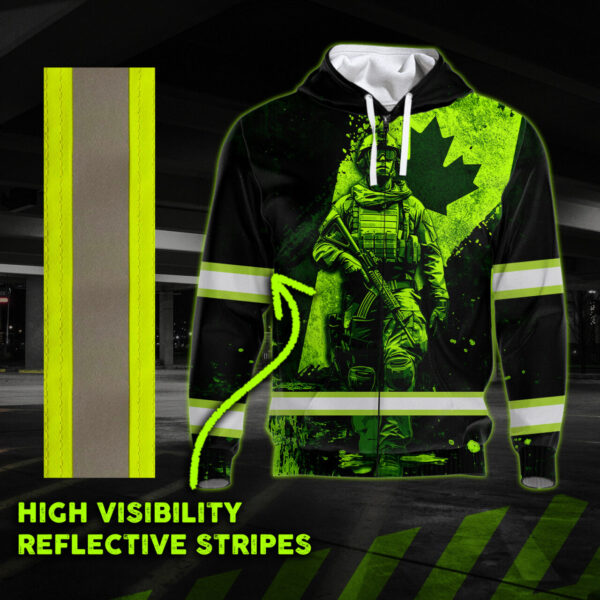 Hi Vis Zip Hoodie Reflective Green Neon Canada Flag Soldier Custom Name Safety Workwear For Workers, Runners, Cyclists, Patriotic quantity