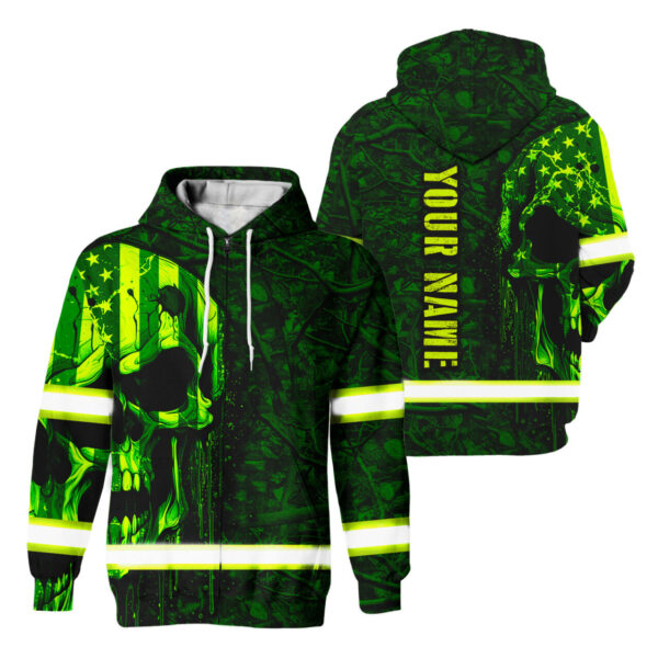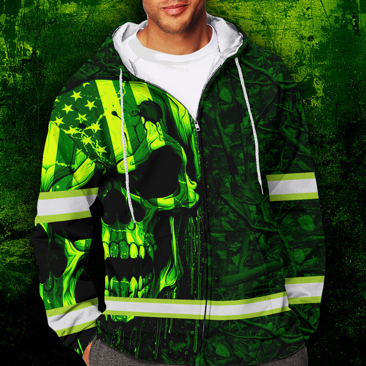 Hi Vis Zip Hoodie Reflective Green Neon USA Patriotic Skull Custom Name Safety Workwear For Workers, Runners, Cyclists, Patriotic