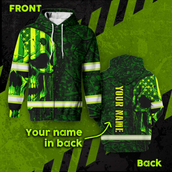 Hi Vis Zip Hoodie Reflective Green Neon Hunting Camo Skull Custom Name Safety Workwear For Workers, Runners, Cyclists, Patriotic