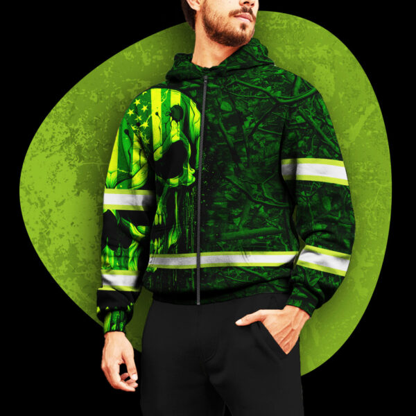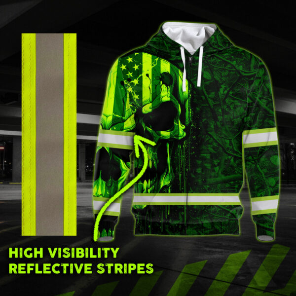 Hi Vis Zip Hoodie Reflective Green Neon Hunting Camo Skull Custom Name Safety Workwear For Workers, Runners, Cyclists, Patriotic quantity