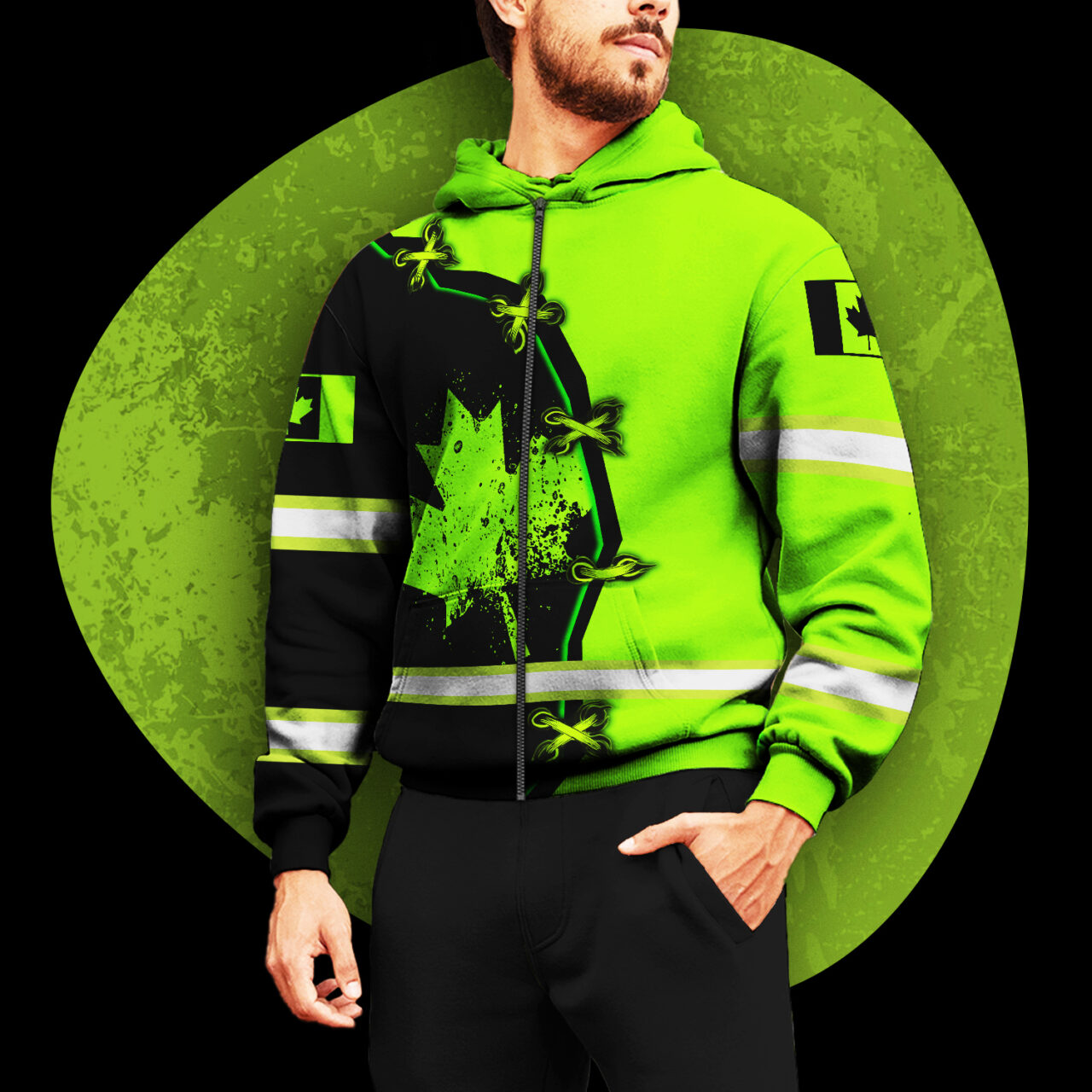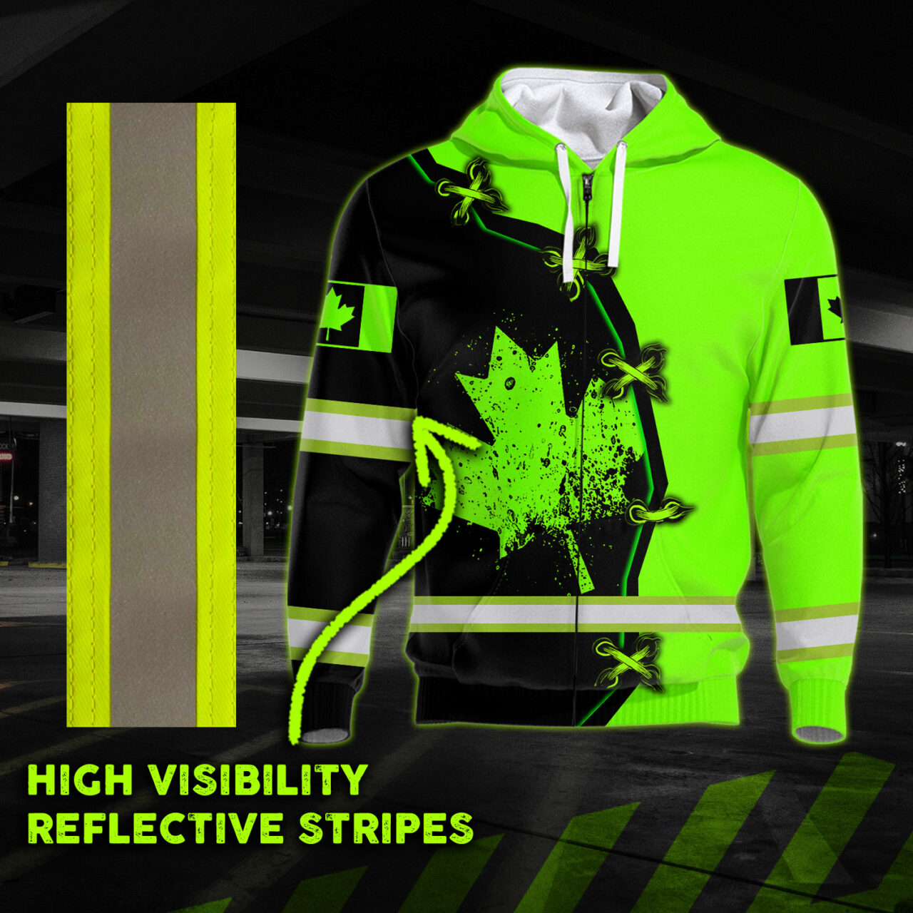 Hi Vis Zip Hoodie Reflective Green Neon Scratch Canada Flag Custom Name Safety Workwear For Workers, Runners, Cyclists, Patriotic