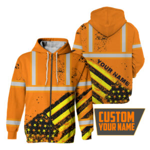 High Visibility Zip Hoodie Reflective Orange US Flag Custom Name And Logo Safety Workwear