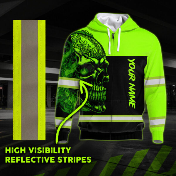 Hi Vis Zip Hoodie Reflective Green Neon Skull 3 Custom Name Safety Workwear For Workers, Runners, Cyclists, Patriotic