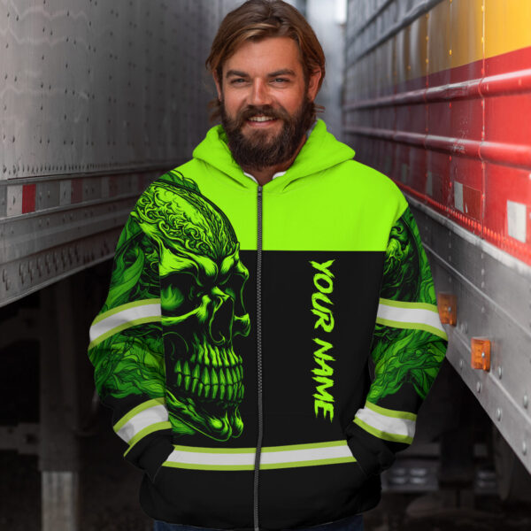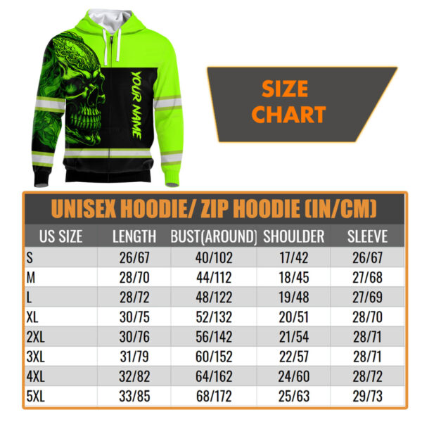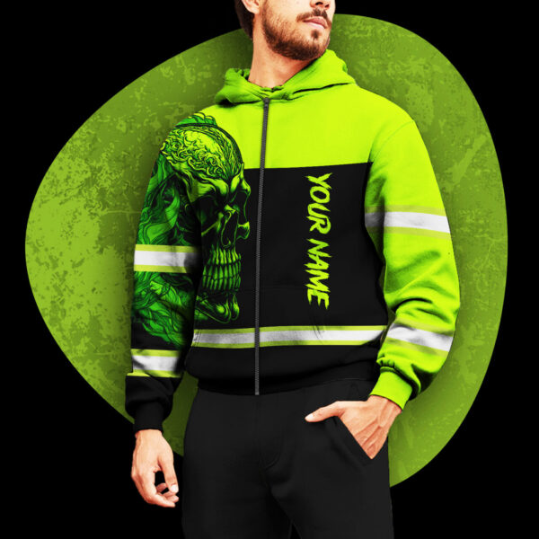 Hi Vis Zip Hoodie Reflective Green Neon Skull 3 Custom Name Safety Workwear For Workers, Runners, Cyclists, Patriotic quantity