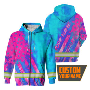 Hi Vis Zip Hoodie Reflective Blue Neon Gradient Hawaii Turtle Custom Name Safety Workwear For Workers, Runners, Cyclists, Patriotic