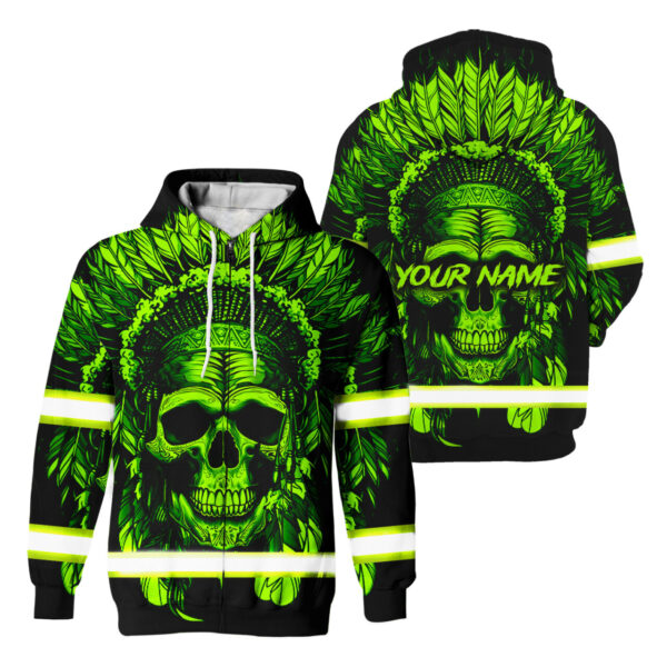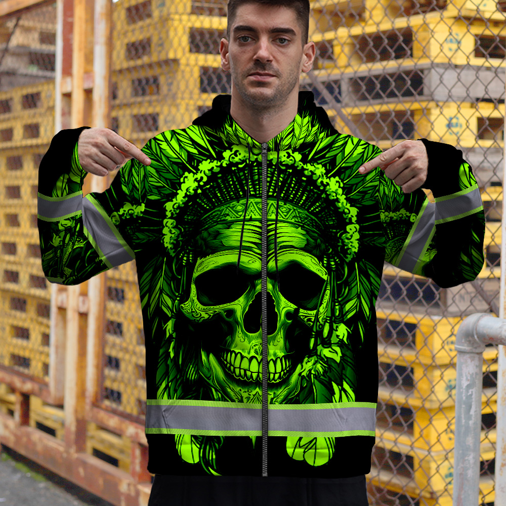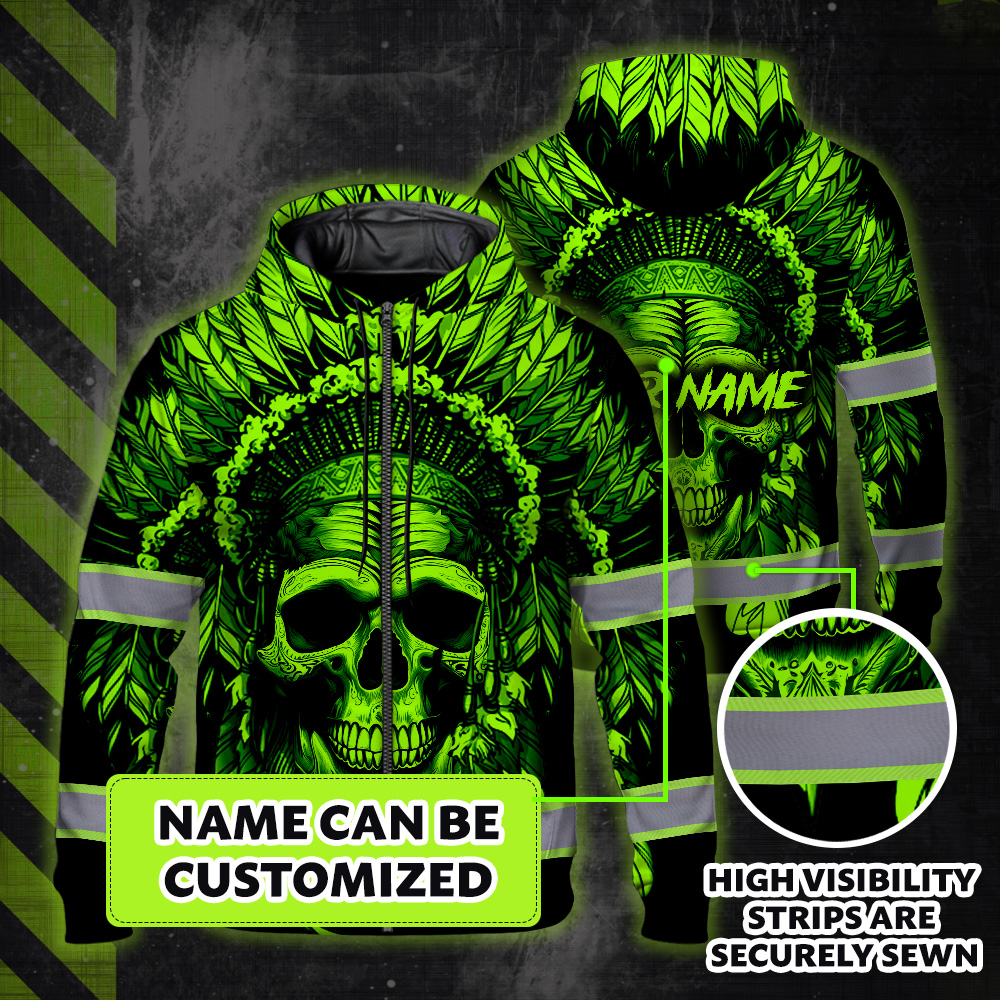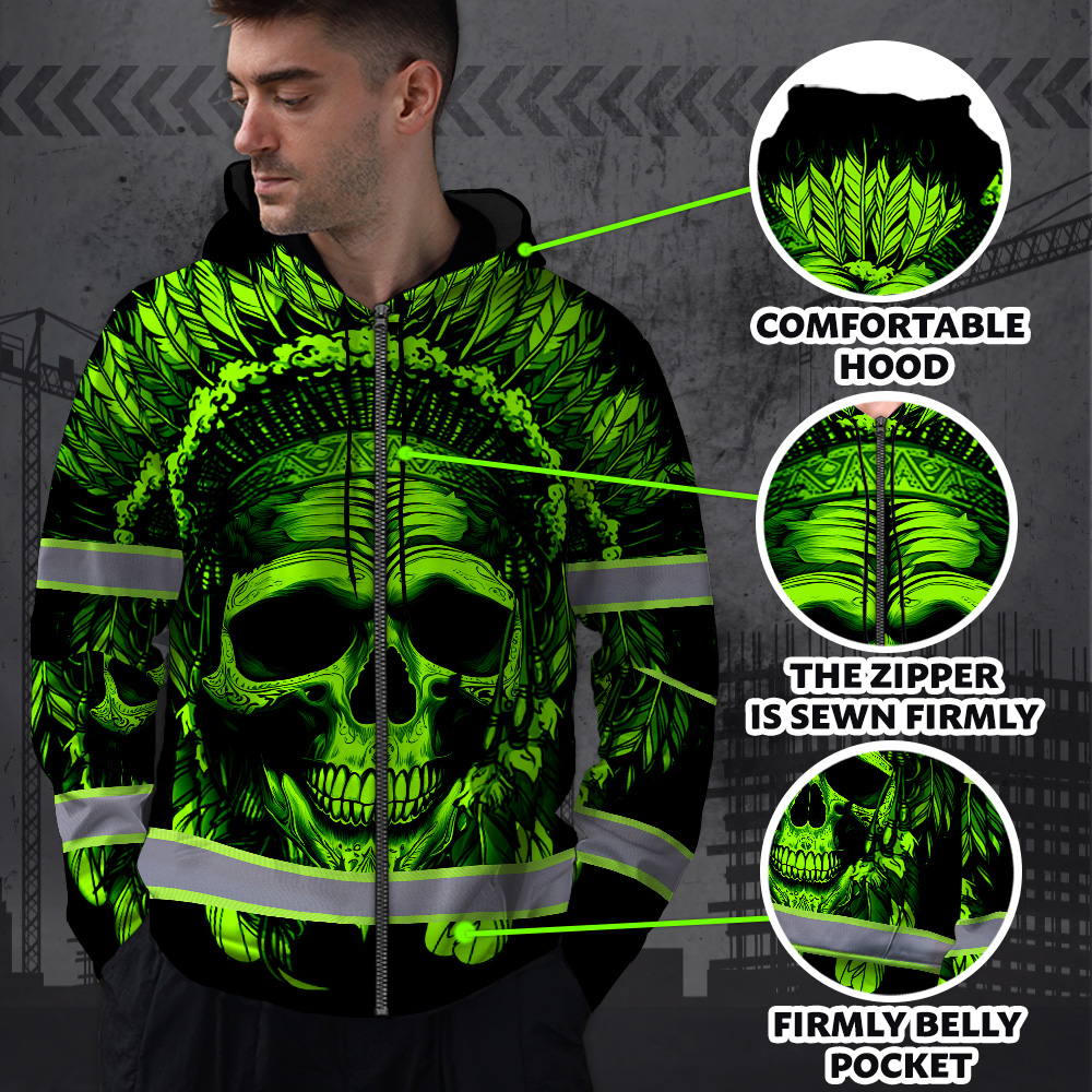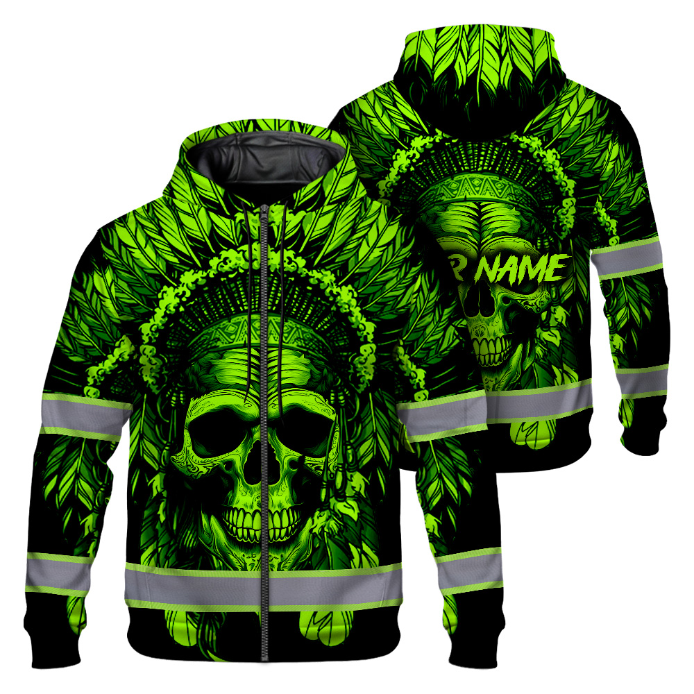 Hi Vis Zip Hoodie Reflective Green Neon Skull Native Custom Name Safety Workwear For Workers, Runners, Cyclists, Patriotic