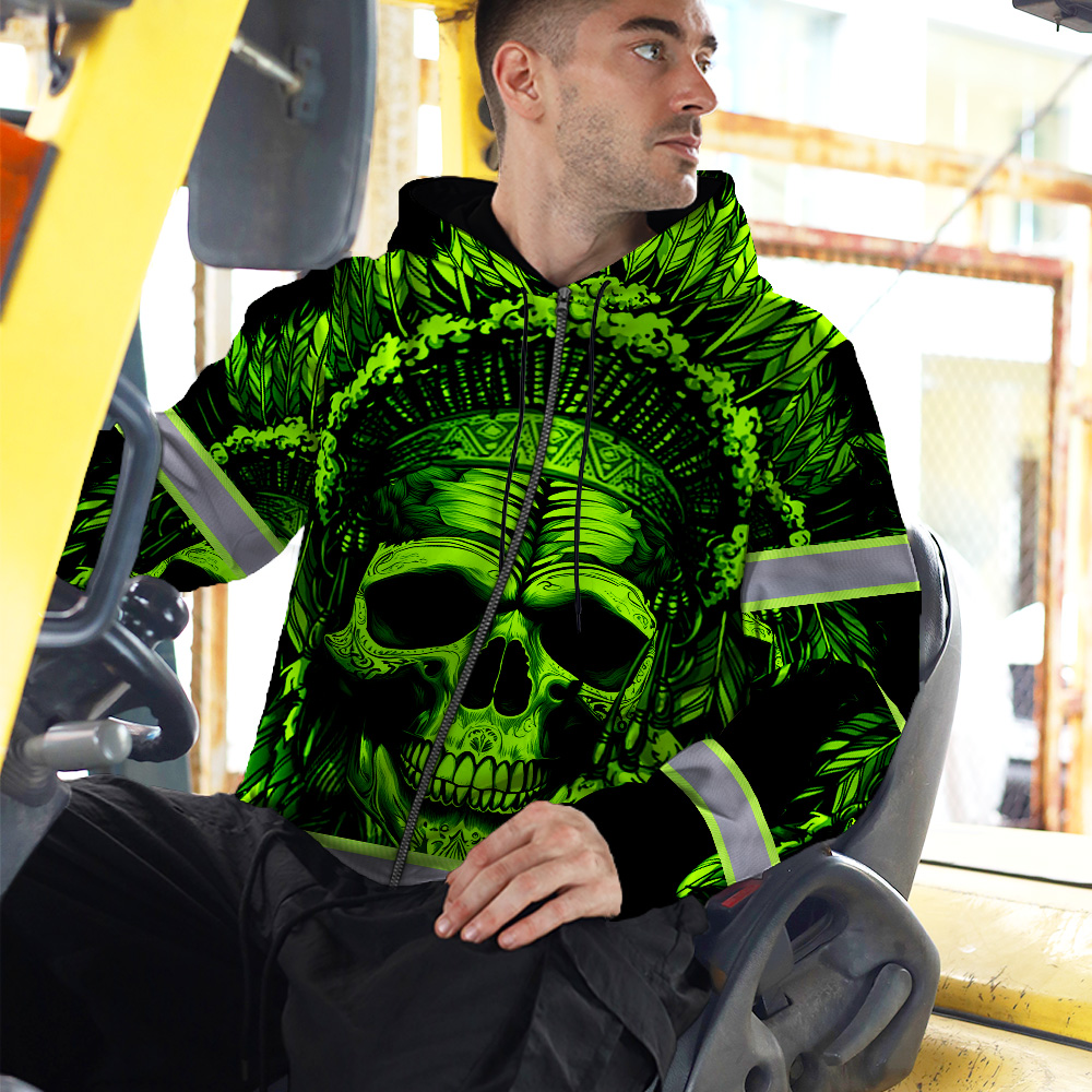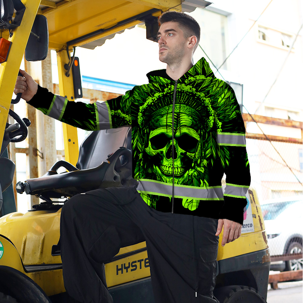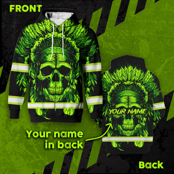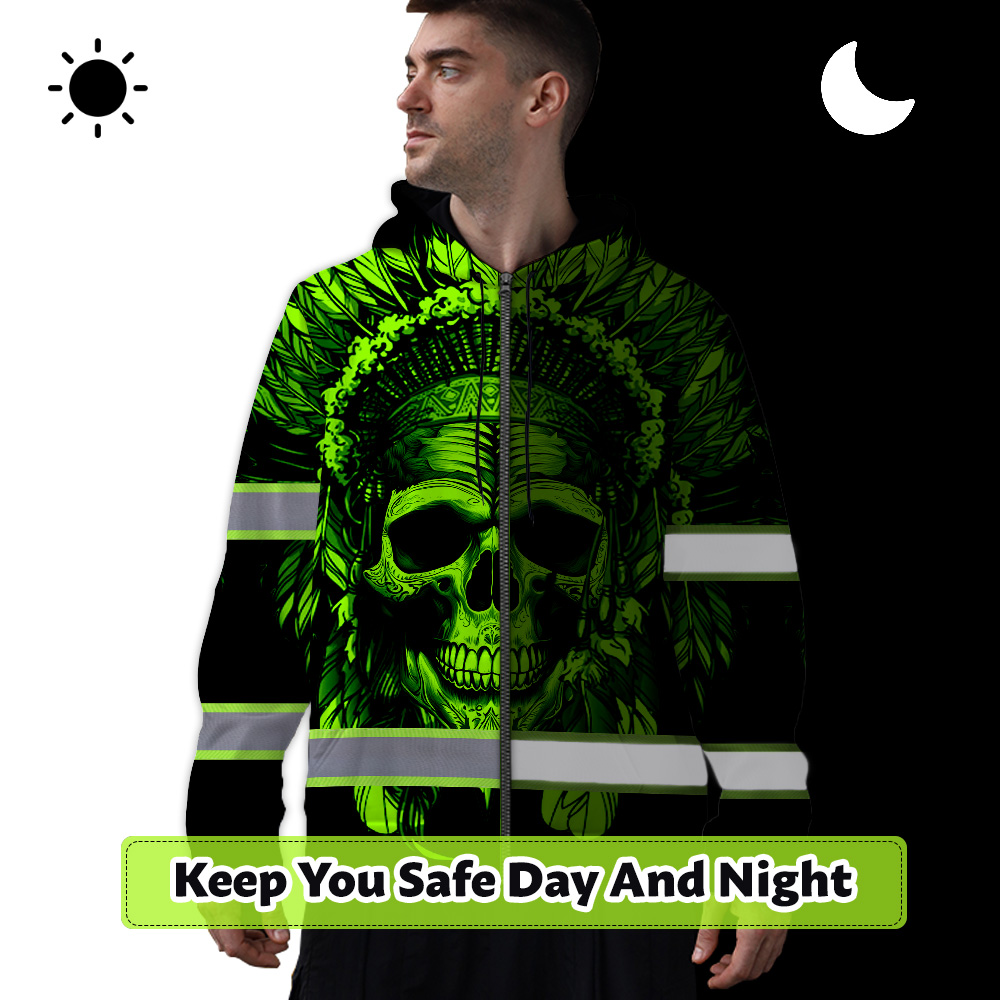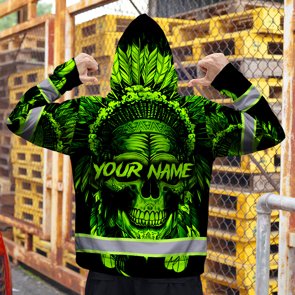 Hi Vis Zip Hoodie Reflective Green Neon Skull Native Custom Name Safety Workwear For Workers, Runners, Cyclists, Patriotic