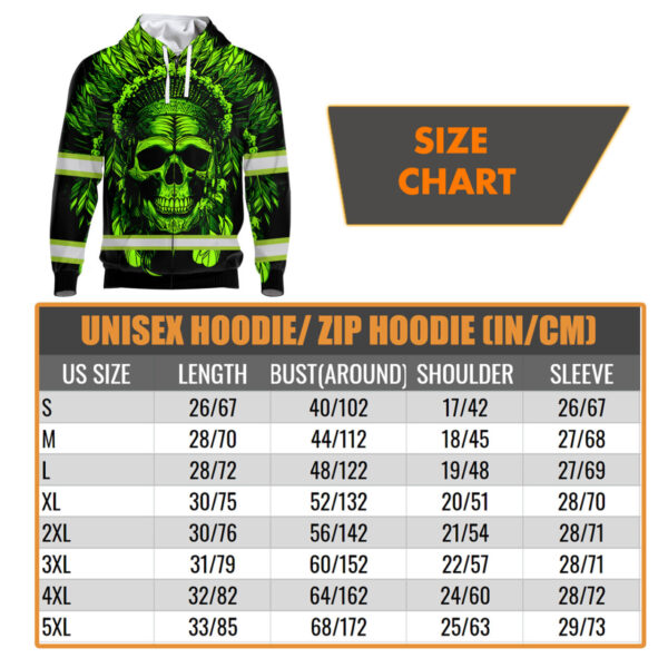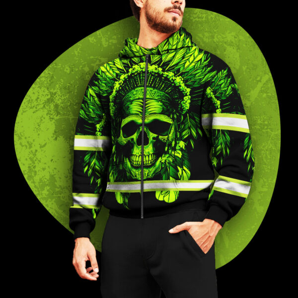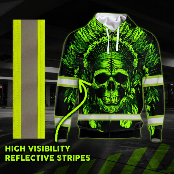 Hi Vis Zip Hoodie Reflective Green Neon Skull Native Custom Name Safety Workwear For Workers, Runners, Cyclists, Patriotic quantity