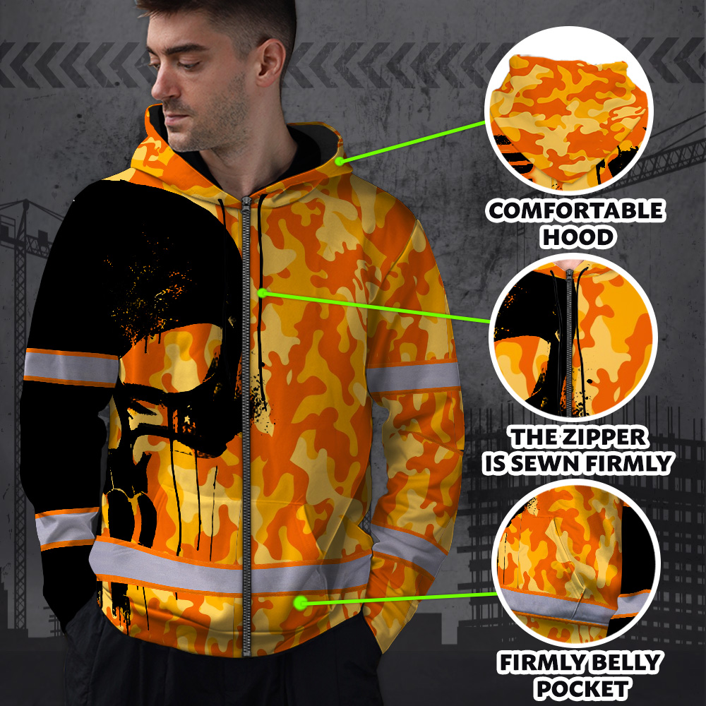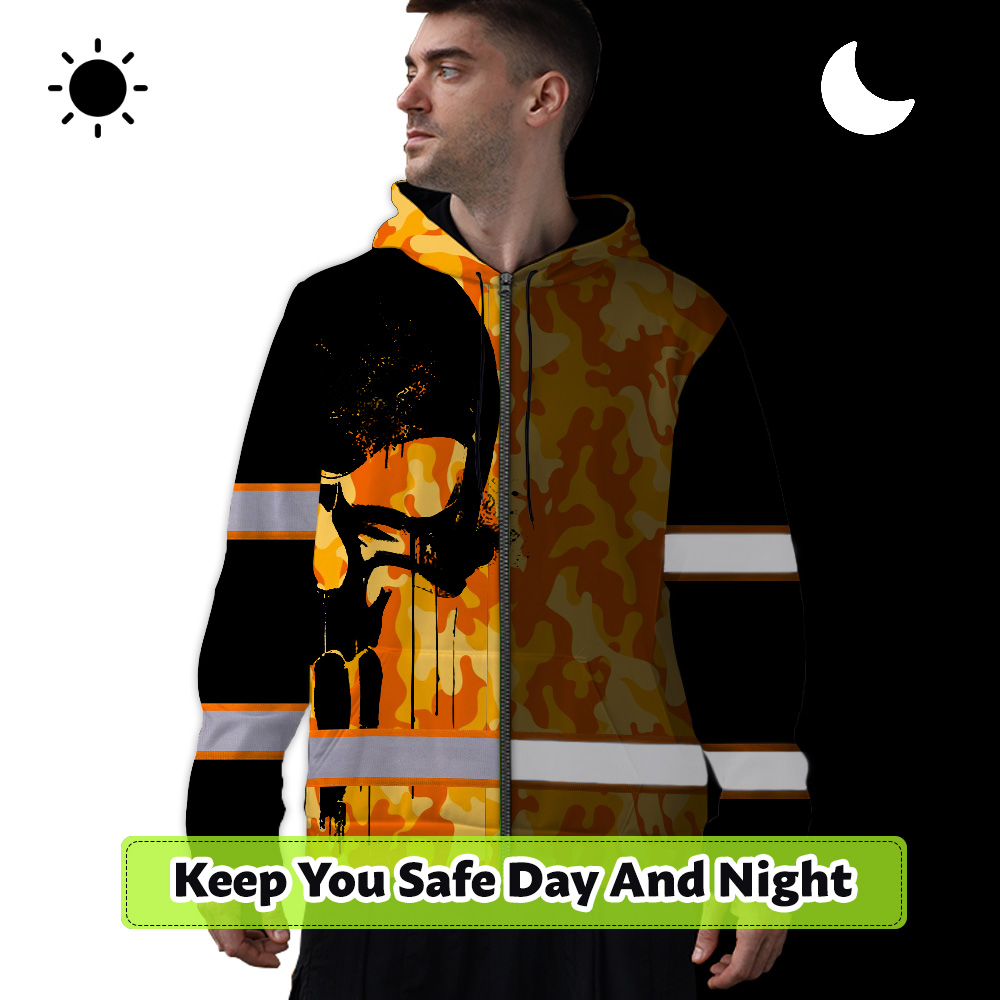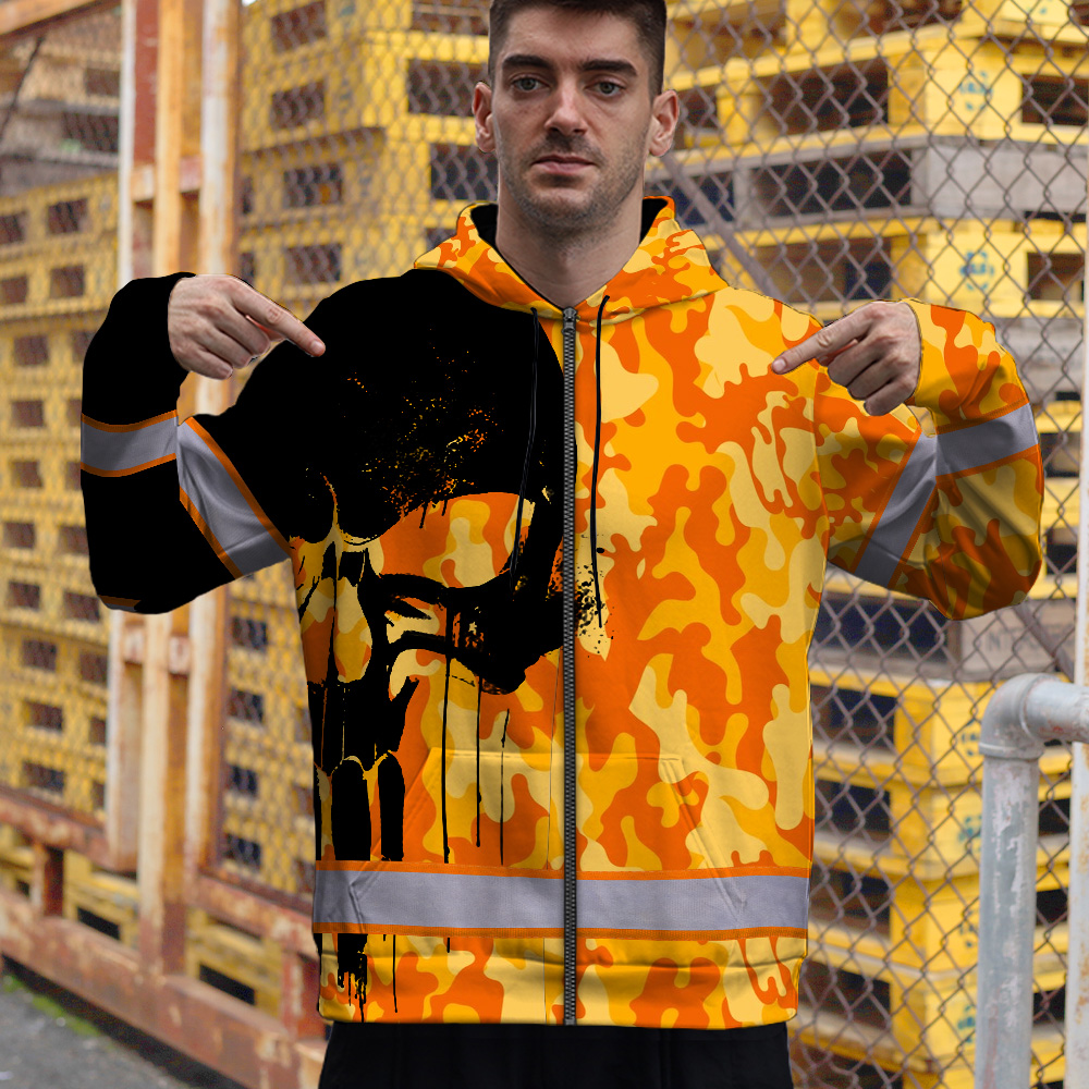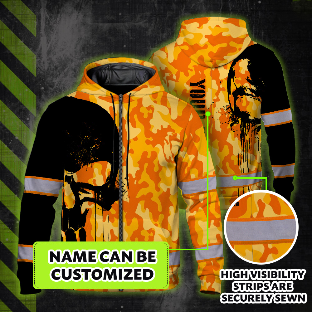 Hi Vis Zip Hoodie Reflective Orange Neon Camo Skull Custom Name Safety Workwear For Workers, Runners, Cyclists, Patriotic