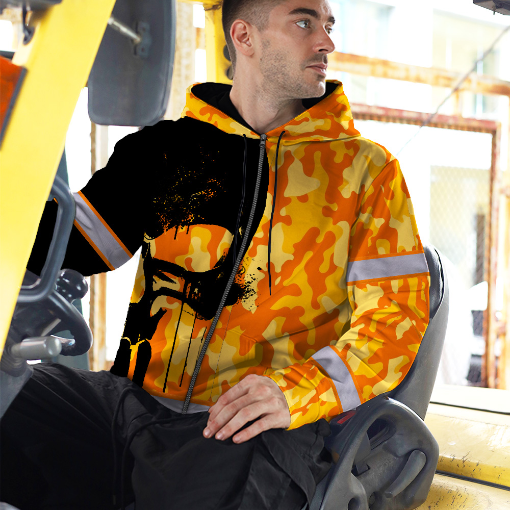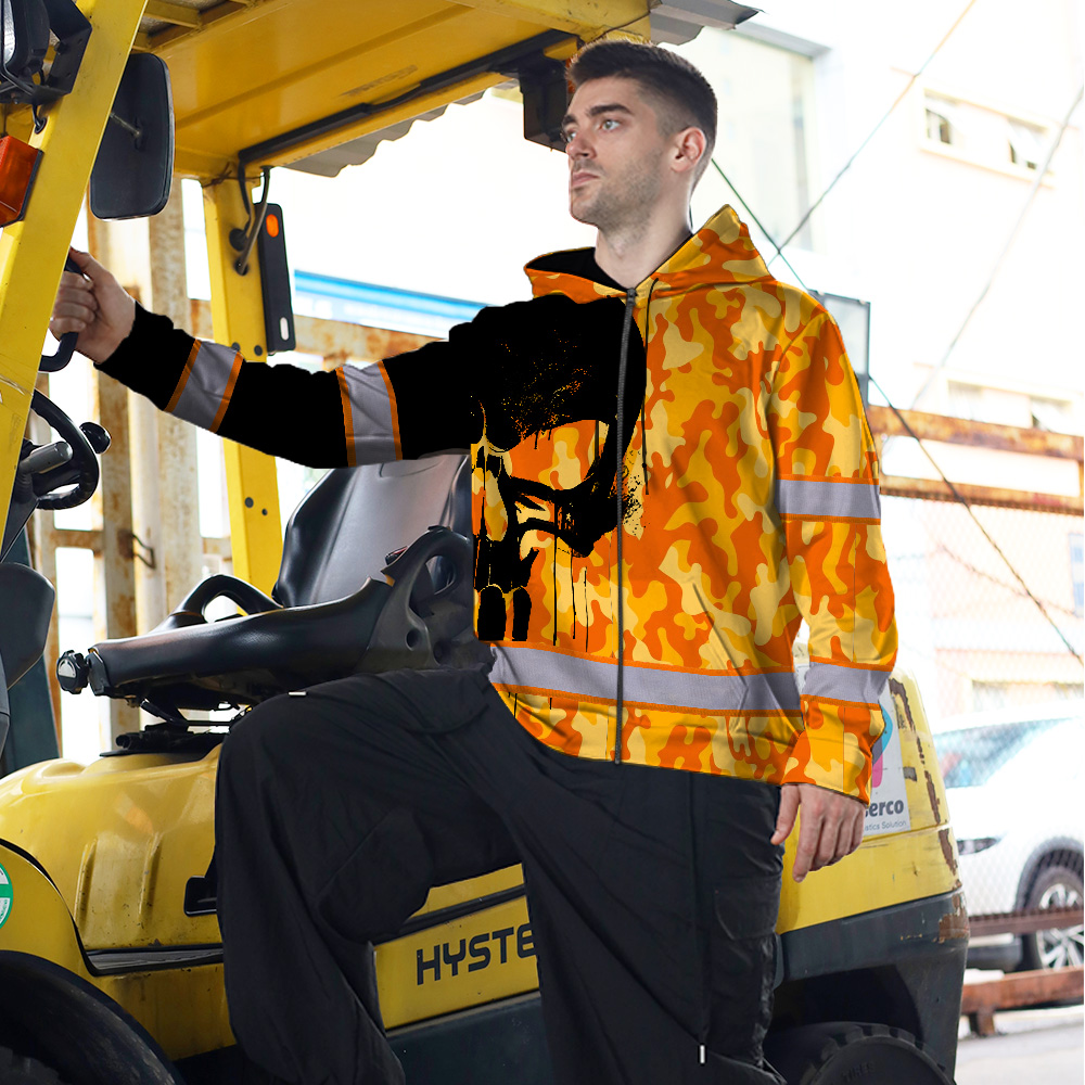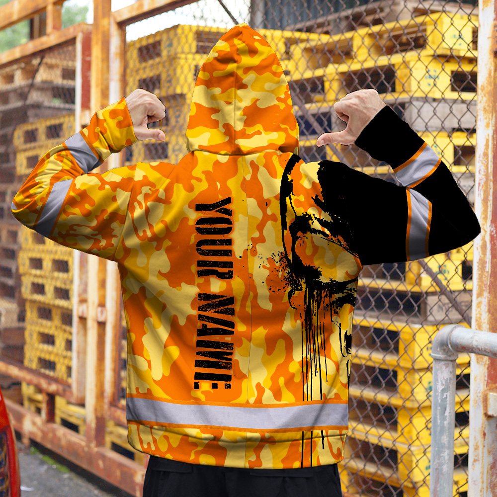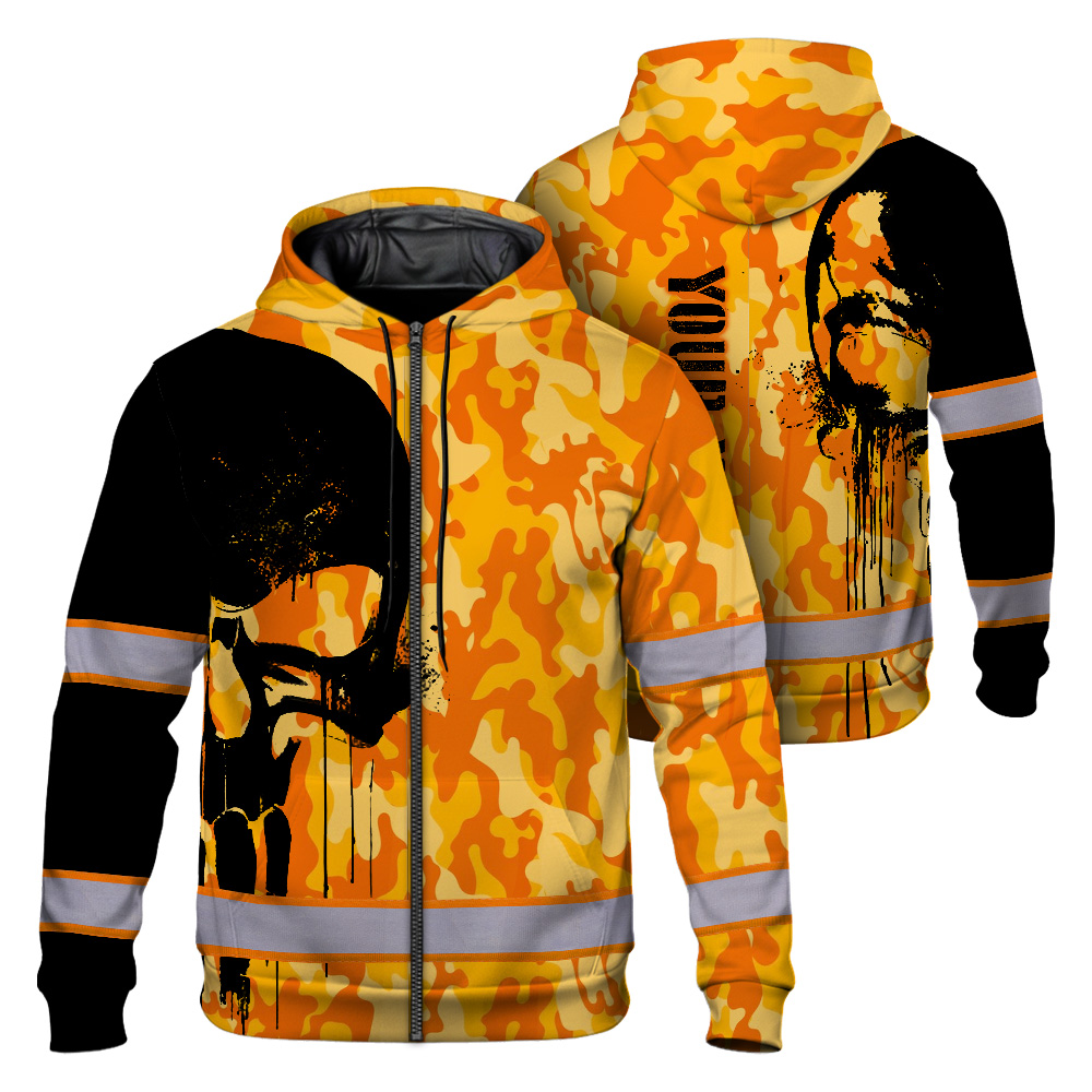 Hi Vis Zip Hoodie Reflective Orange Neon Camo Skull Custom Name Safety Workwear For Workers, Runners, Cyclists, Patriotic