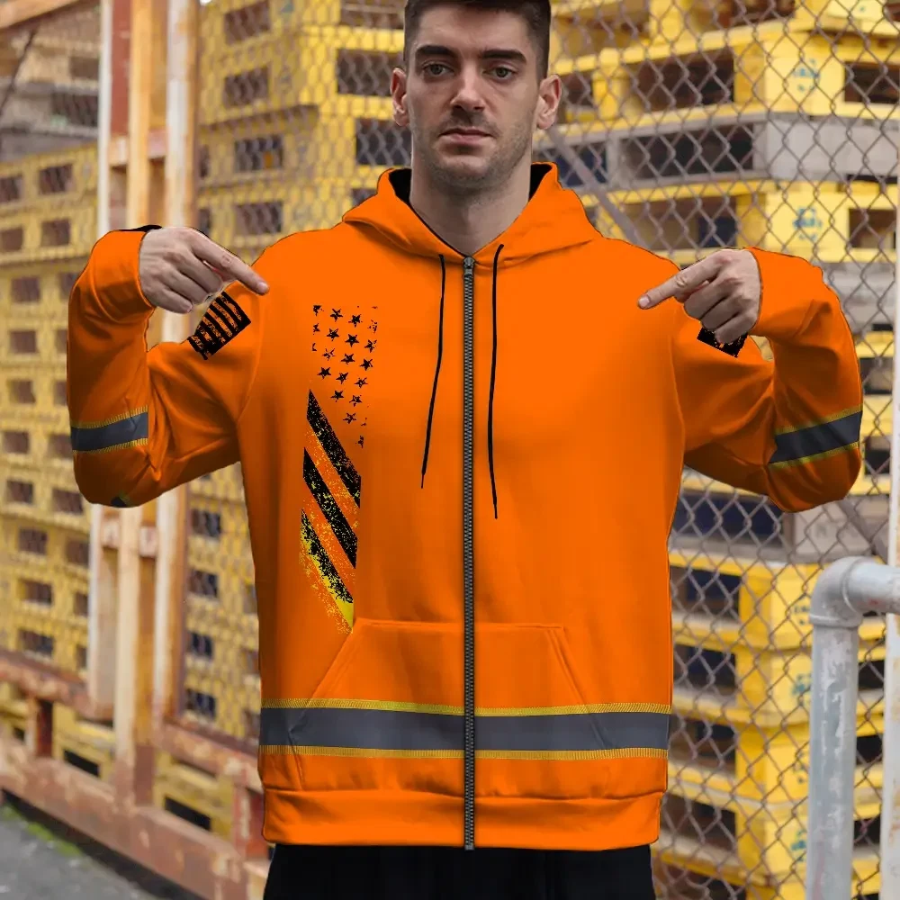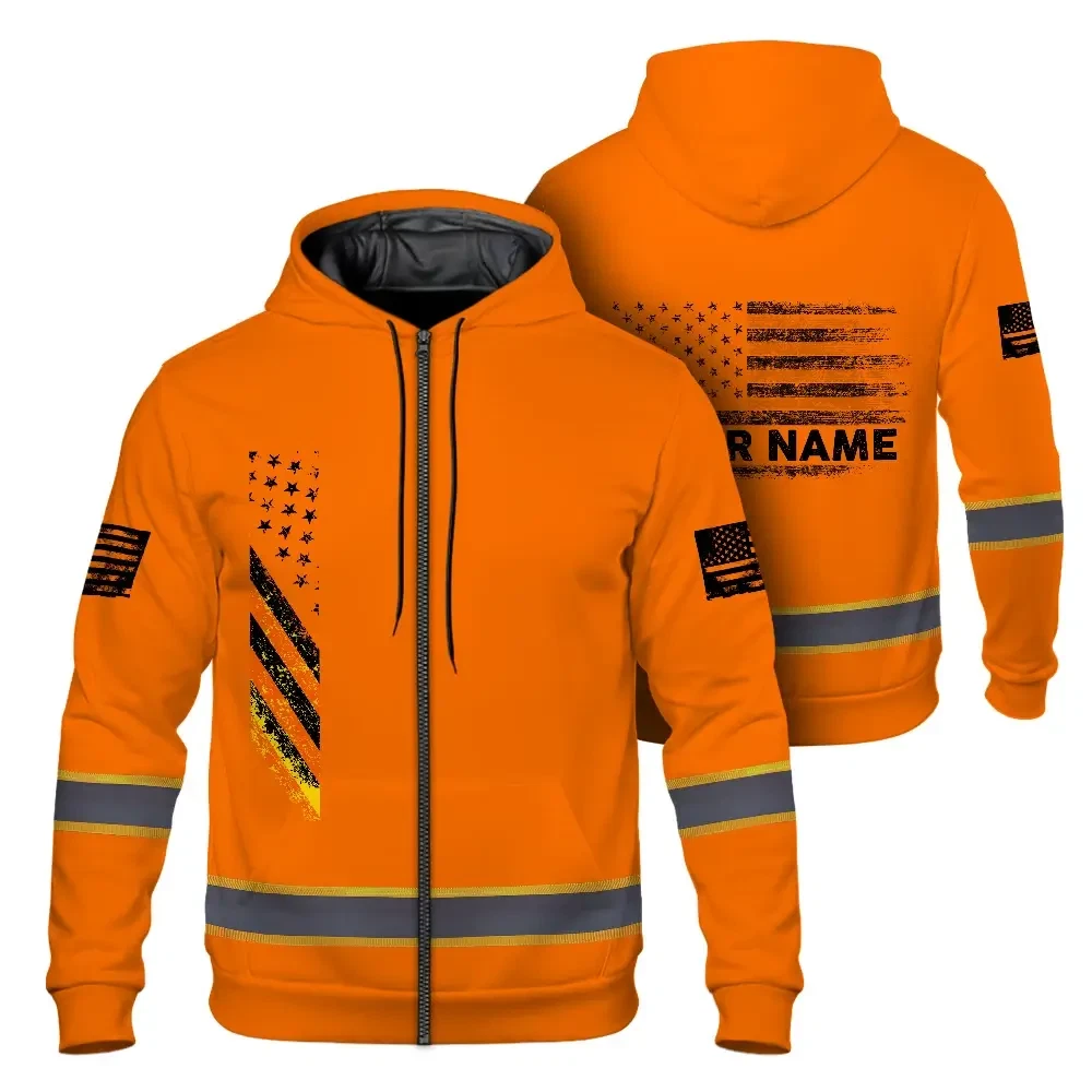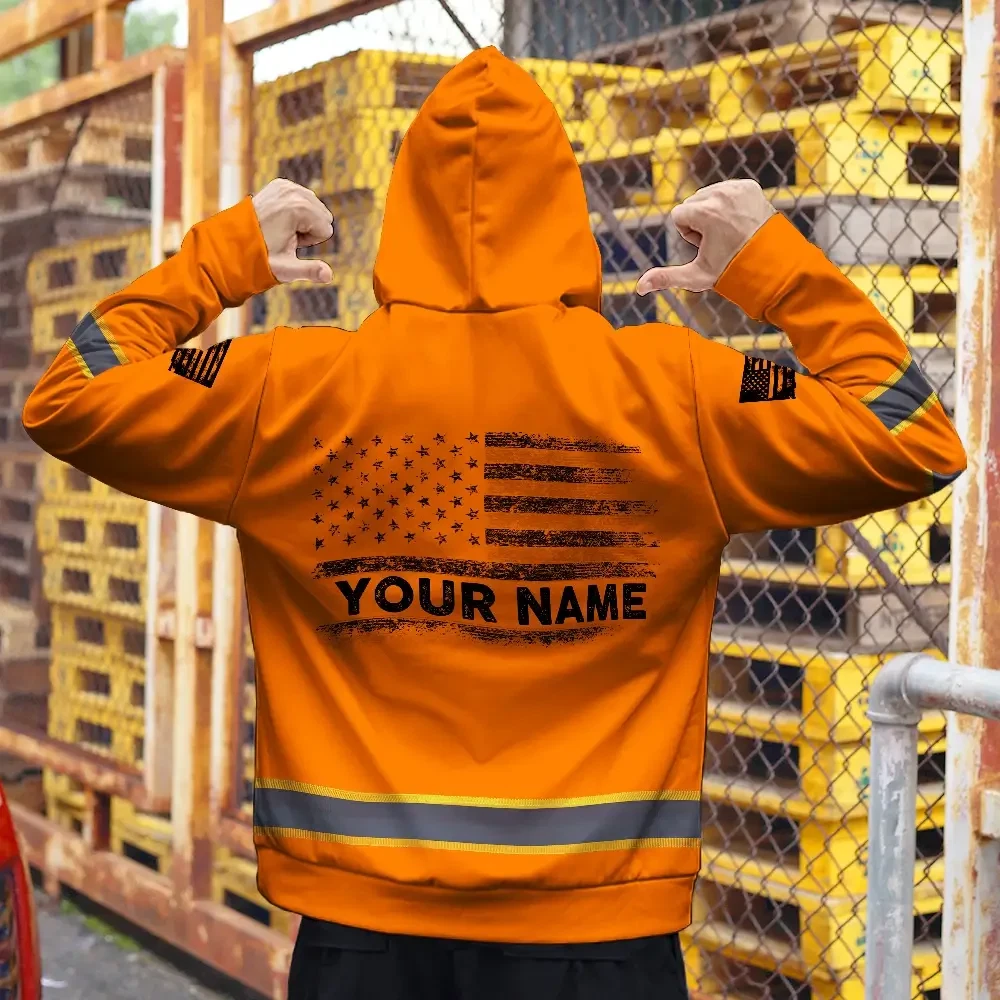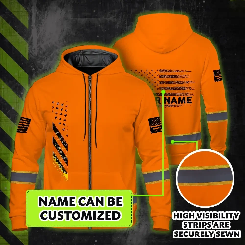 Hi Vis Zip Hoodie Reflective Orange USA Flag Custom Name Safety Workwear