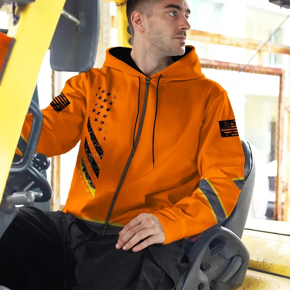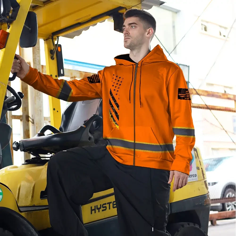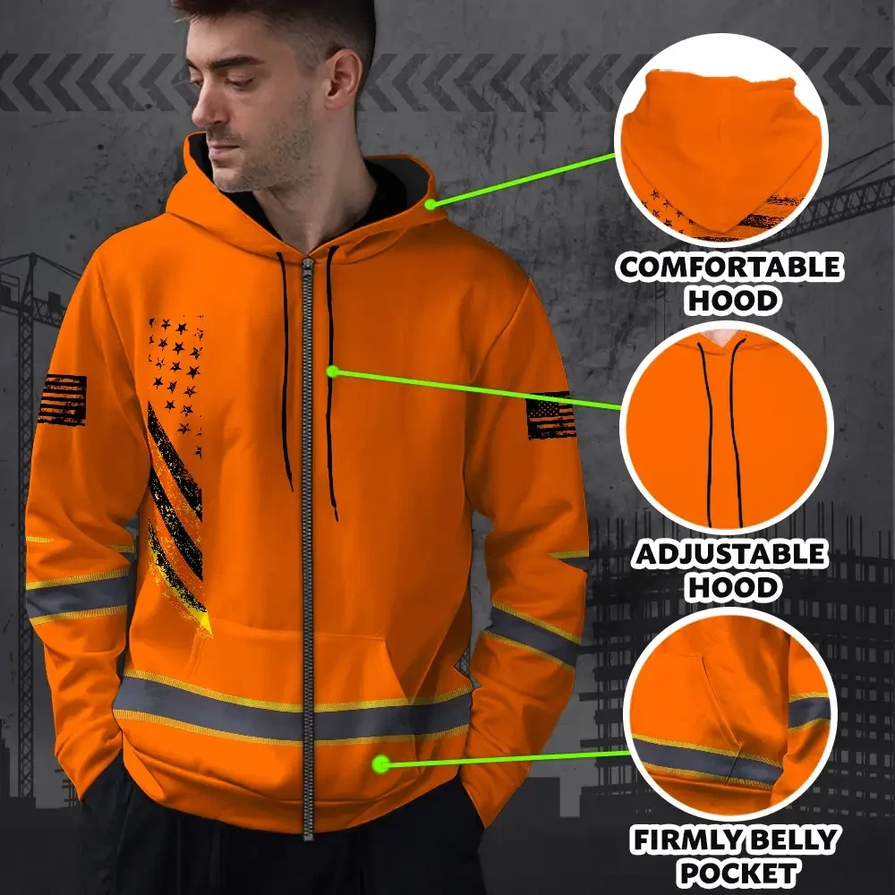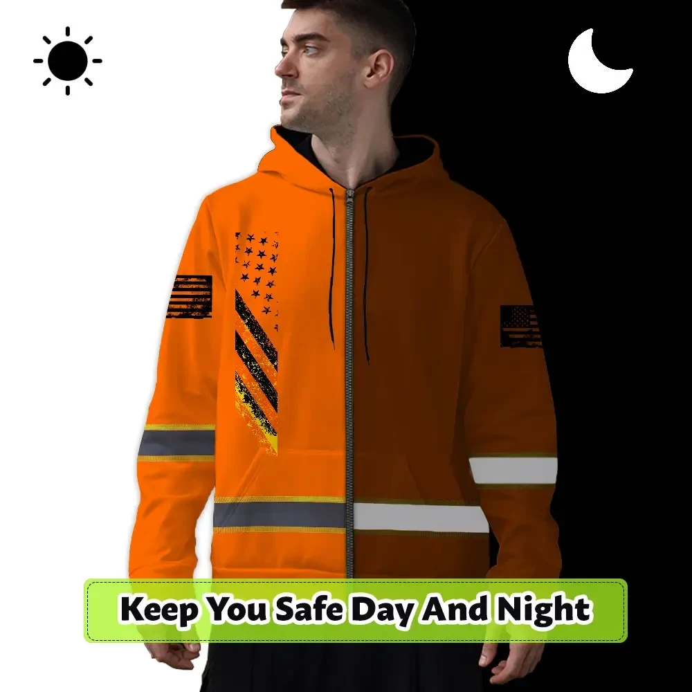 Hi Vis Zip Hoodie Reflective Orange USA Flag Custom Name Safety Workwear