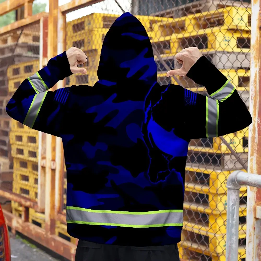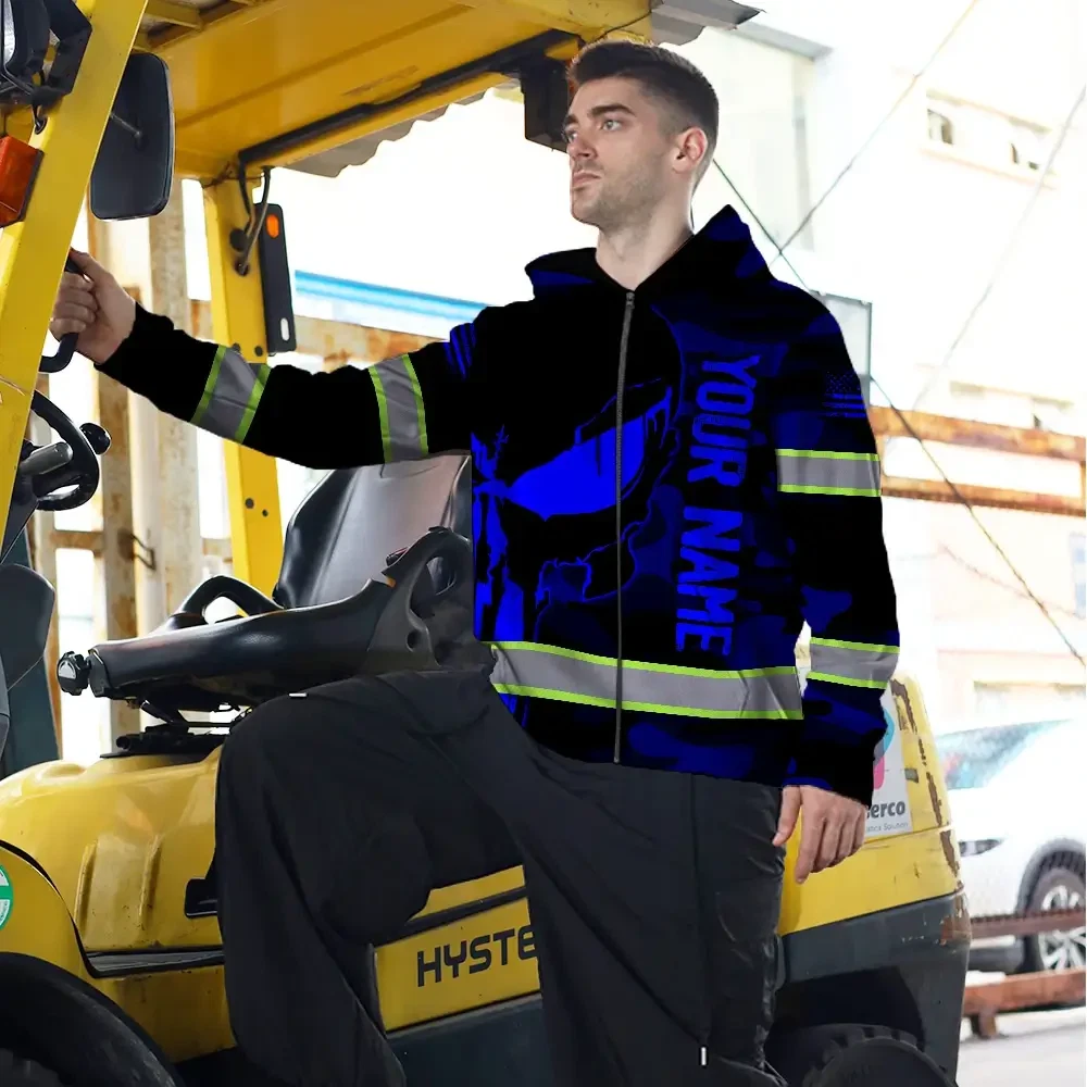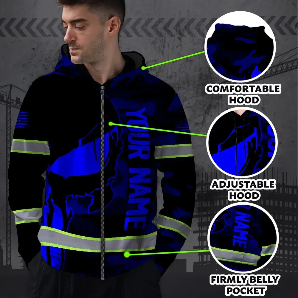 Hi Vis Zip Hoodie Reflective Skull Blue Camo Neon US Flag Custom Name Safety Workwear