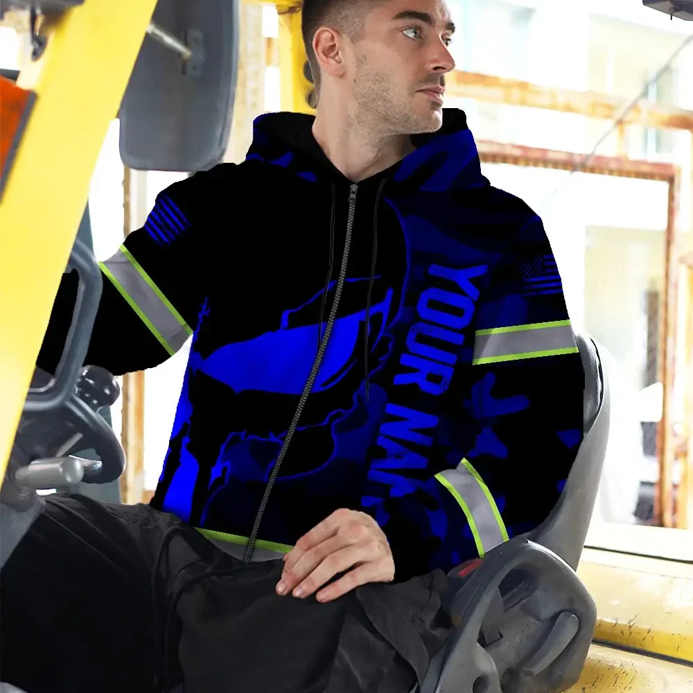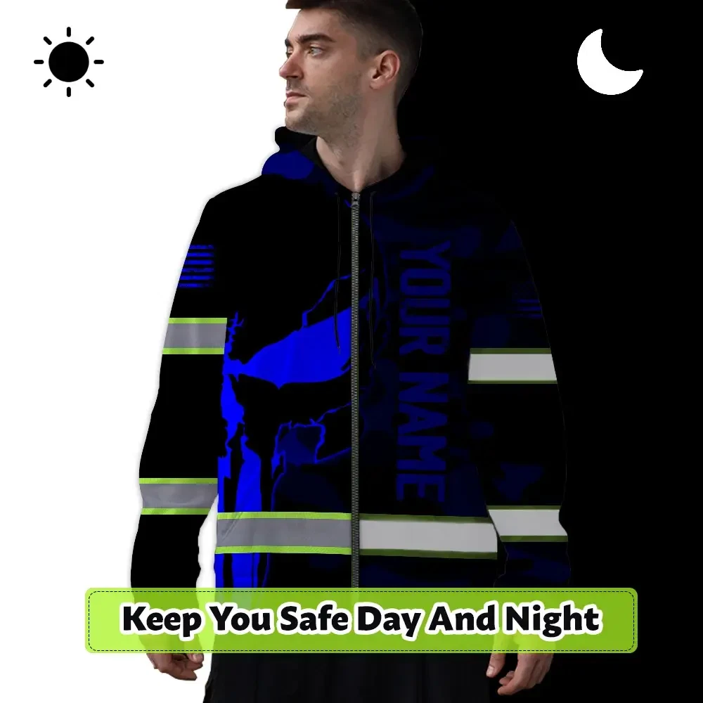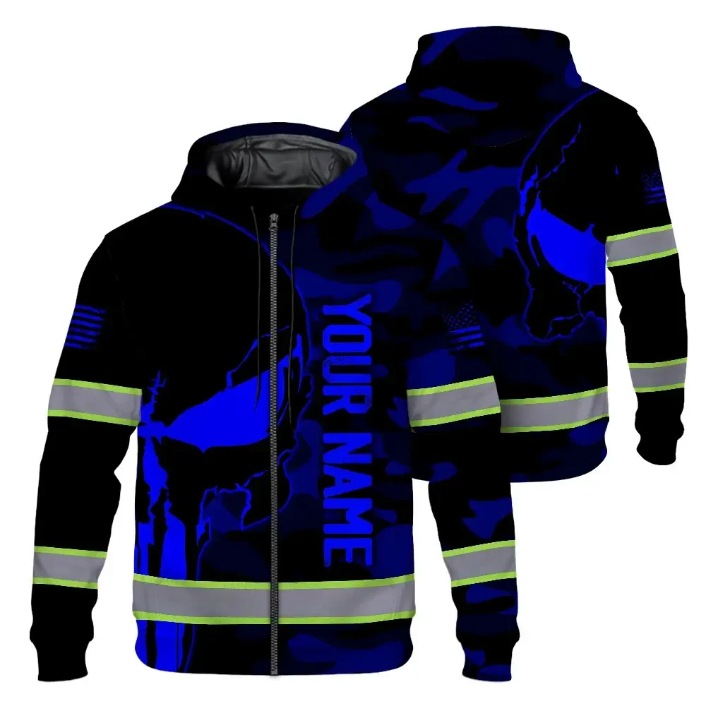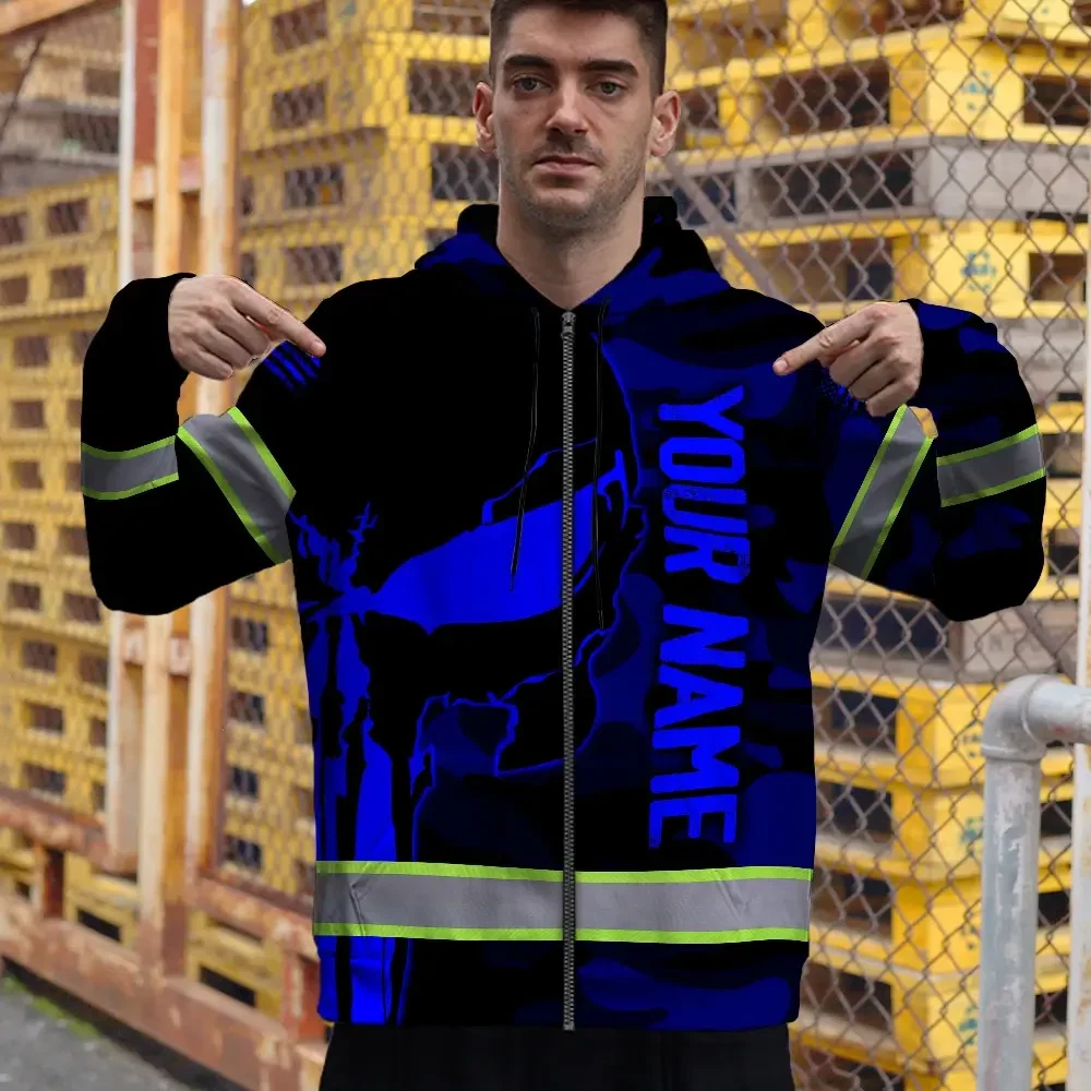 Hi Vis Zip Hoodie Reflective Skull Blue Camo Neon US Flag Custom Name Safety Workwear