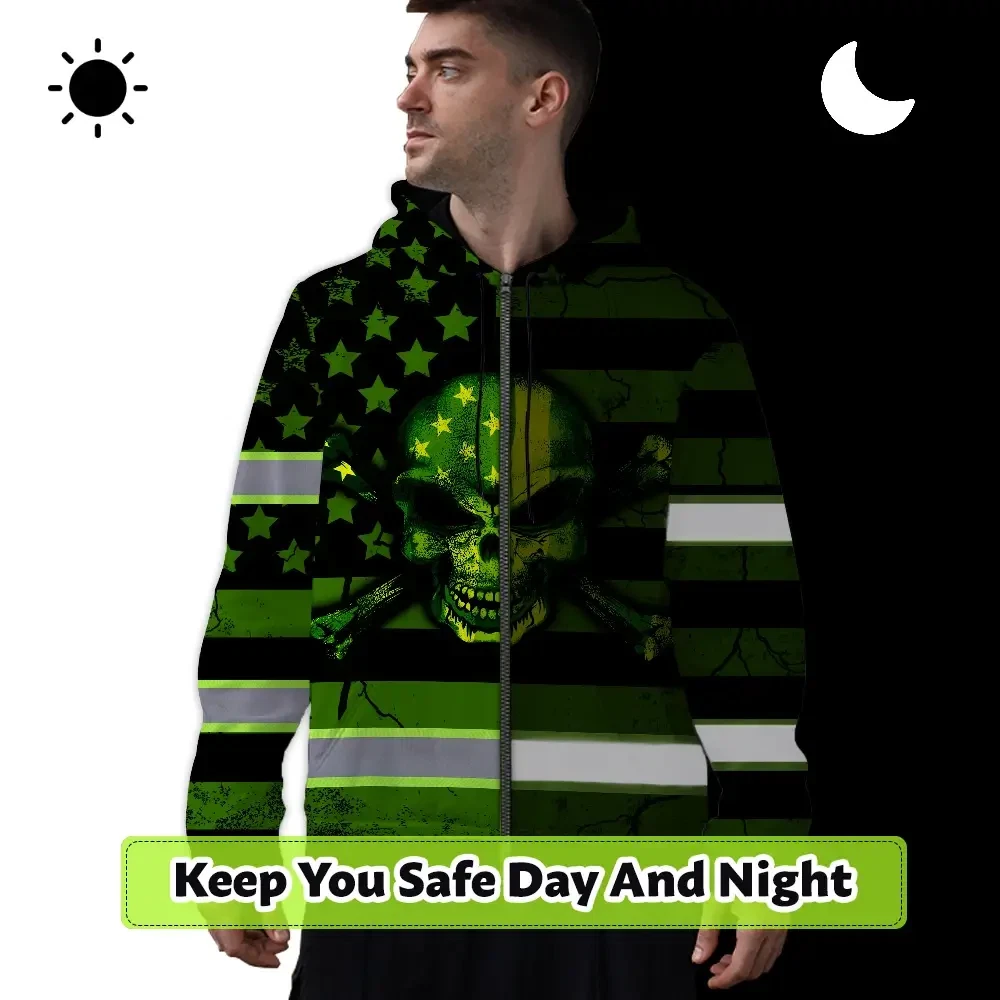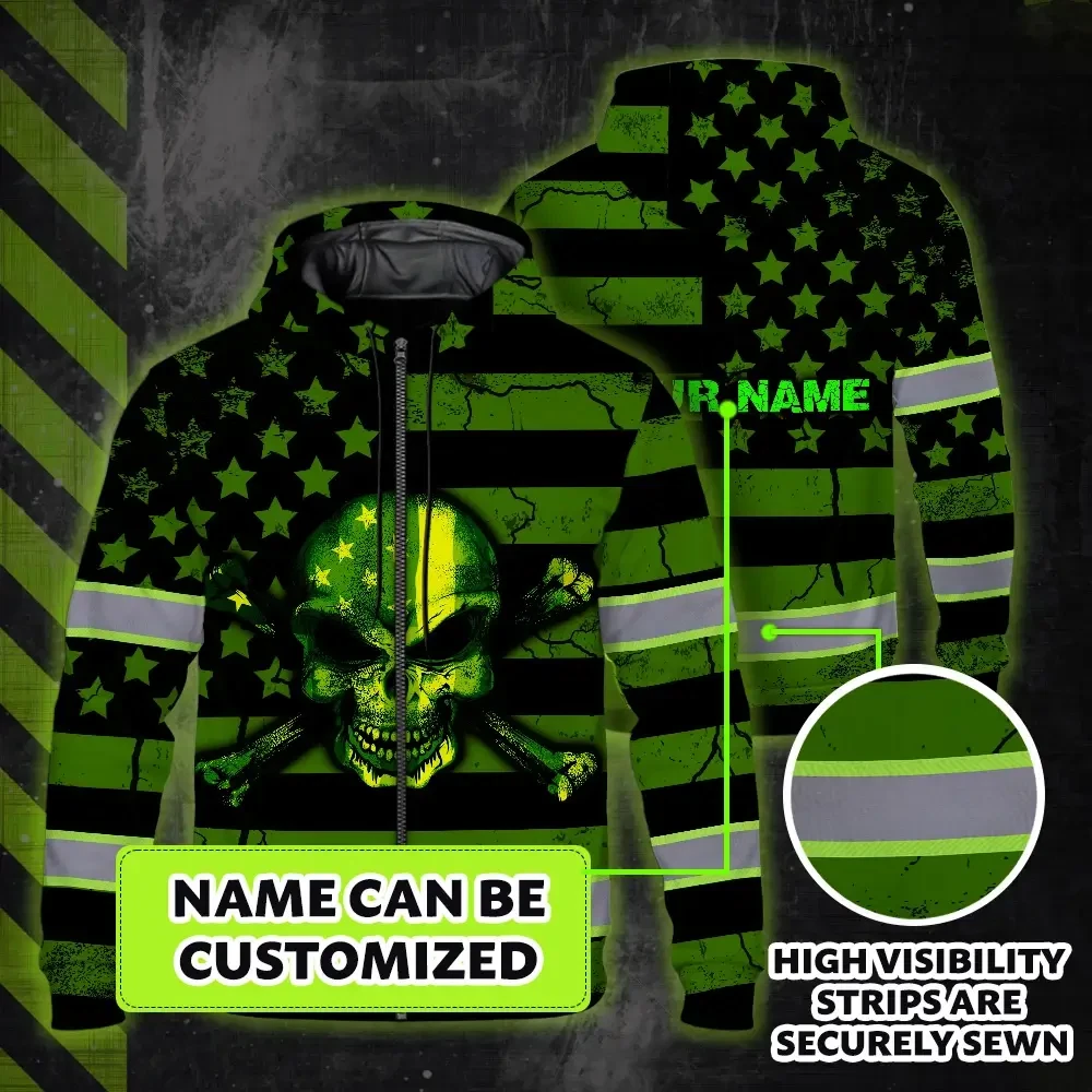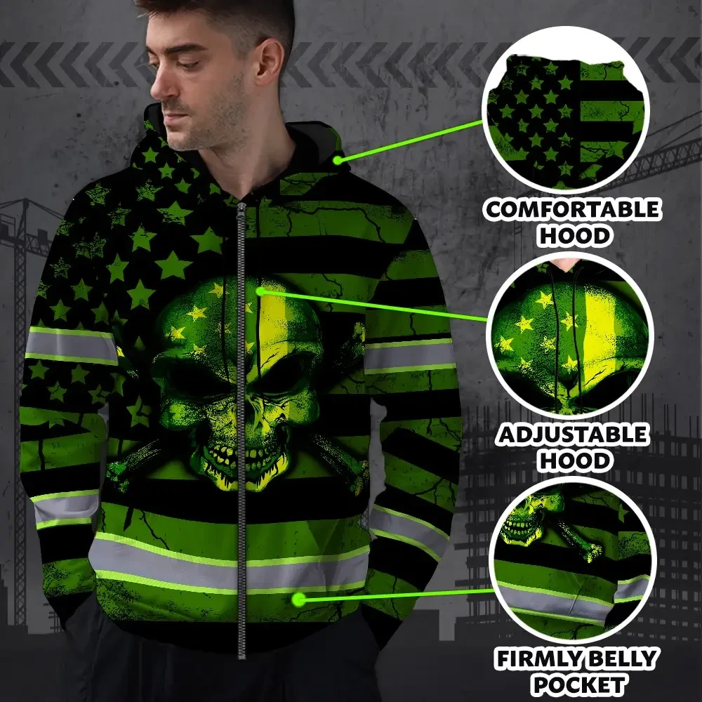 Hi Vis Zip Hoodie Reflective Skull Neon US Flag Custom Name Safety Workwear