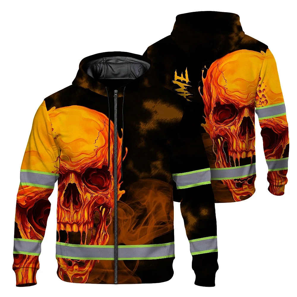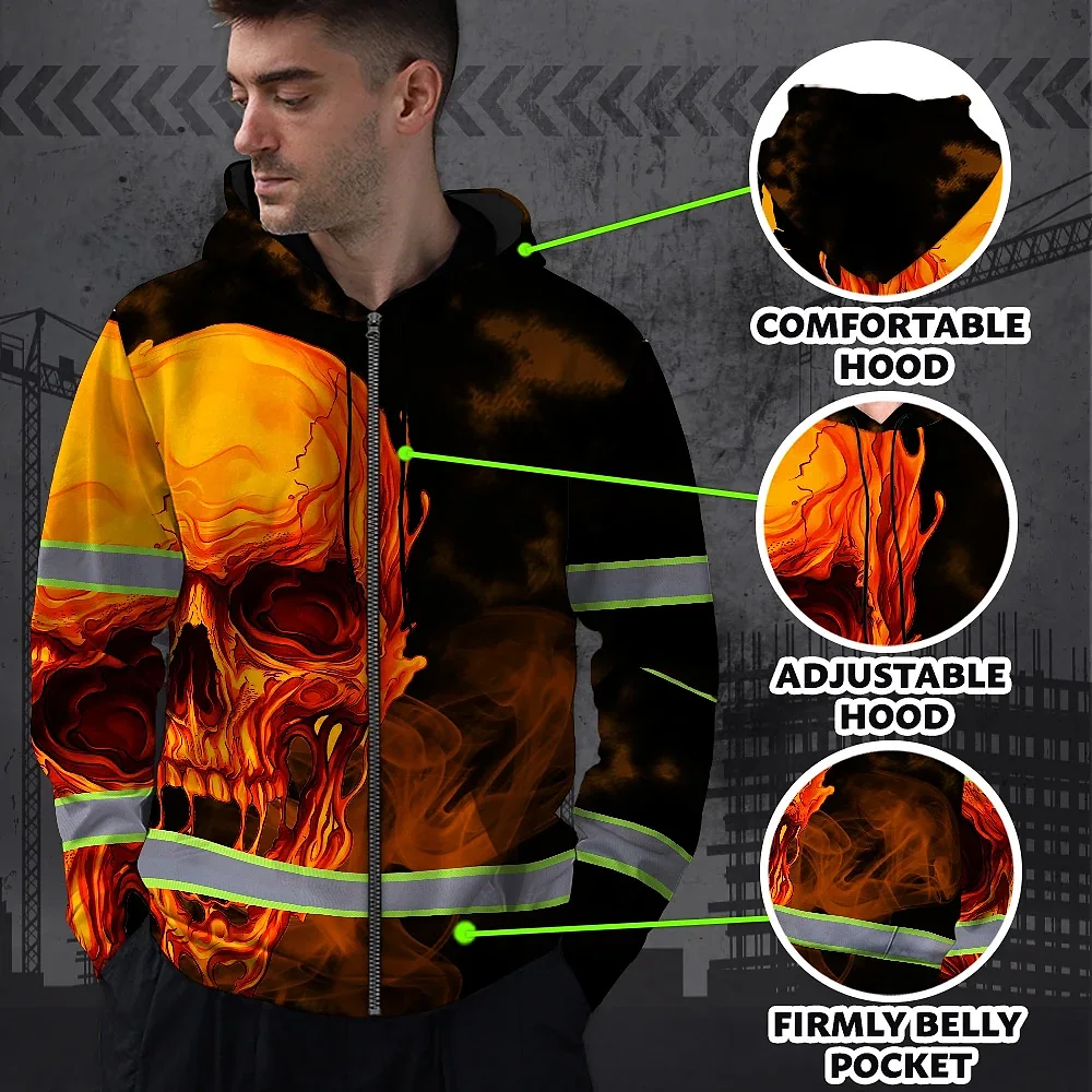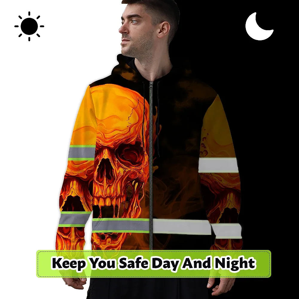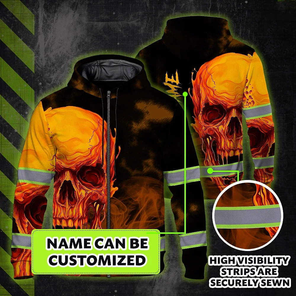 Hi Vis Zip Hoodie Reflective Tapes Black And Orange Skull Custom Name Safety Workwear For Workers, Truckers, Operators