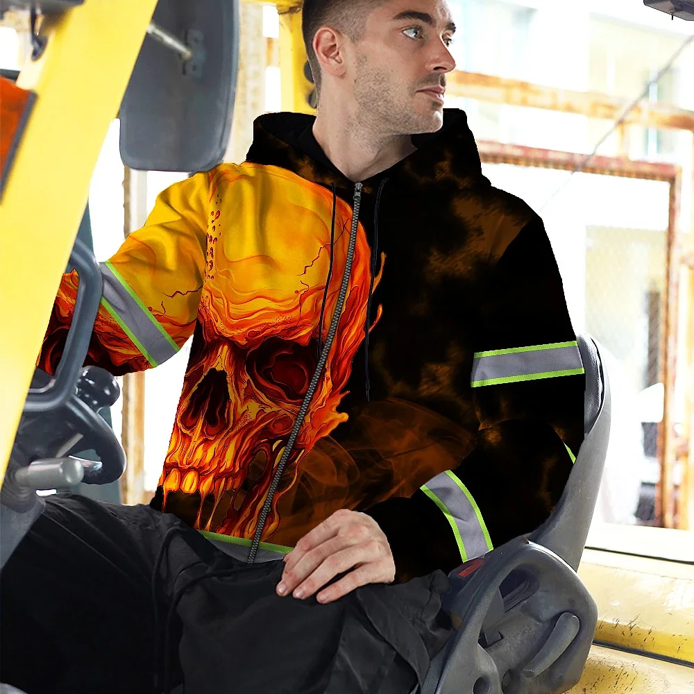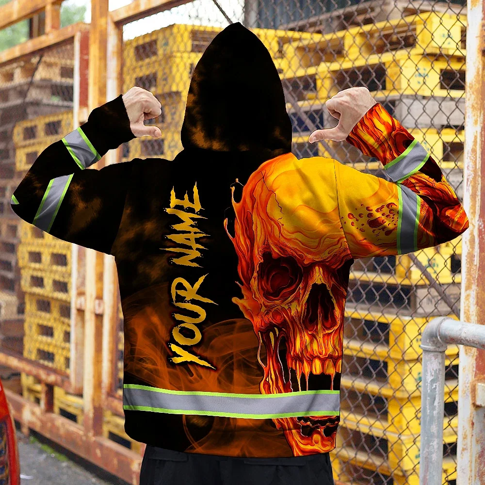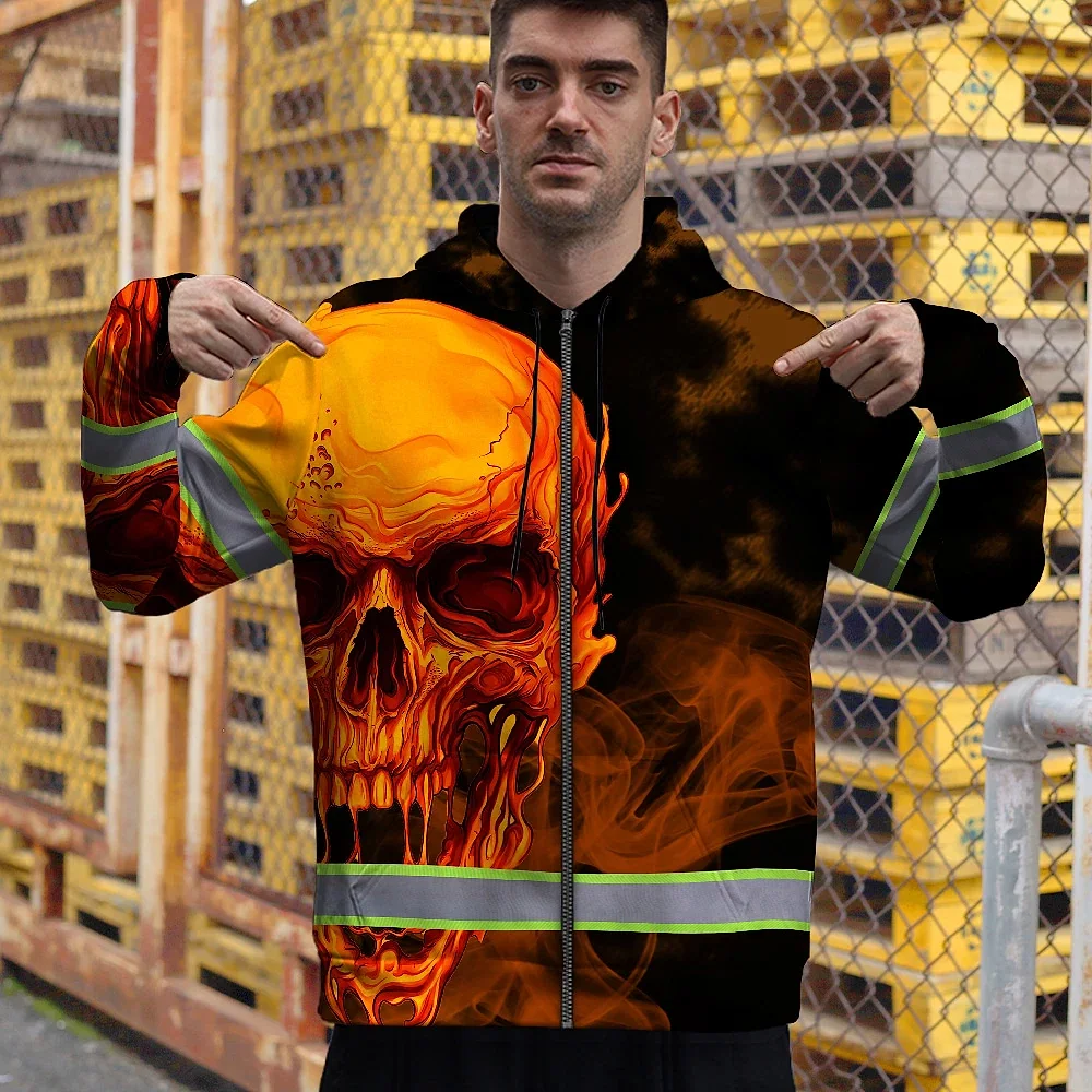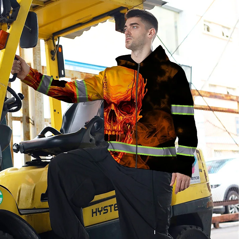 Hi Vis Zip Hoodie Reflective Tapes Black And Orange Skull Custom Name Safety Workwear For Workers, Truckers, Operators