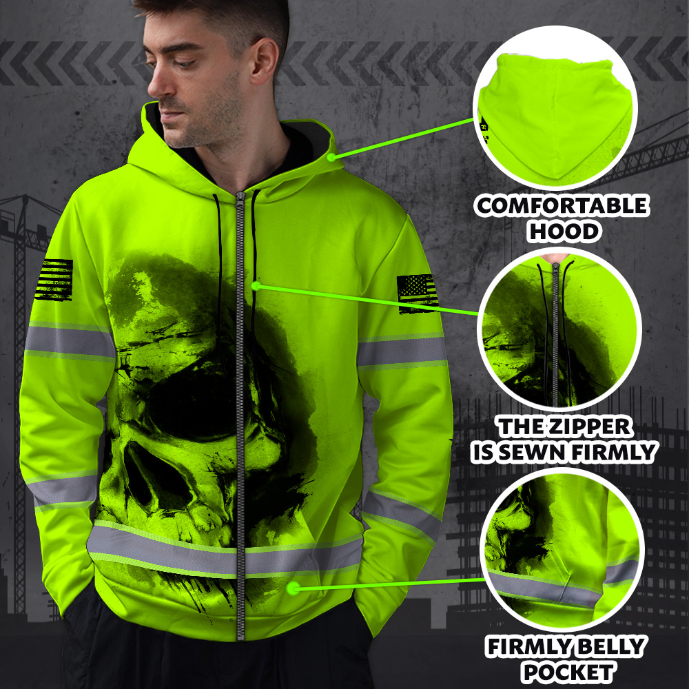 Hi Vis Zip Hoodie Reflective Tapes Black Skull US Flag Safety Workwear