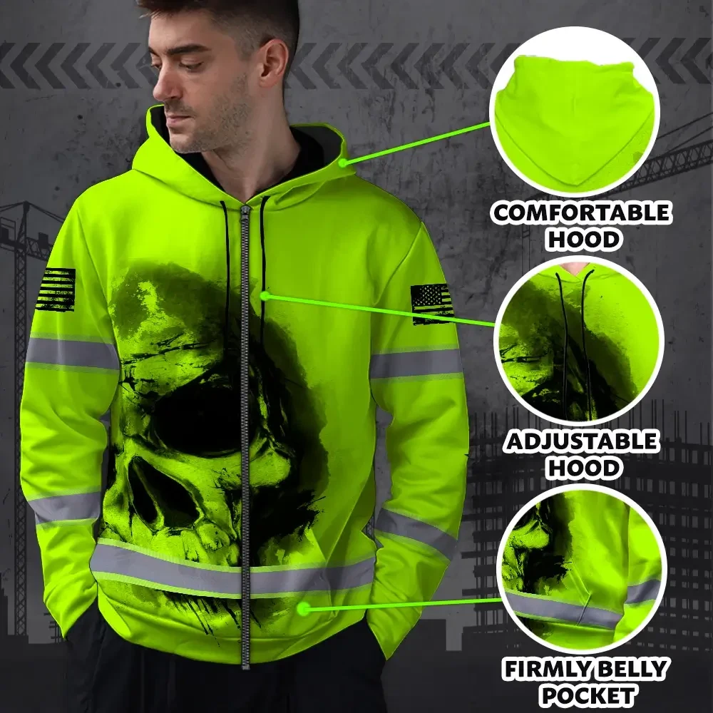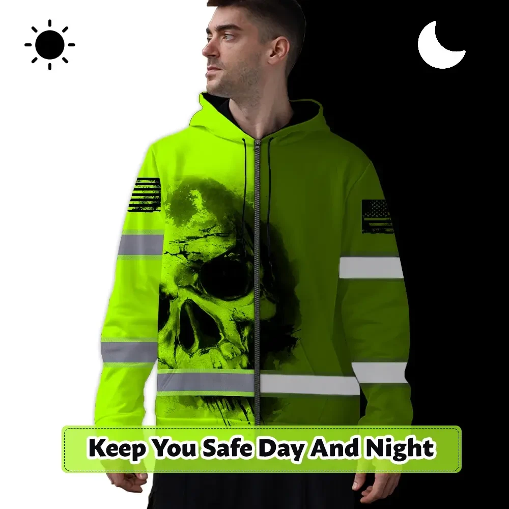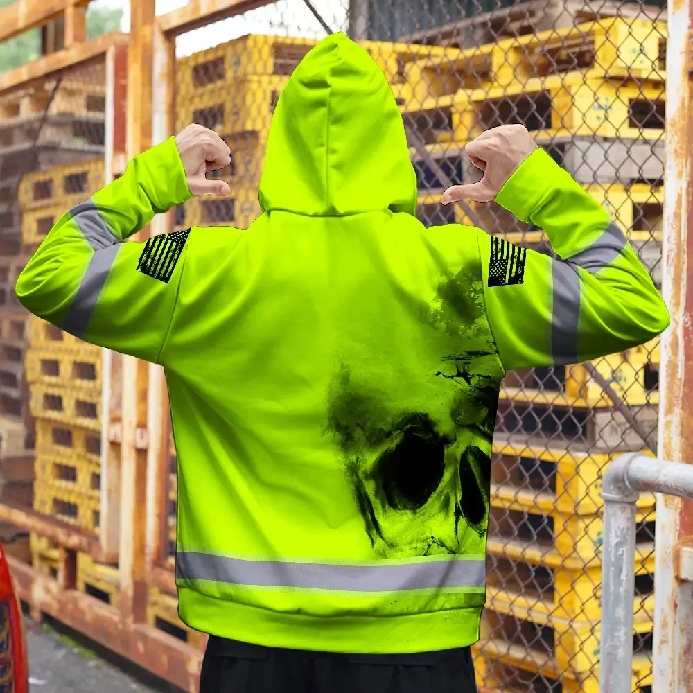Hi Vis Zip Hoodie Reflective Tapes Black Skull US Flag Safety Workwear For Skull Lover
