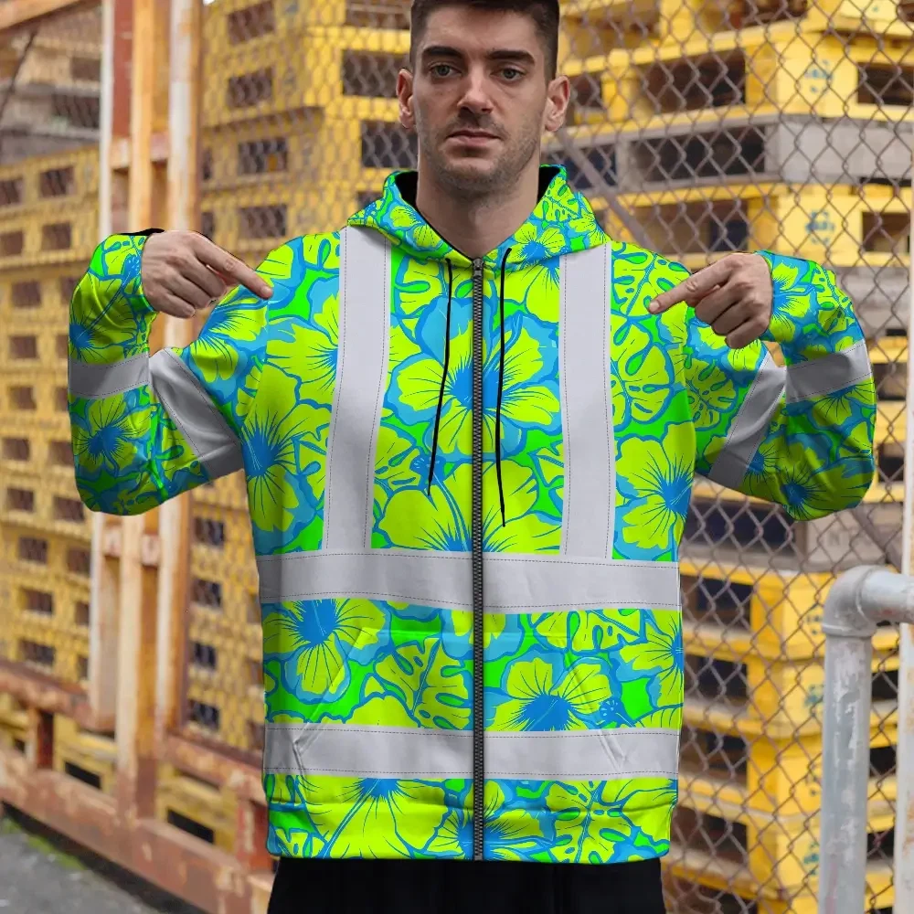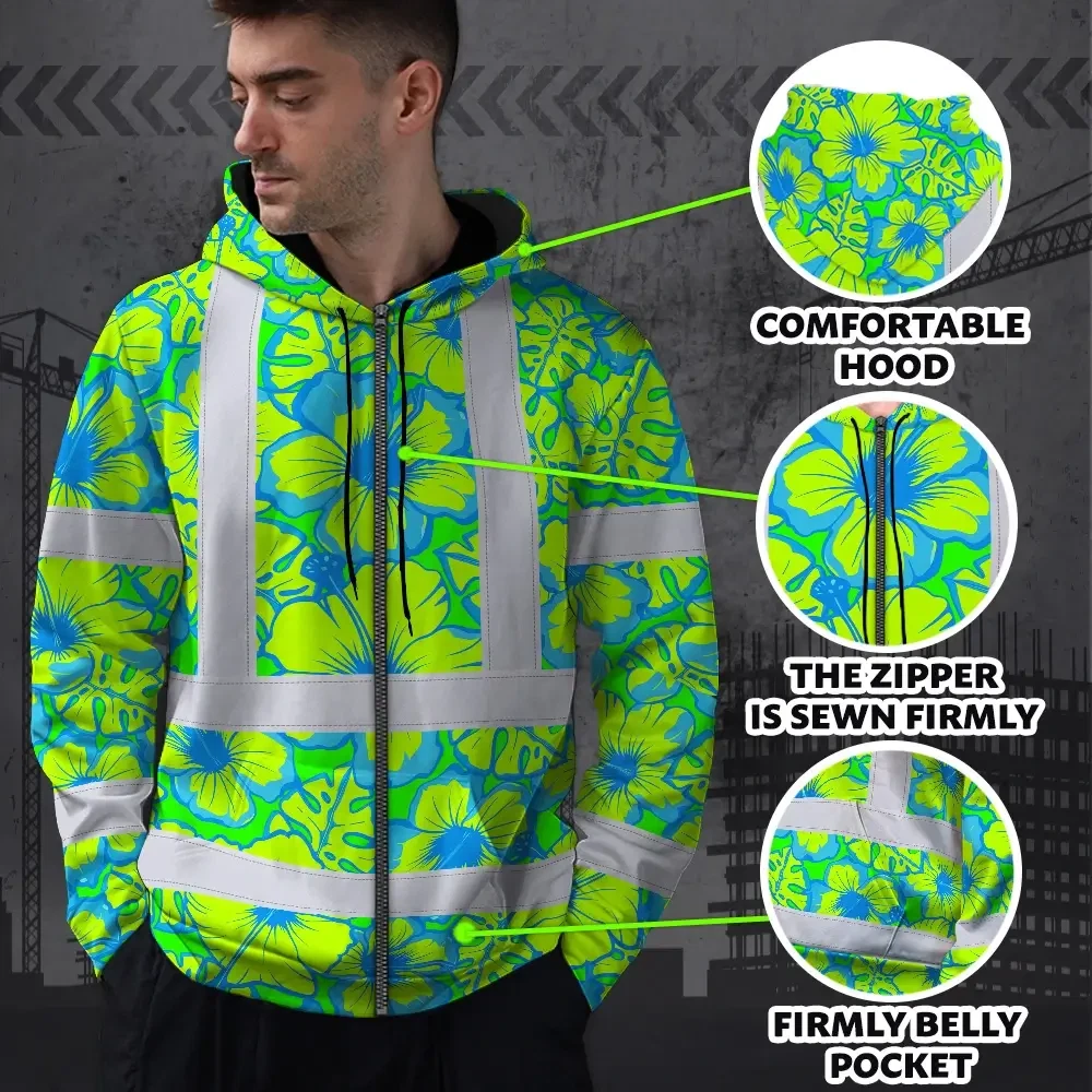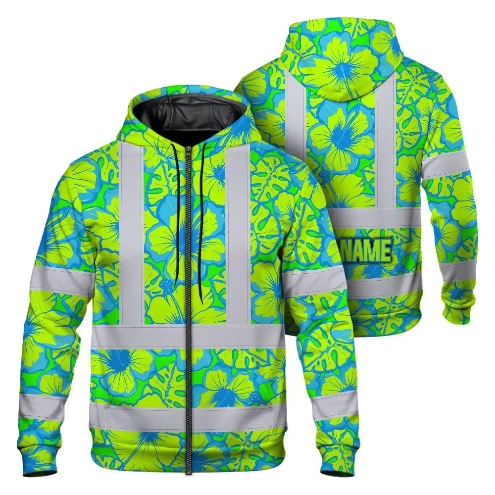 Hi Vis Zip Hoodie Reflective Tapes Blue Neon And Green Flowers Custom Name Safety Workwear For Workers, Truckers, Operators