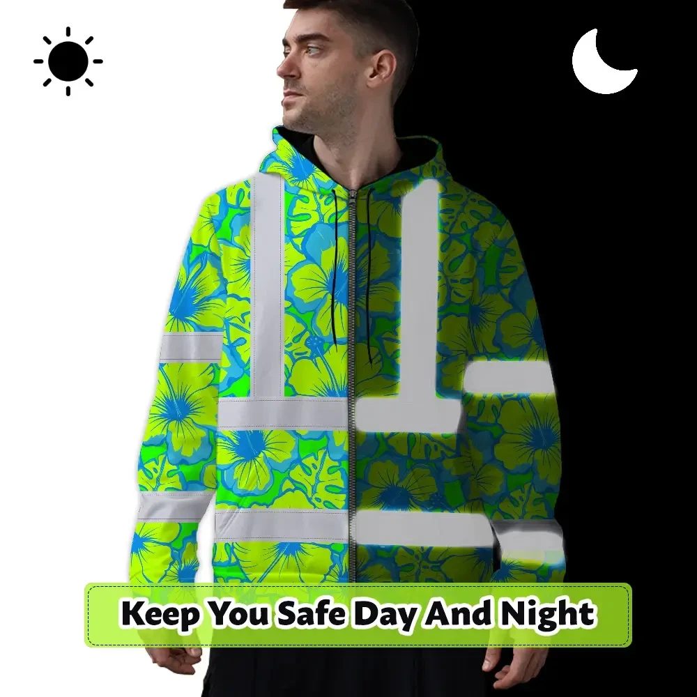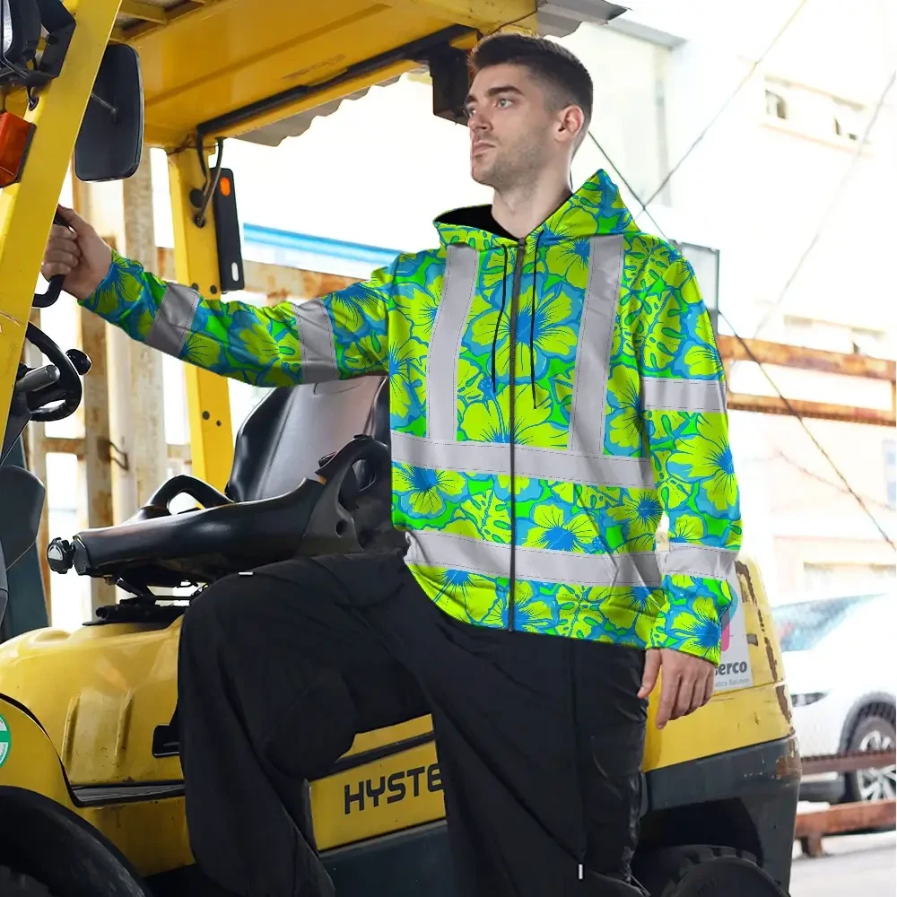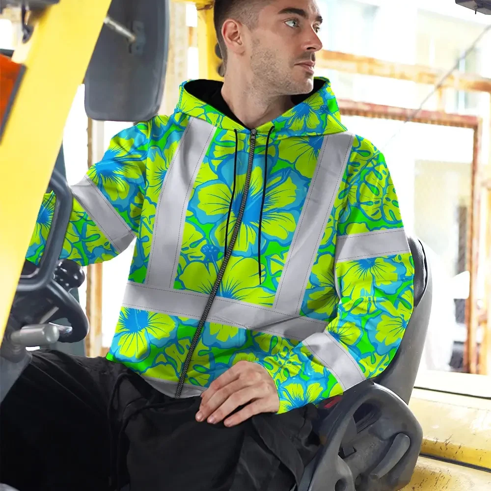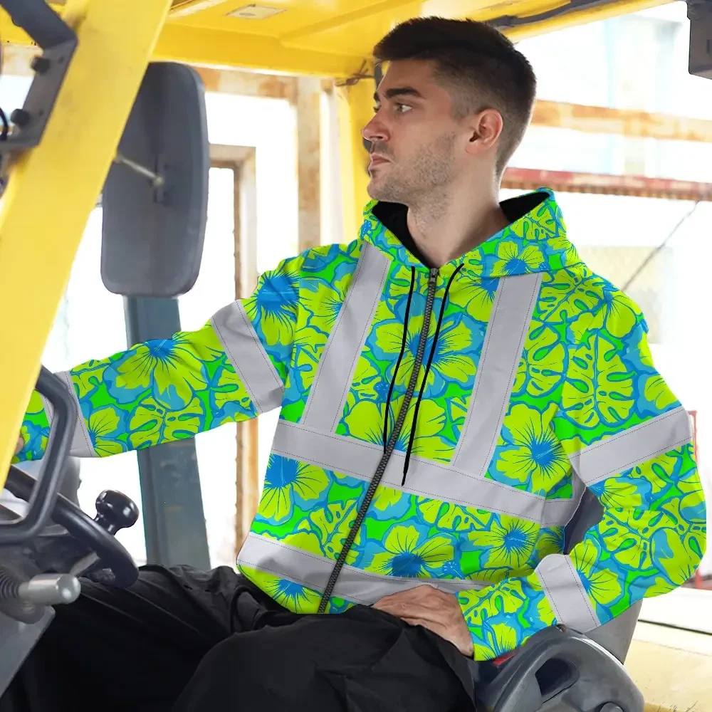 Hi Vis Zip Hoodie Reflective Tapes Blue Neon And Green Flowers Custom Name Safety Workwear For Workers, Truckers, Operators