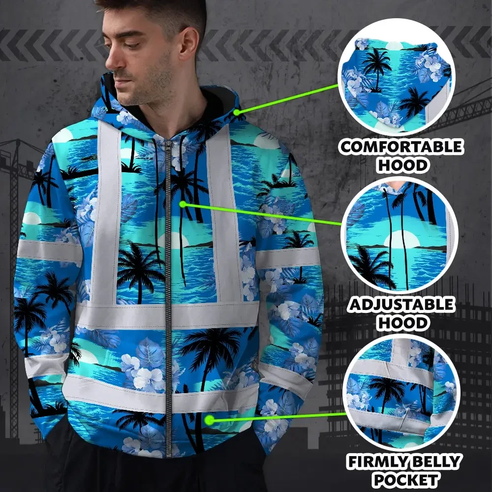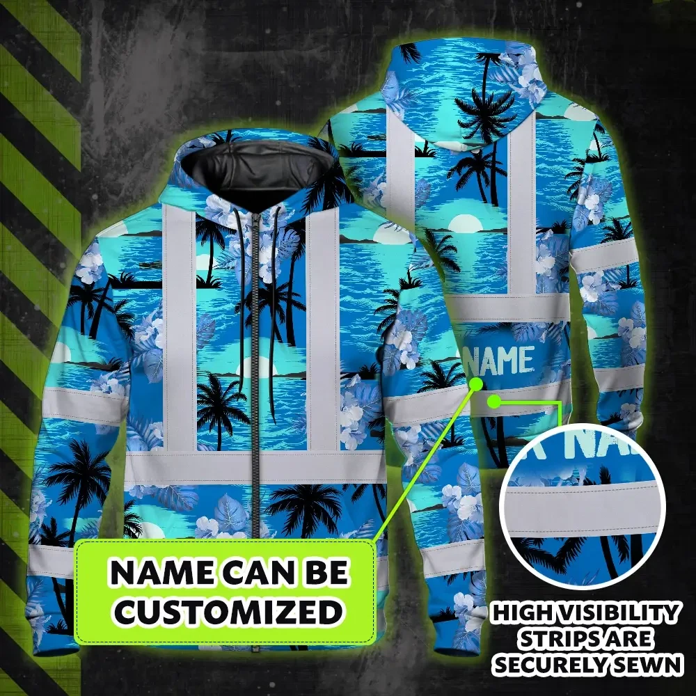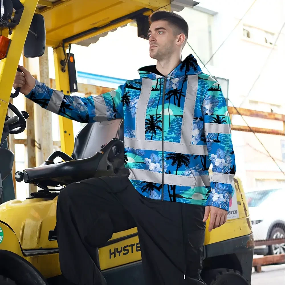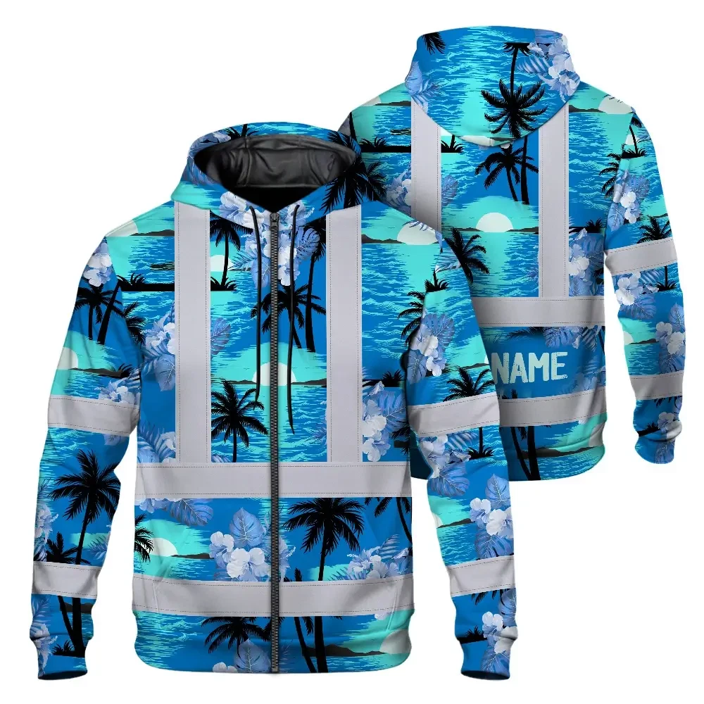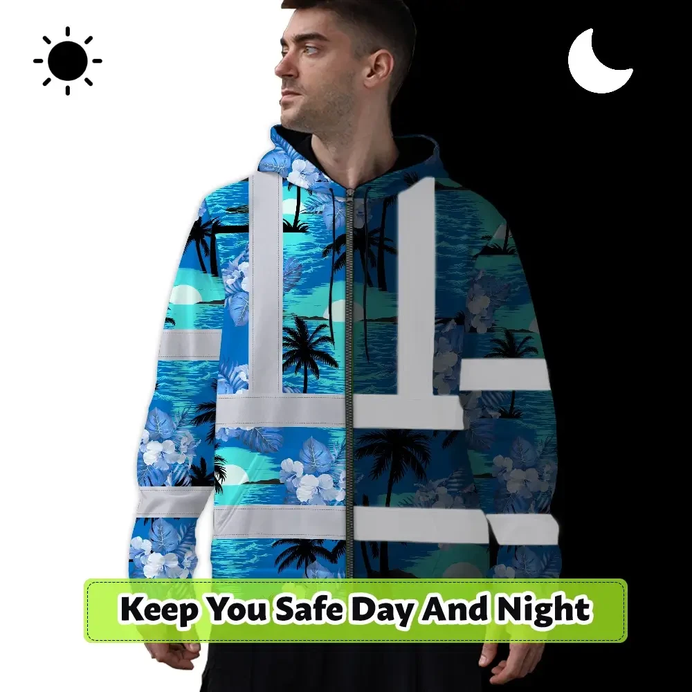 Hi Vis Zip Hoodie Reflective Tapes Blue Neon Flowers 4 Custom Name Safety Workwear For Workers, Truckers, Operators