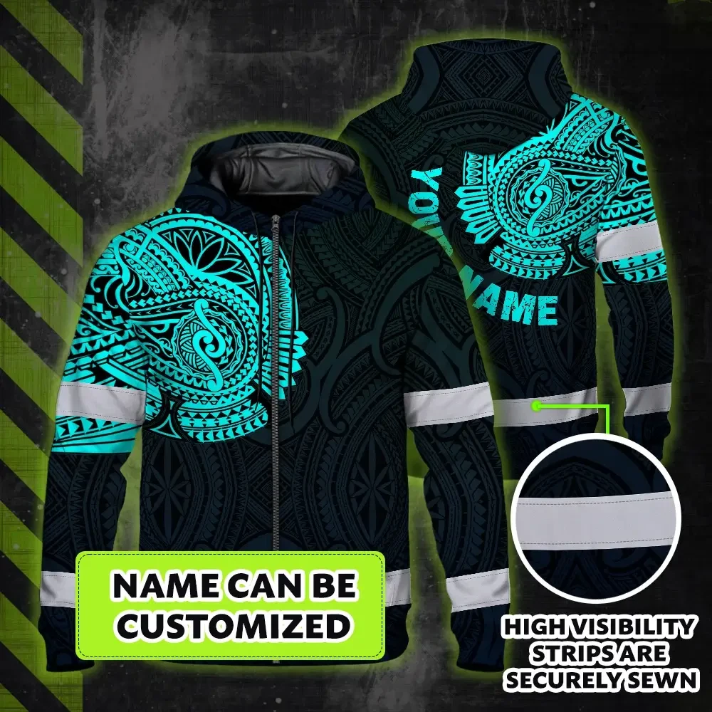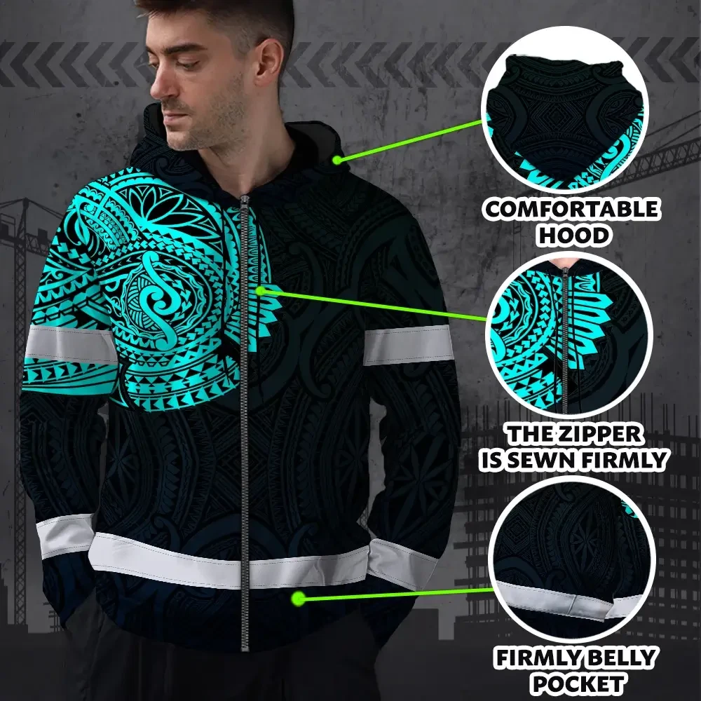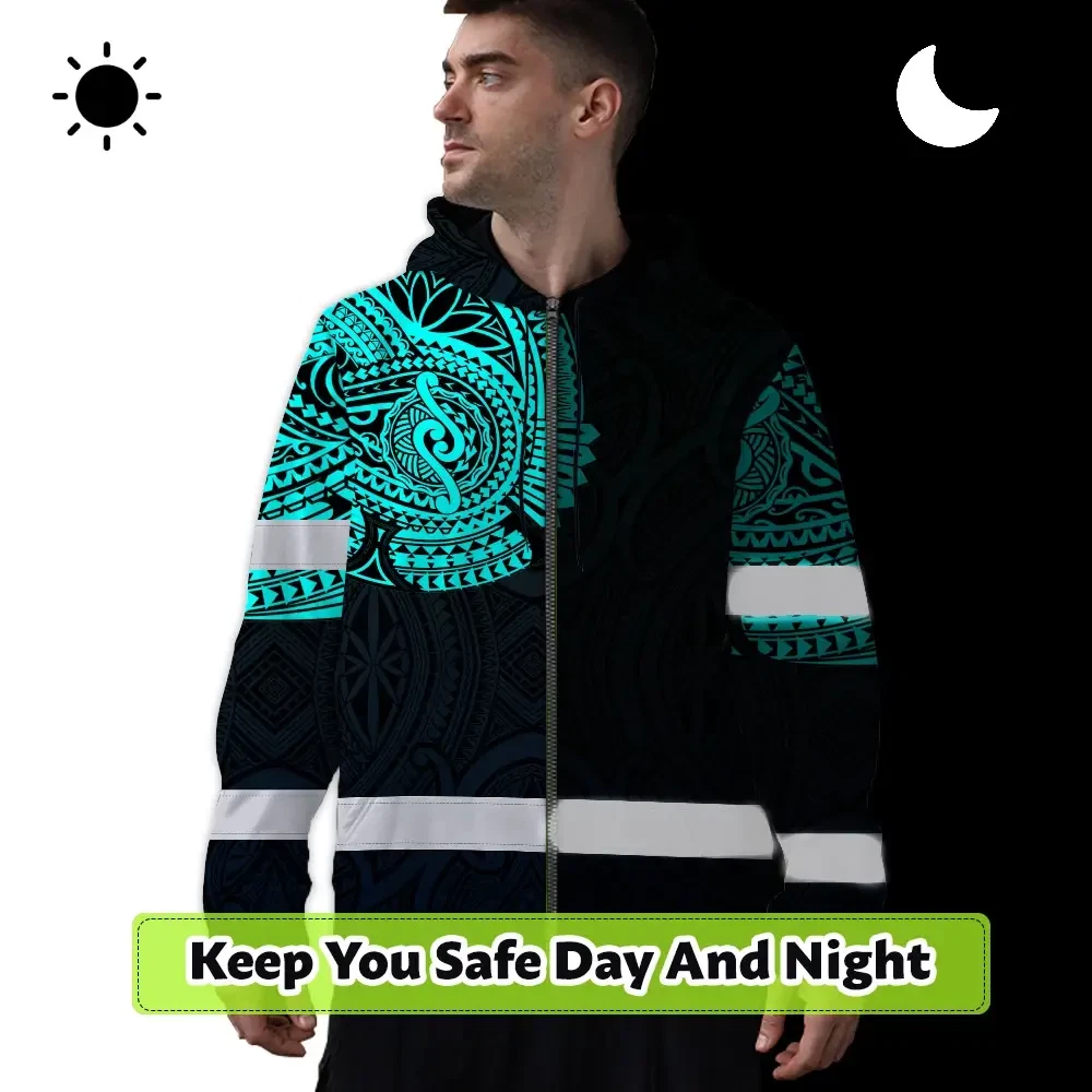 Hi Vis Zip Hoodie Reflective Tapes Blue Neon Hawaii 2 Custom Name Safety Workwear For Workers, Truckers, Operators