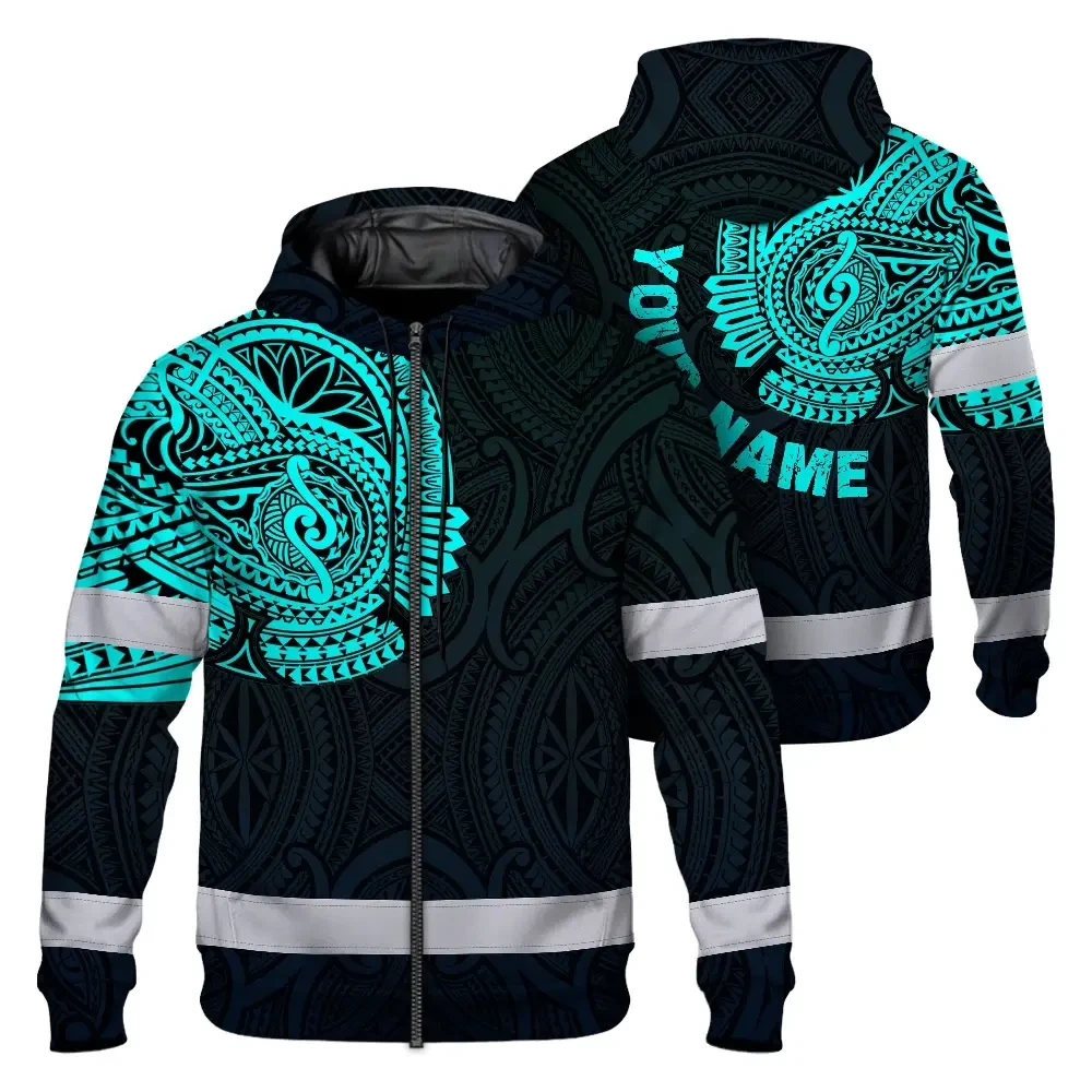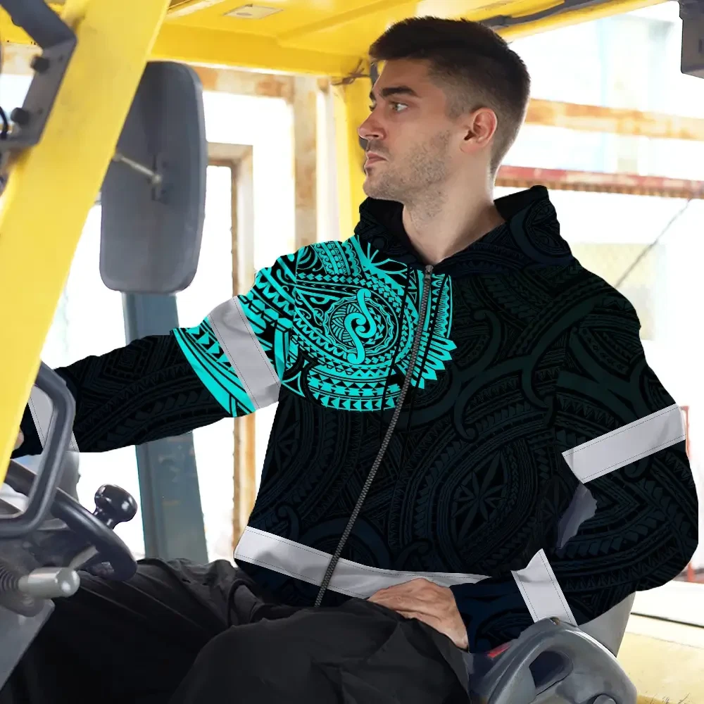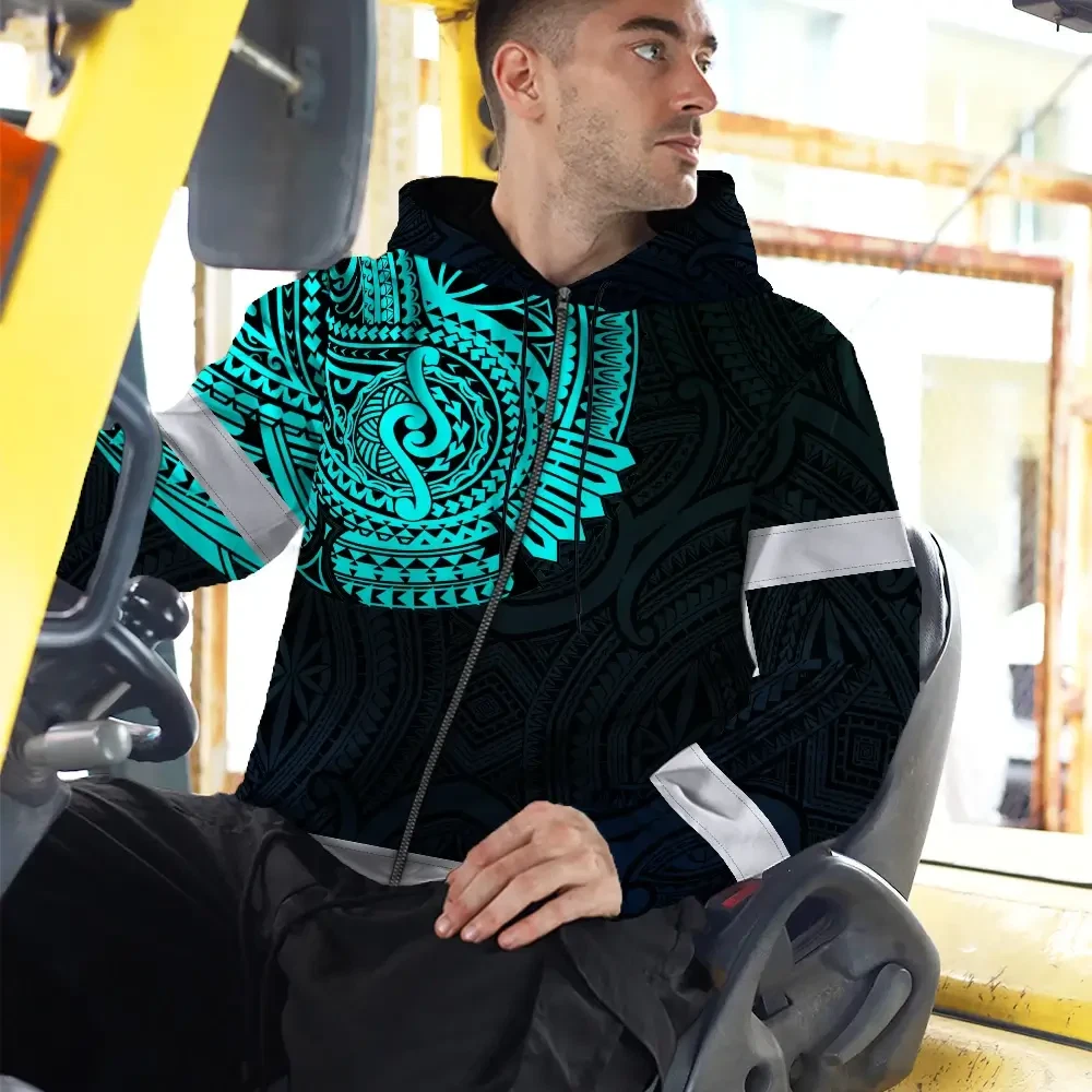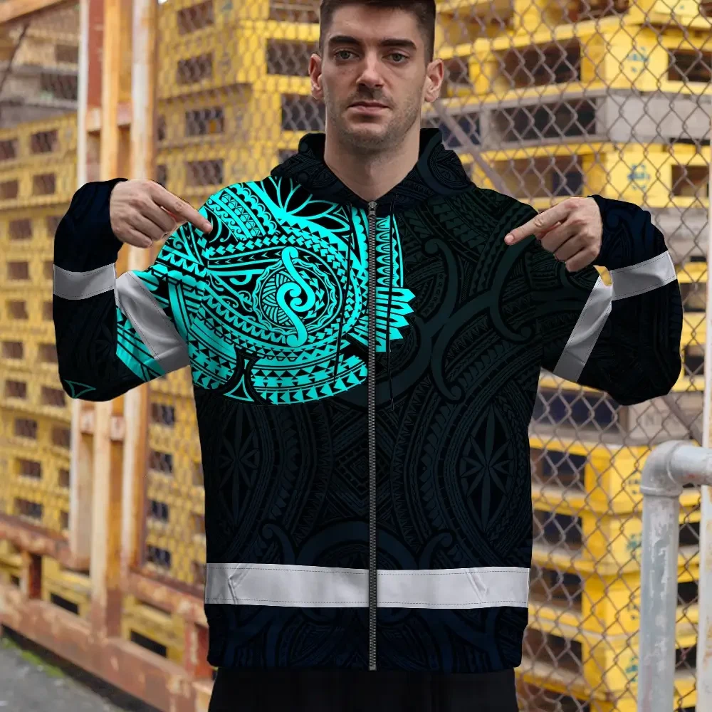 Hi Vis Zip Hoodie Reflective Tapes Blue Neon Hawaii 2 Custom Name Safety Workwear For Workers, Truckers, Operators