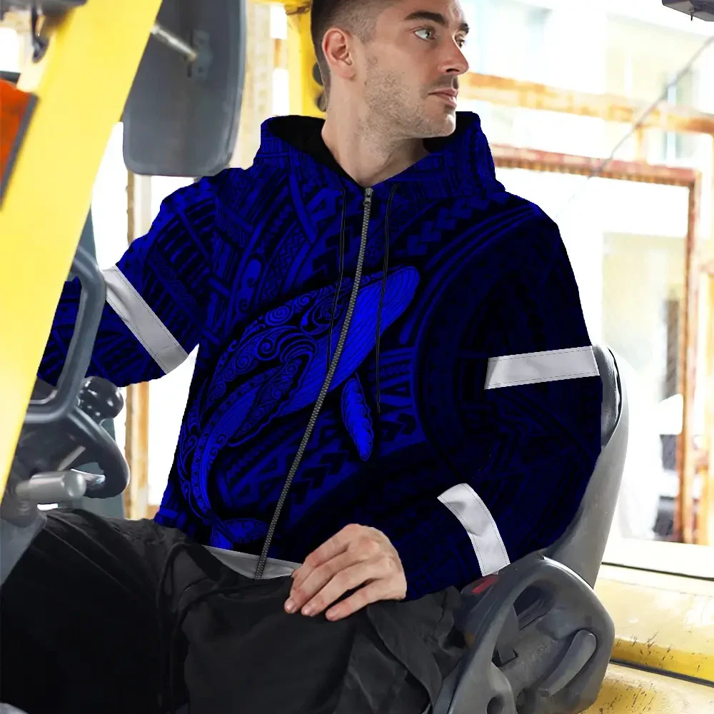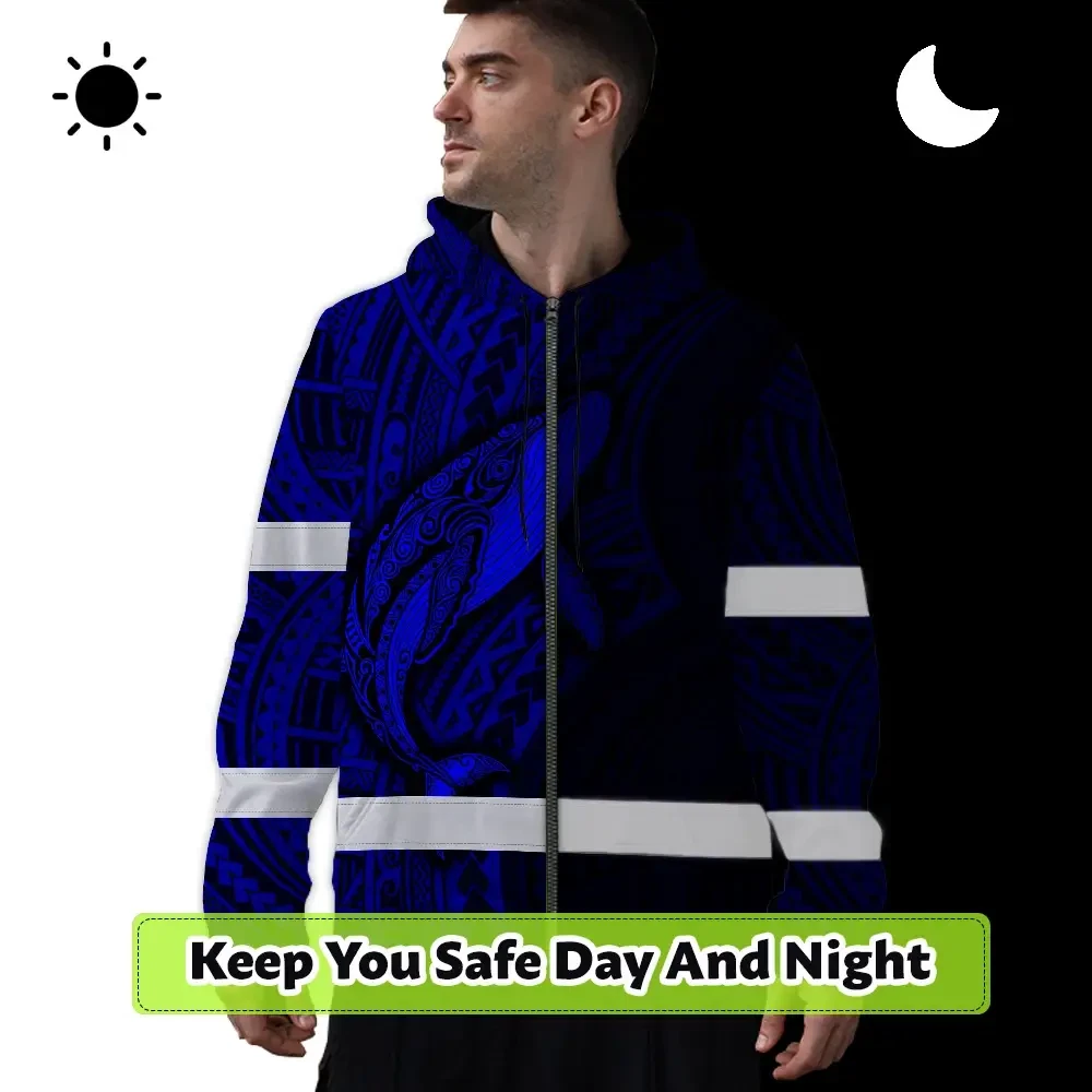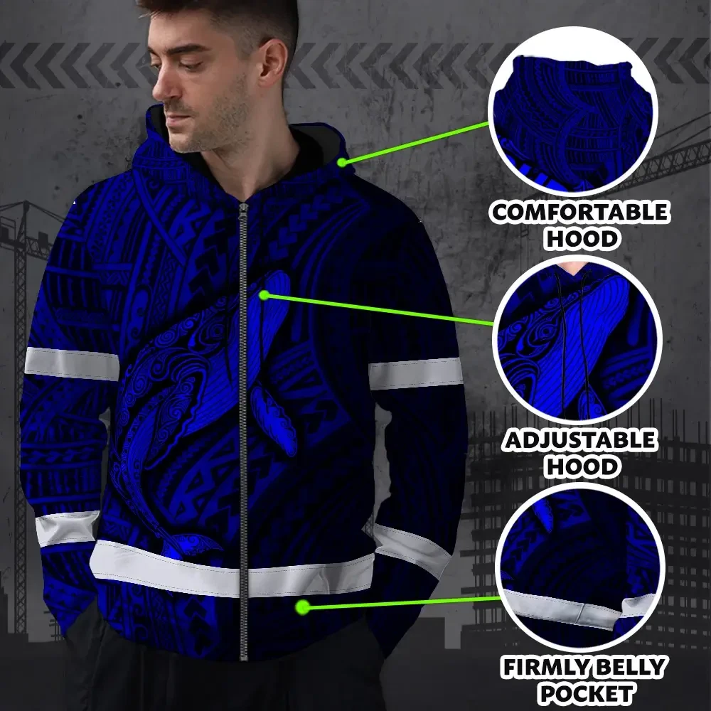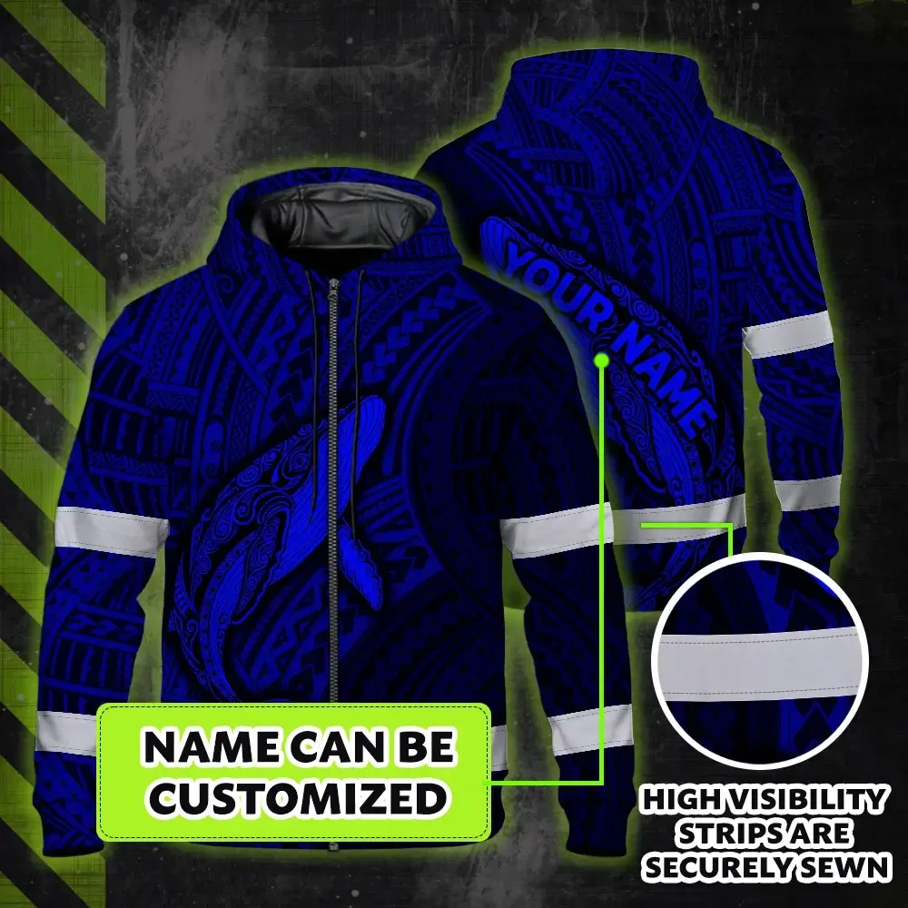 Hi Vis Zip Hoodie Reflective Tapes Blue Neon Hawaii Whale Custom Name Safety Workwear For Workers, Truckers, Operators