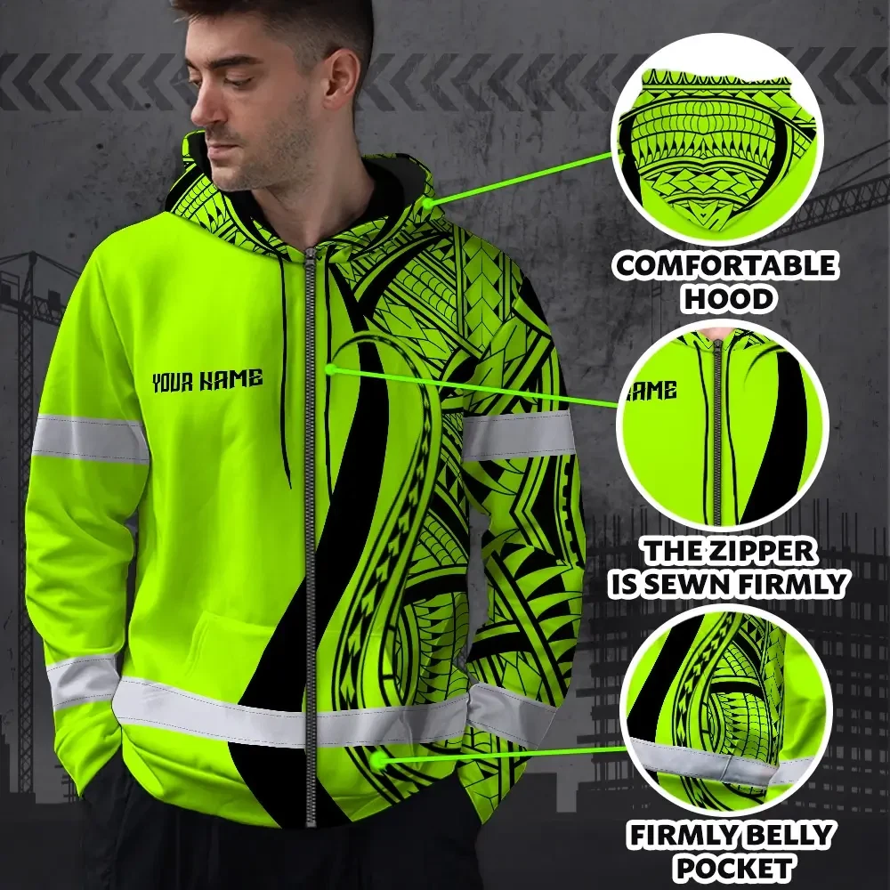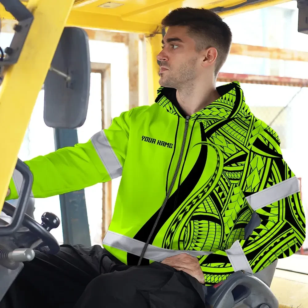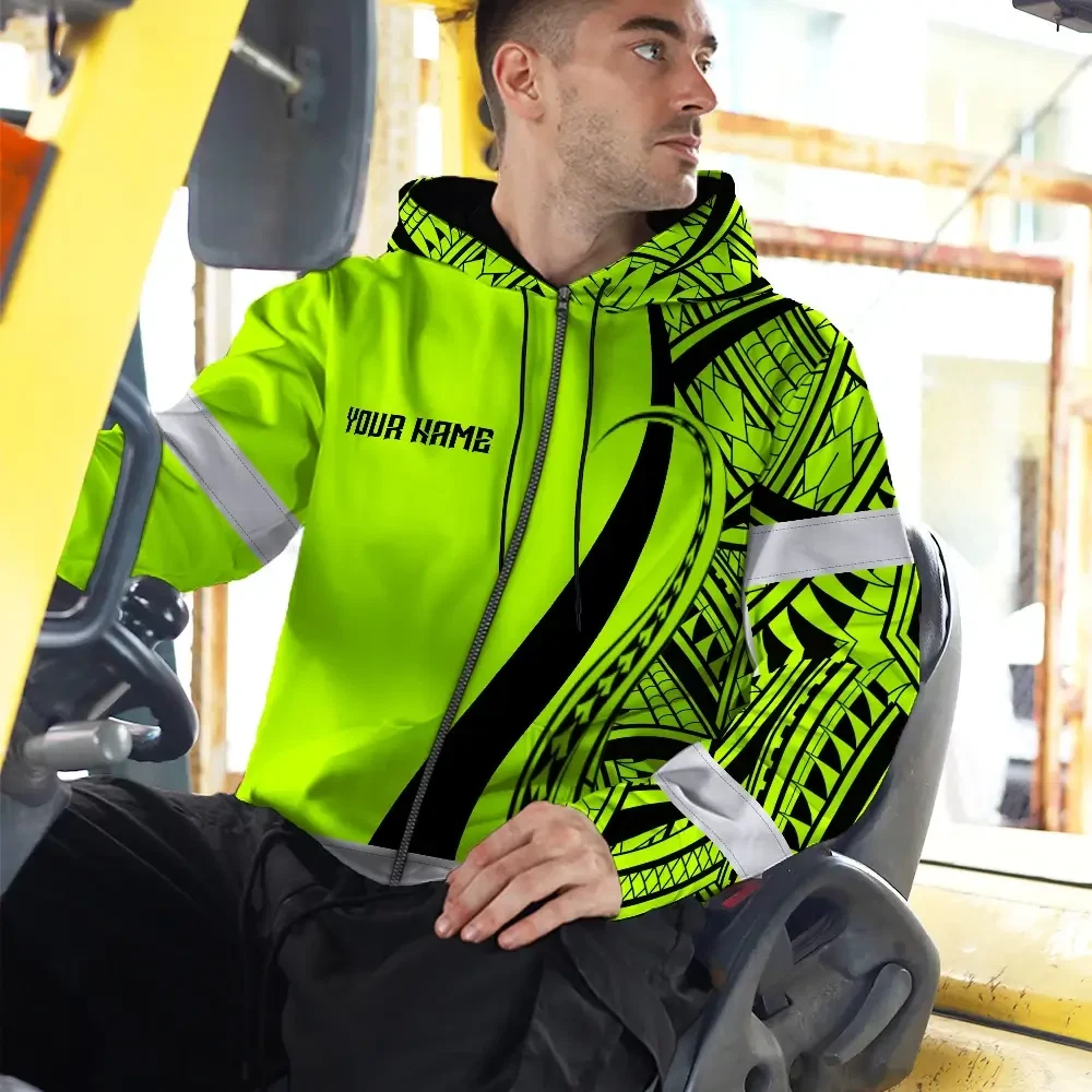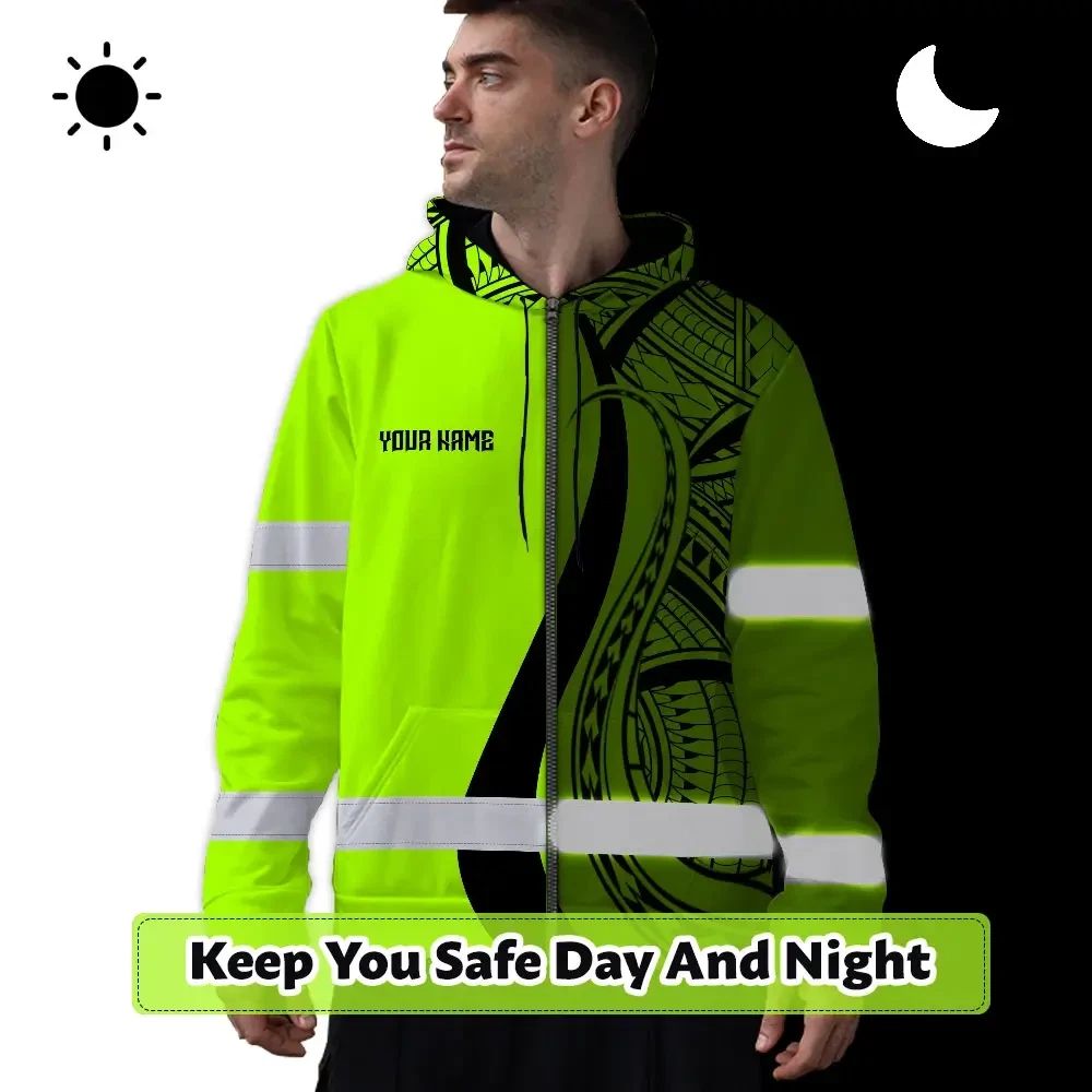 Hi Vis Zip Hoodie Reflective Tapes Green And Black Neon Hawaii Custom Name Safety Workwear For Workers, Truckers, Operators