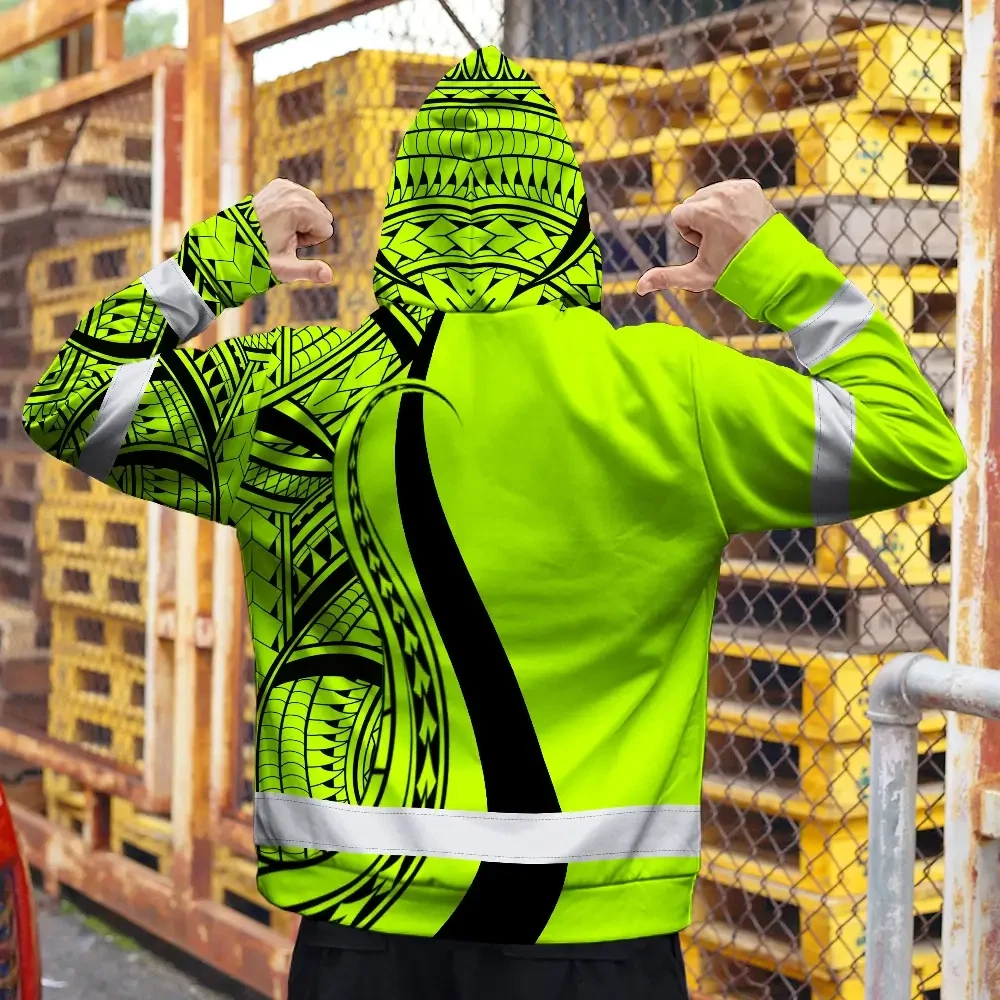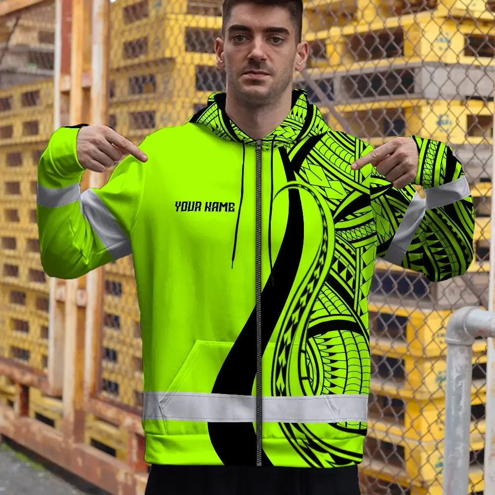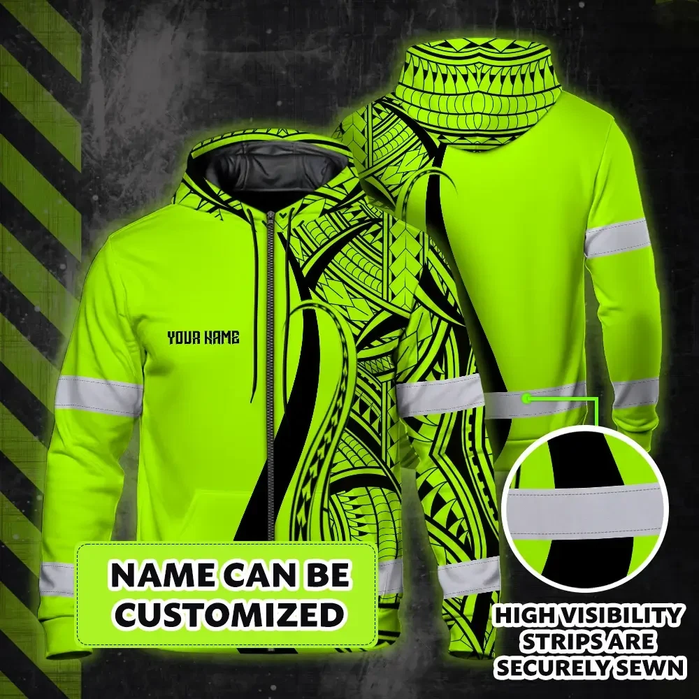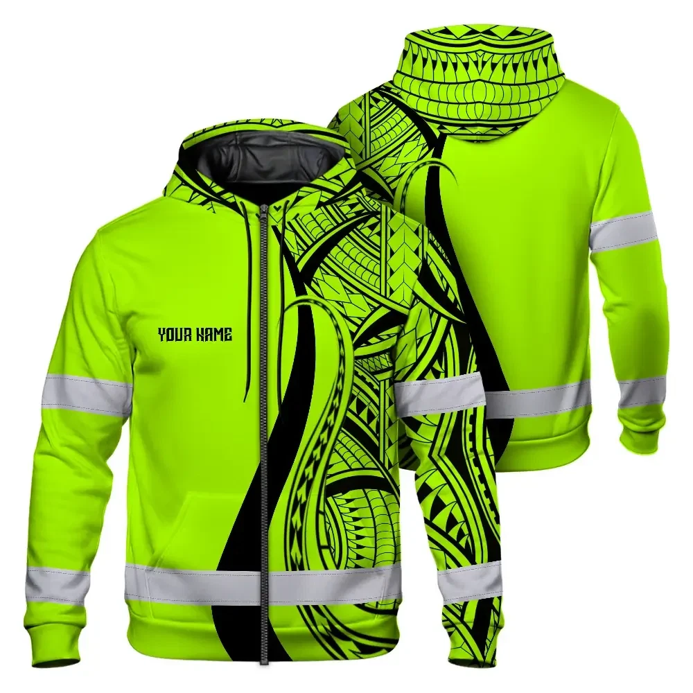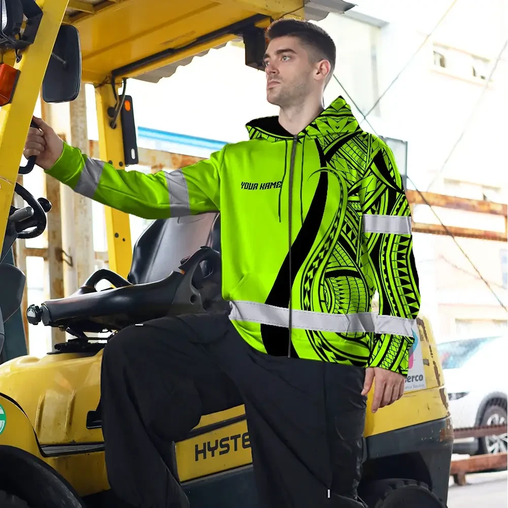 Hi Vis Zip Hoodie Reflective Tapes Green And Black Neon Hawaii Custom Name Safety Workwear For Workers, Truckers, Operators