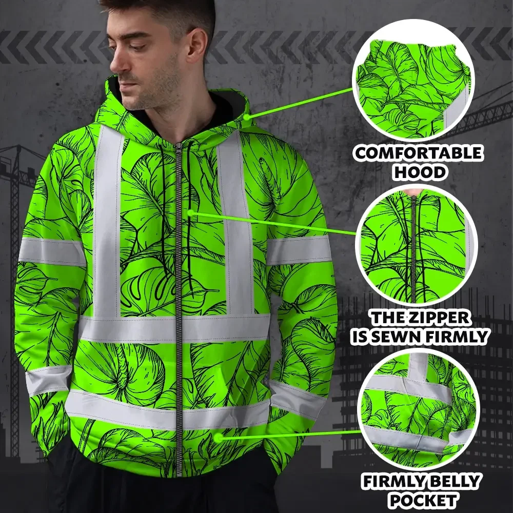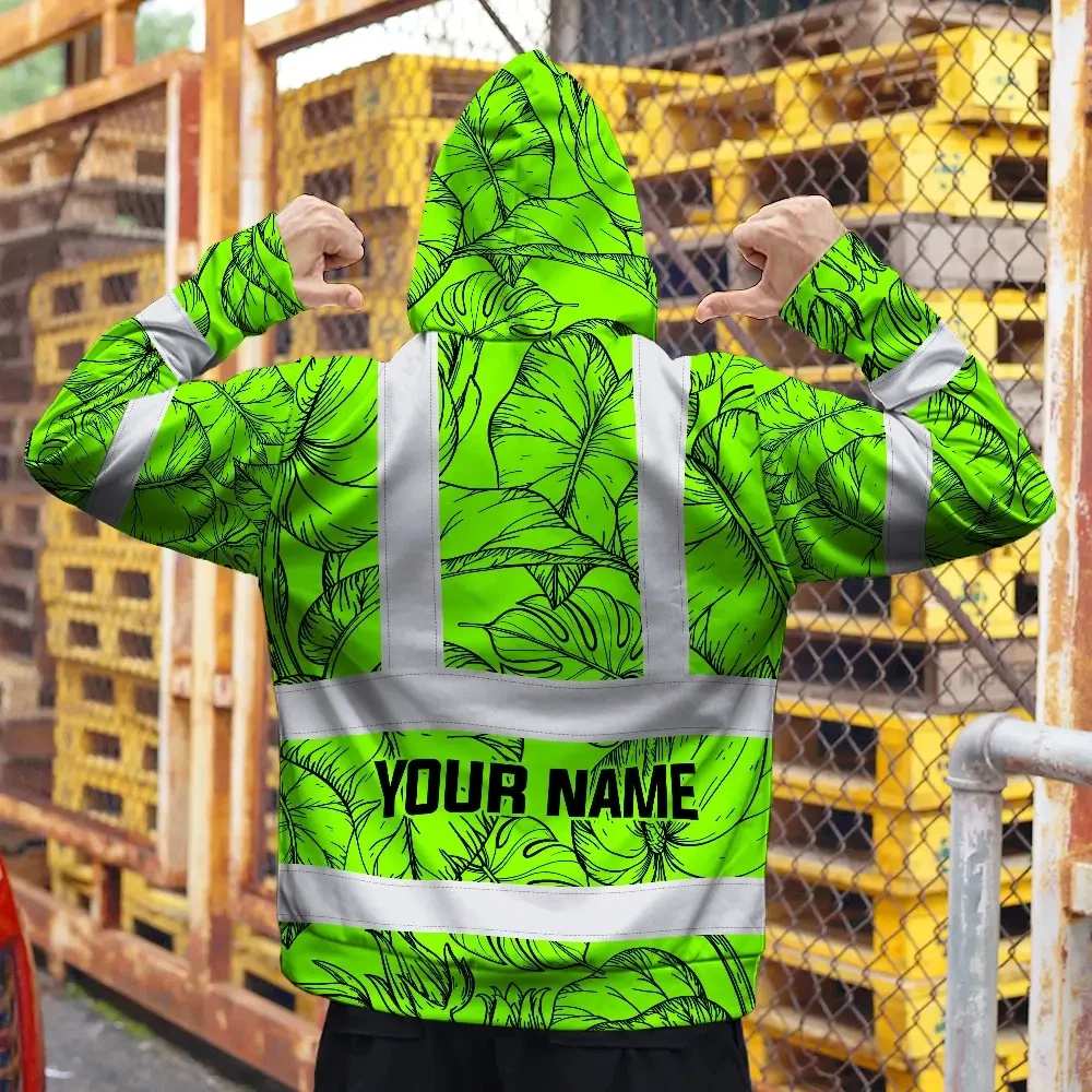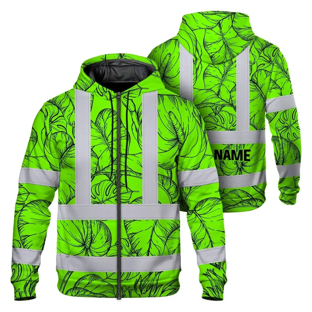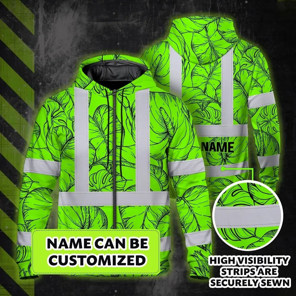 Hi Vis Zip Hoodie Reflective Tapes Green Black Neon Flowers Custom Name Safety Workwear For Workers, Truckers, Operators