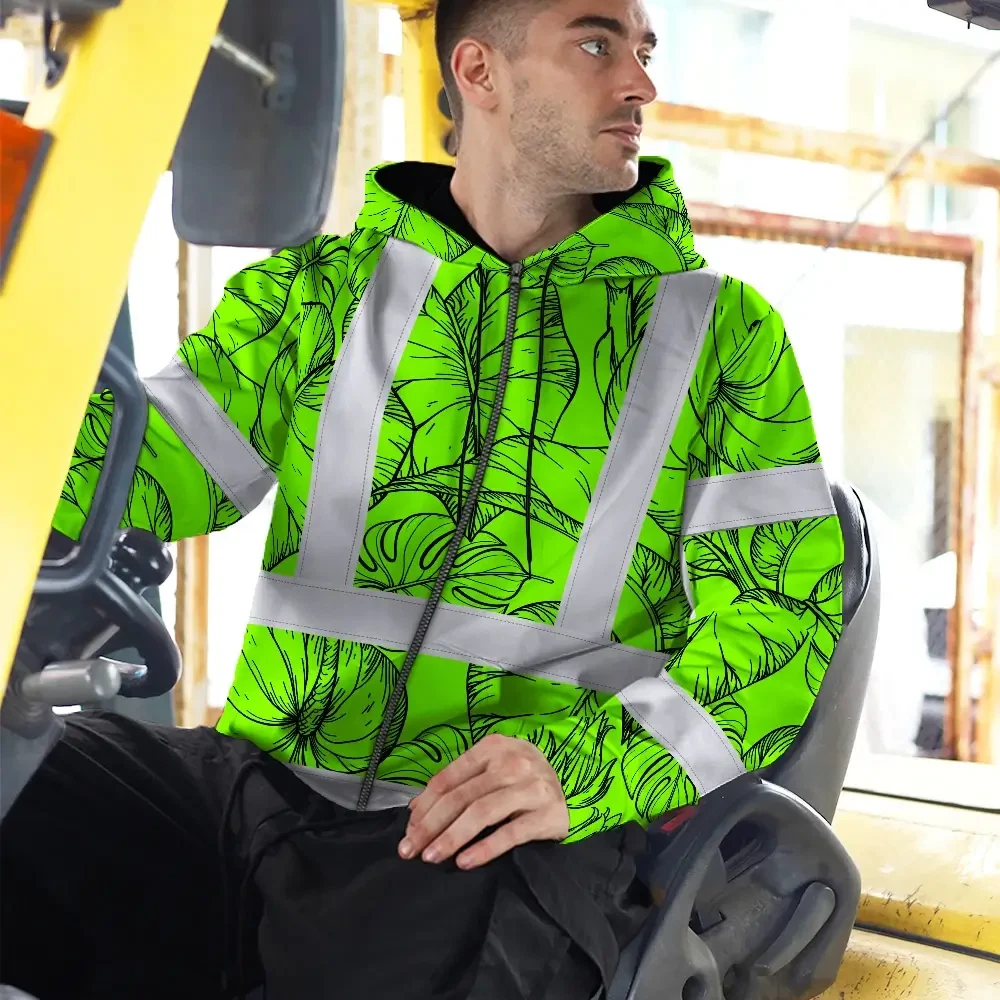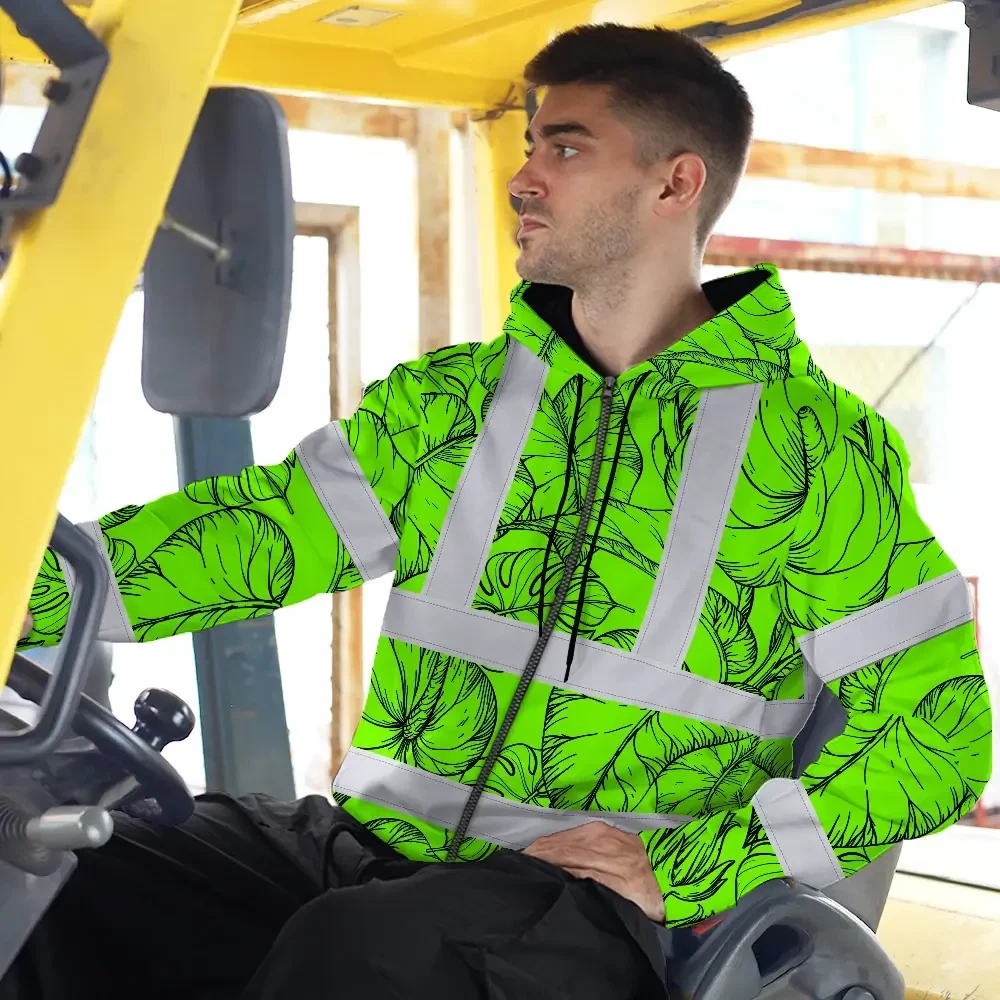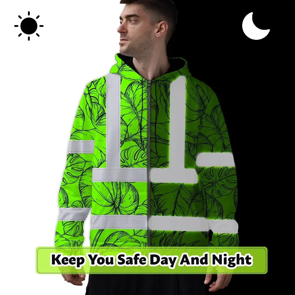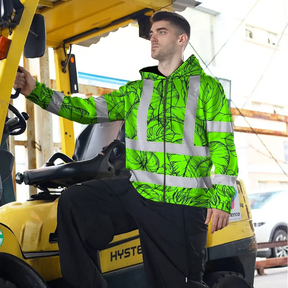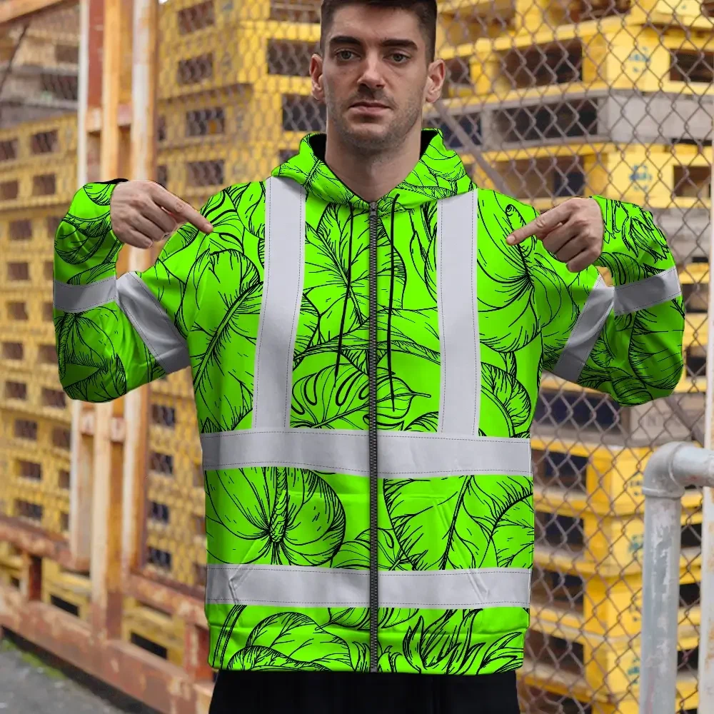 Hi Vis Zip Hoodie Reflective Tapes Green Black Neon Flowers Custom Name Safety Workwear For Workers, Truckers, Operators