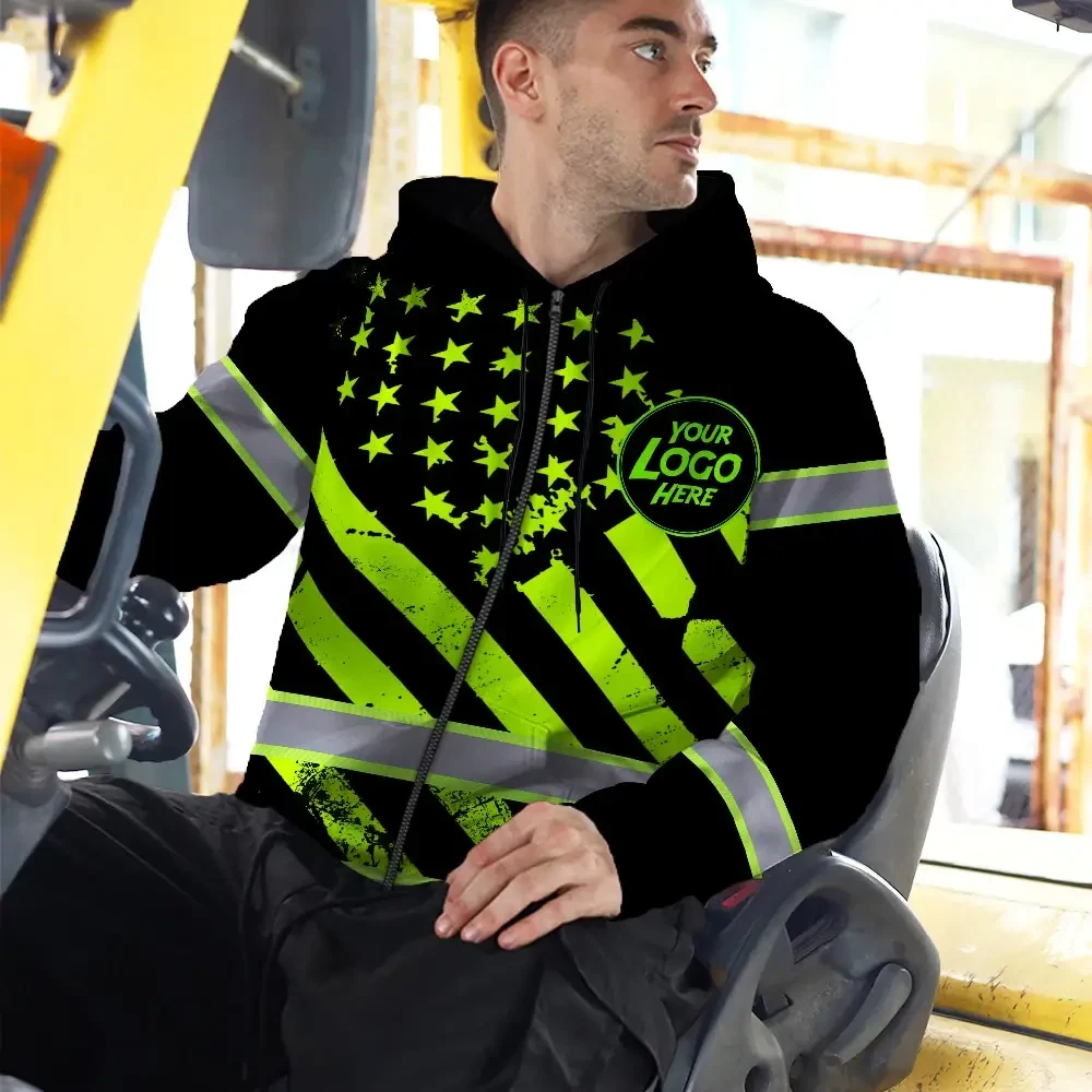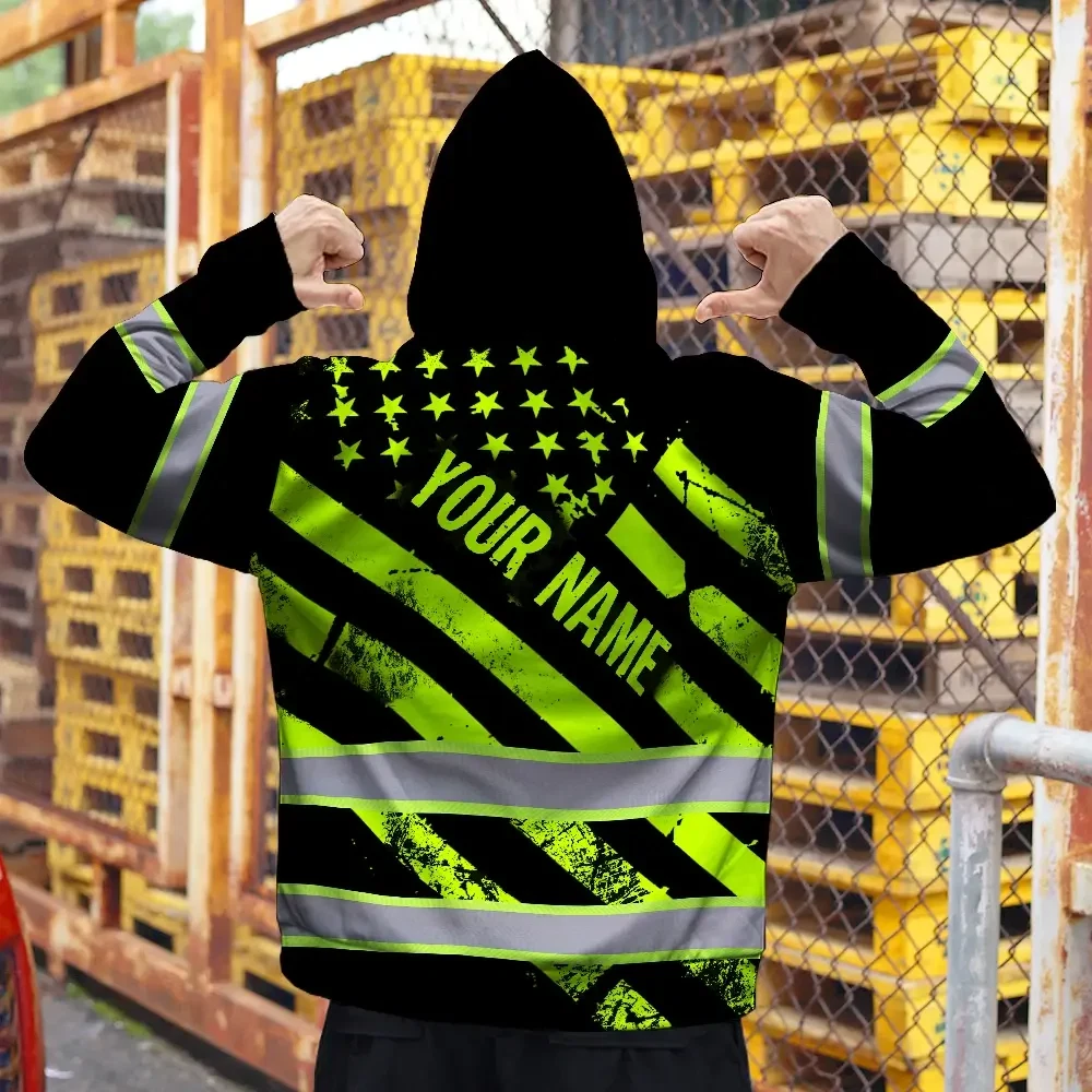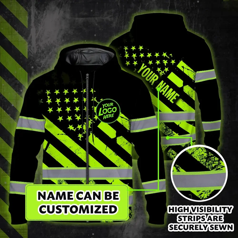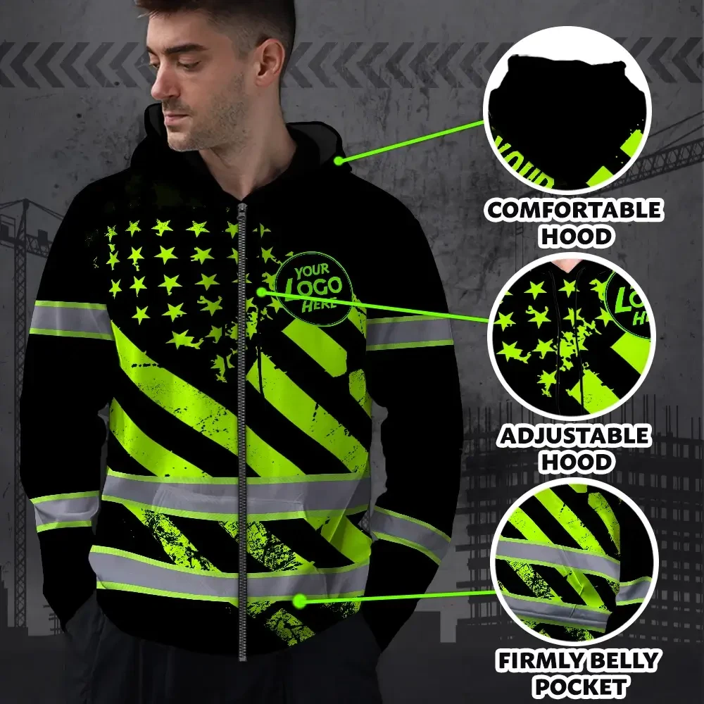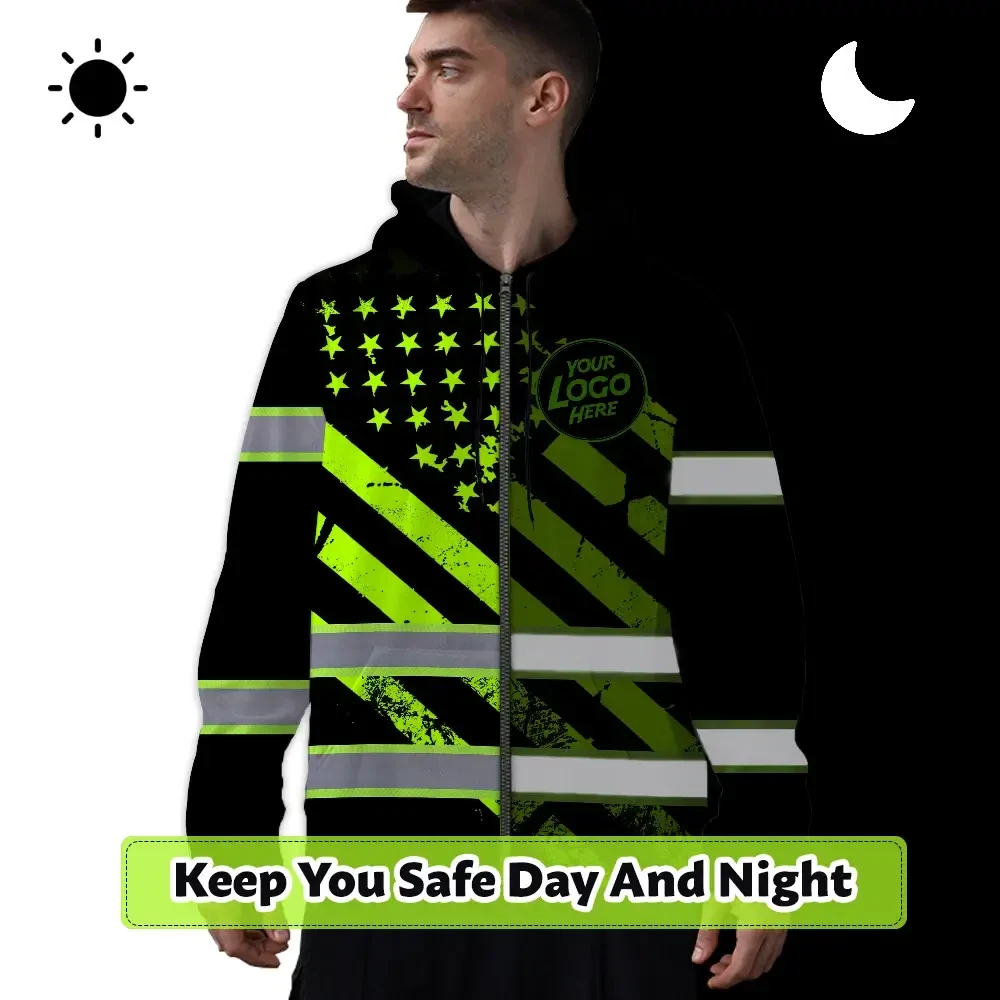 Hi Vis Zip Hoodie Reflective Tapes Green Black USA Flag Custom Name And Logo Safety Workwear