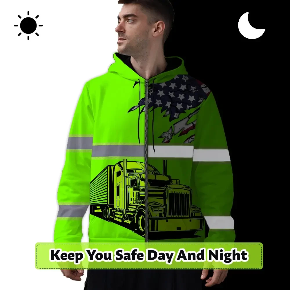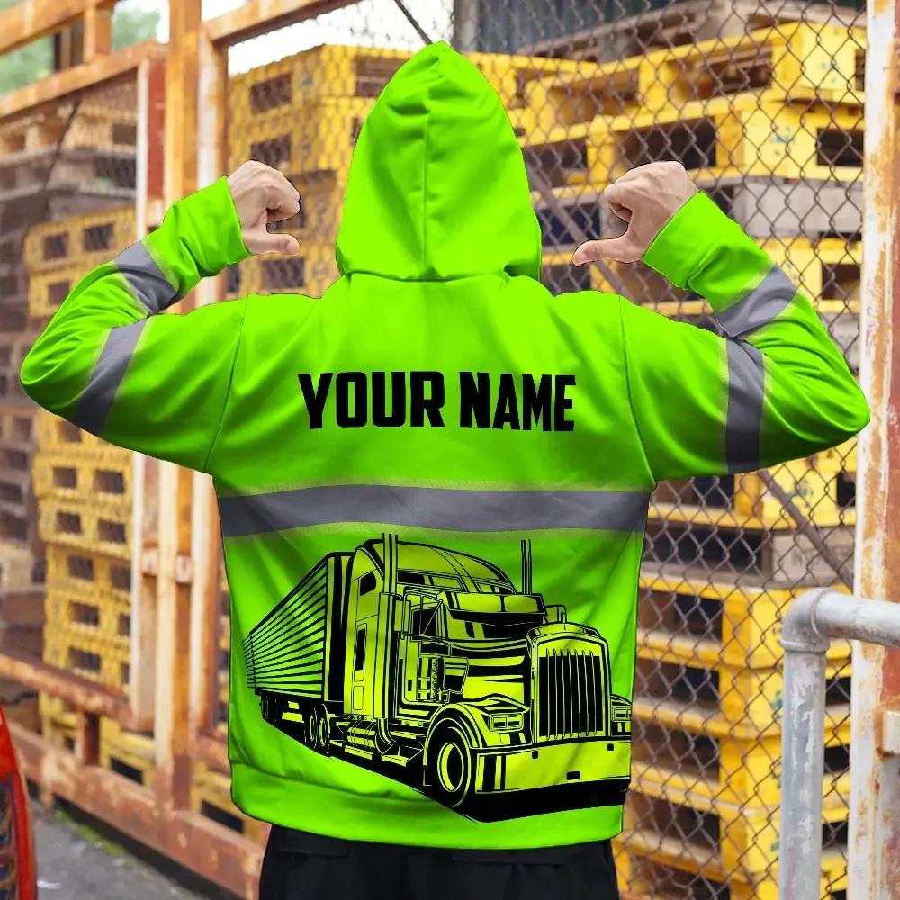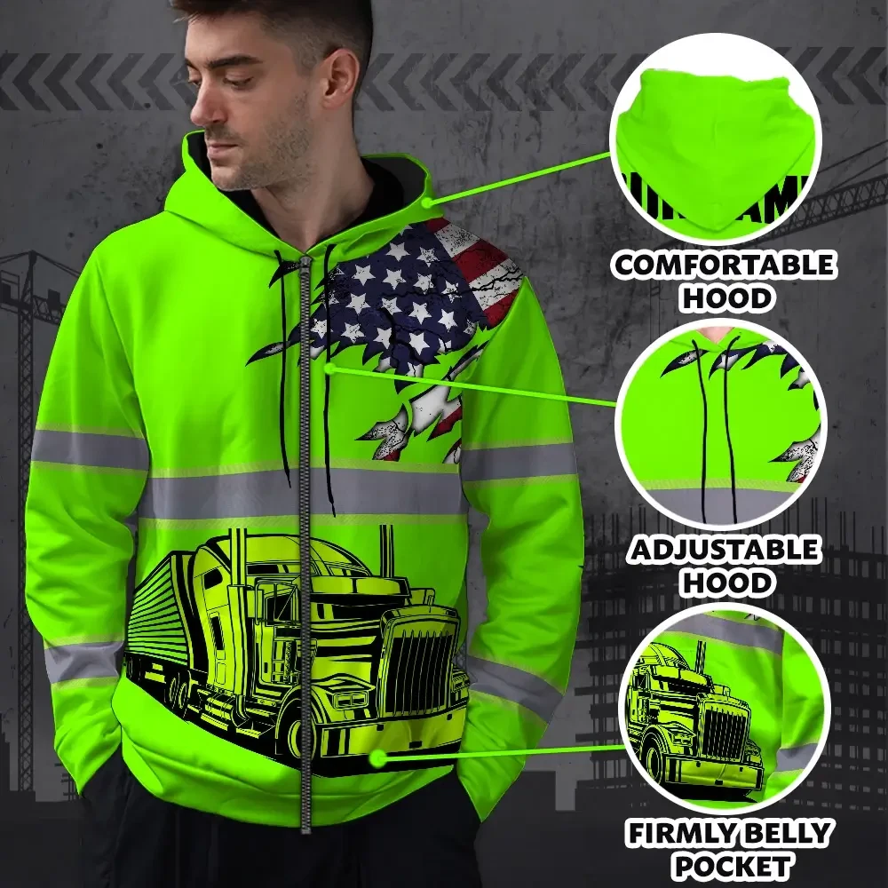 Hi Vis Zip Hoodie Reflective Tapes Green Gradient Semi Truck Driver Custom Name