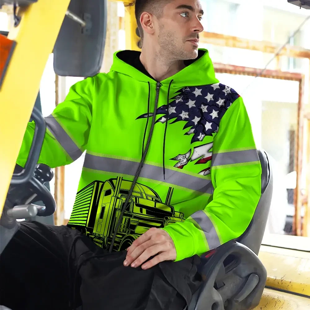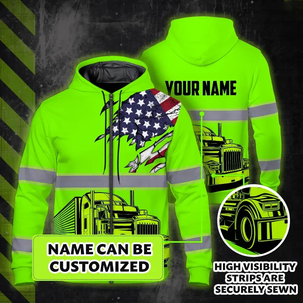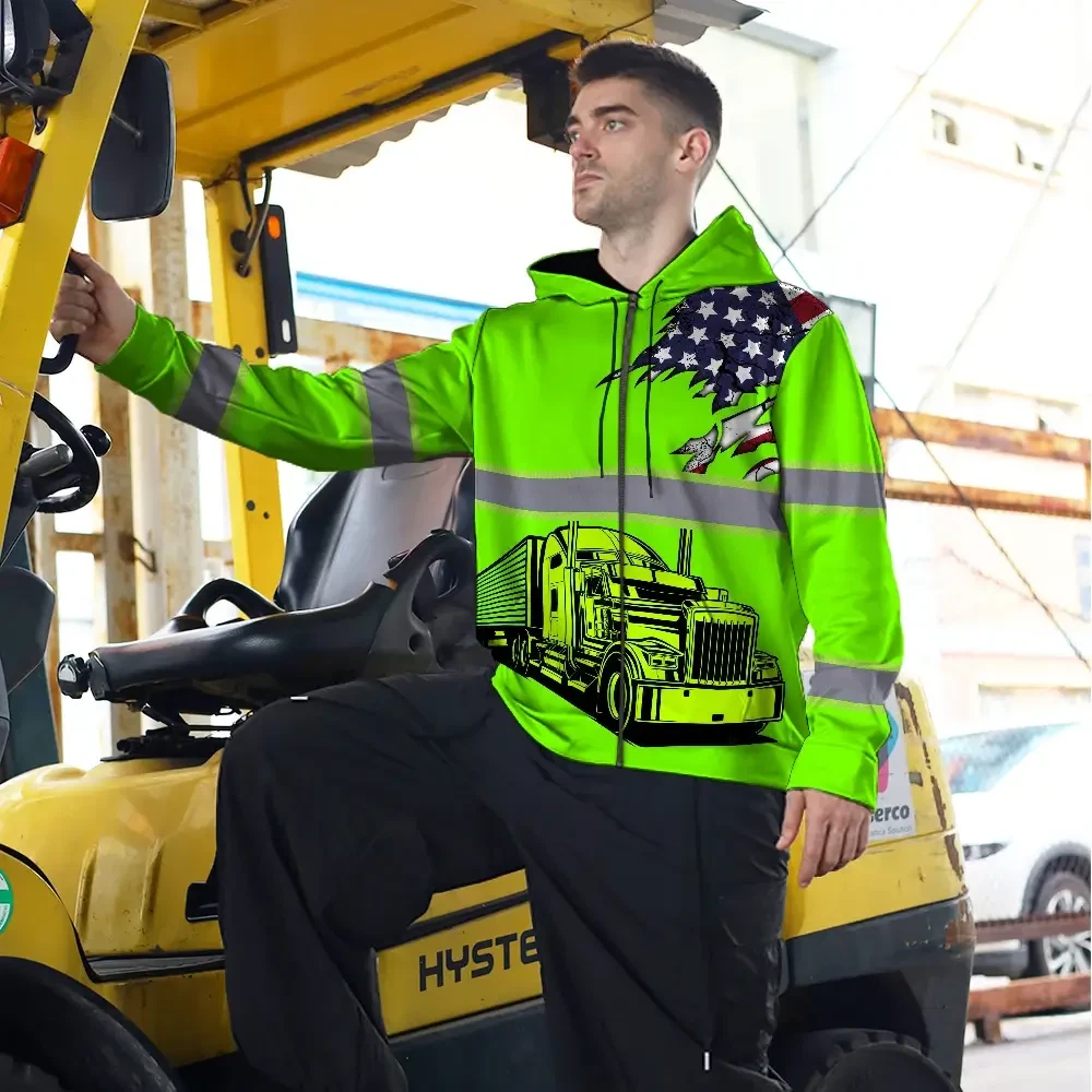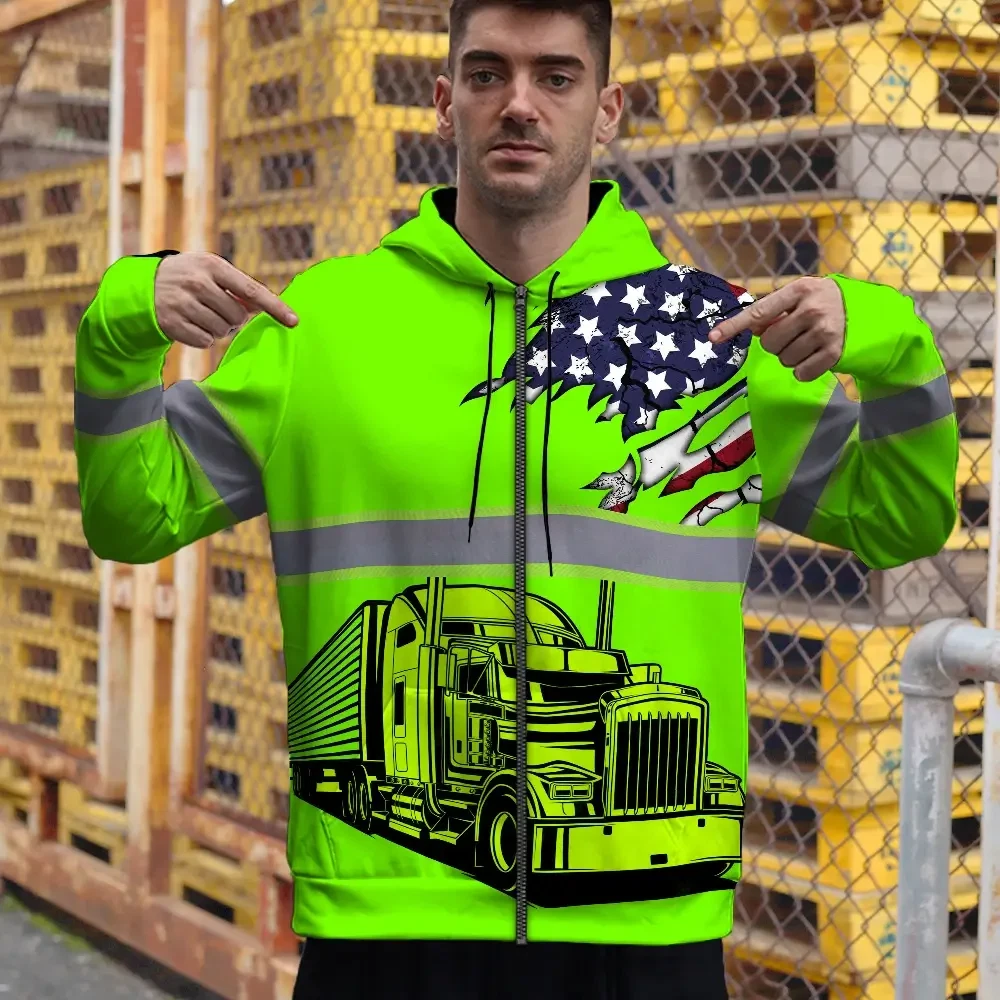 Hi Vis Zip Hoodie Reflective Tapes Green Gradient Semi Truck Driver Custom Name