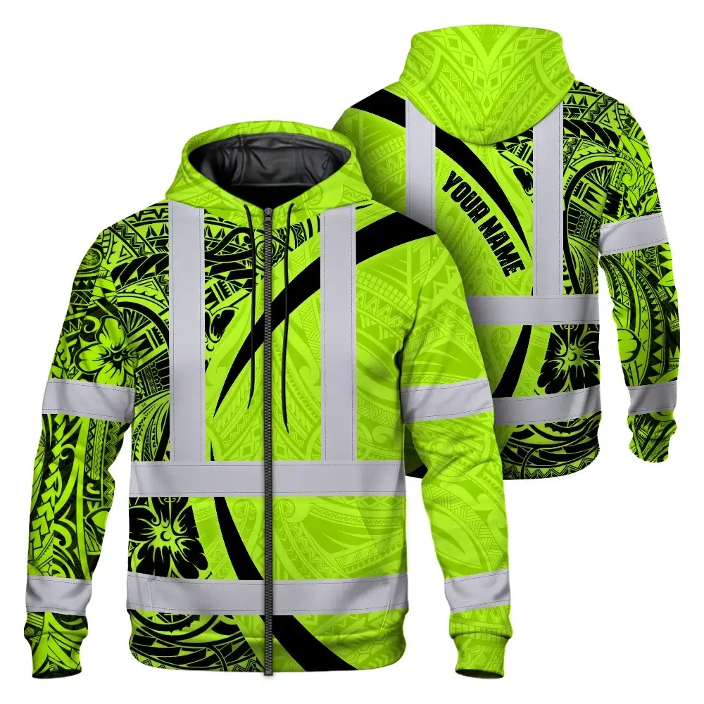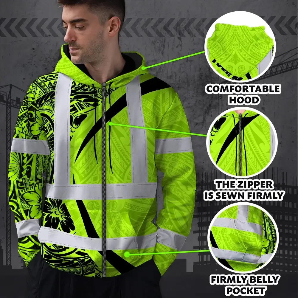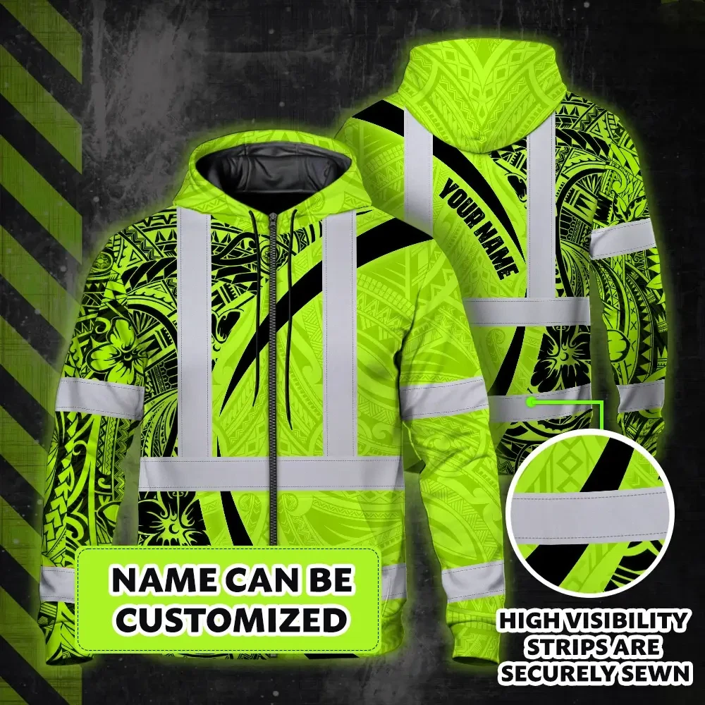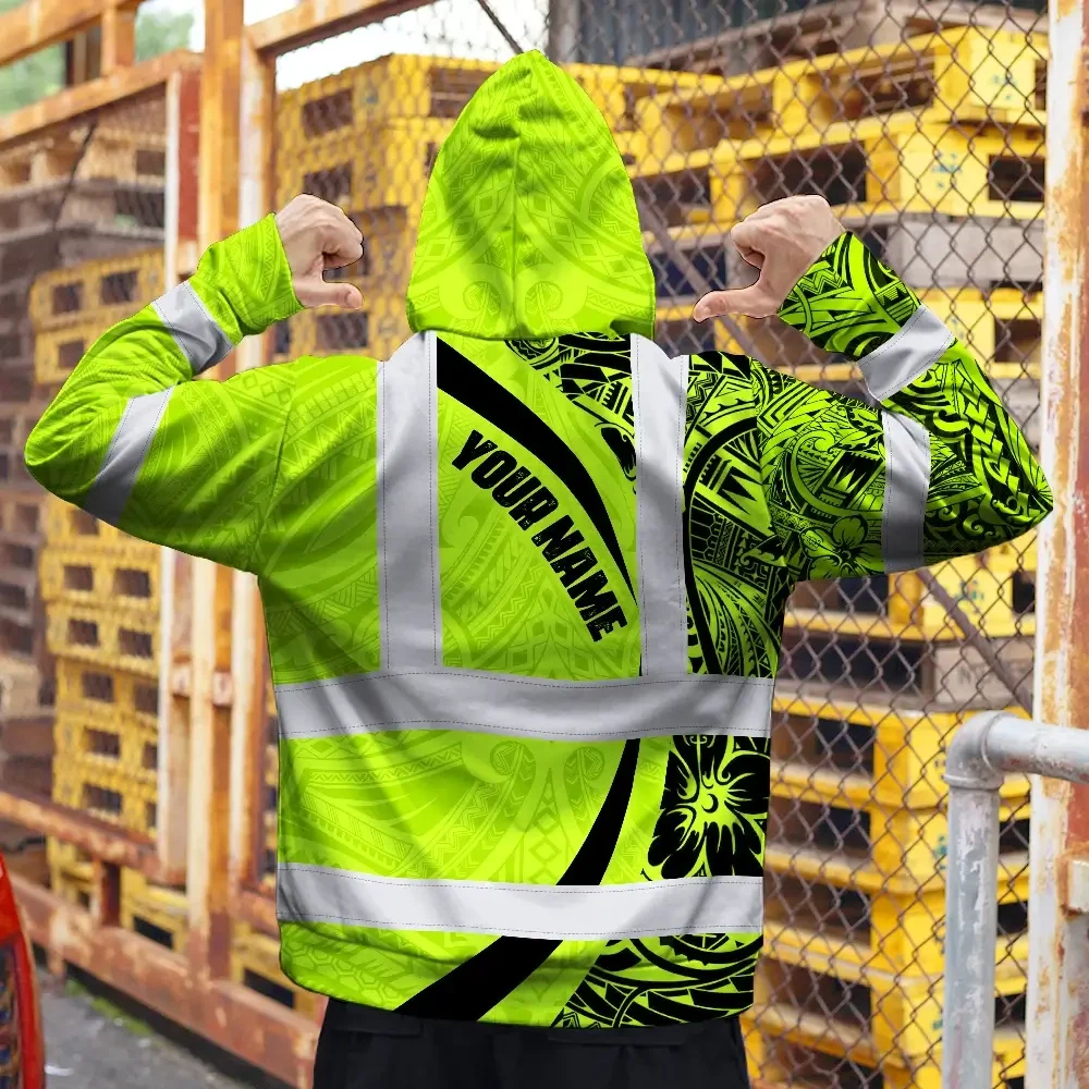 Hi Vis Zip Hoodie Reflective Tapes Green Hawaiian Polynesian Tribal Custom Name Safety Workwear For Workers, Truckers, Operators