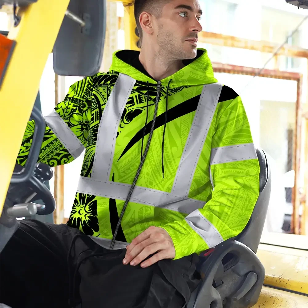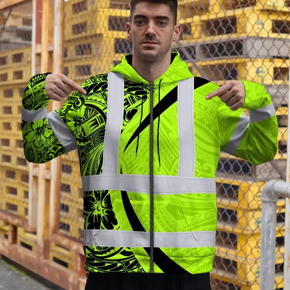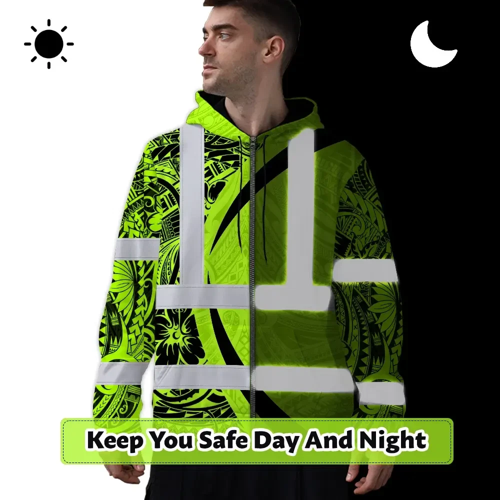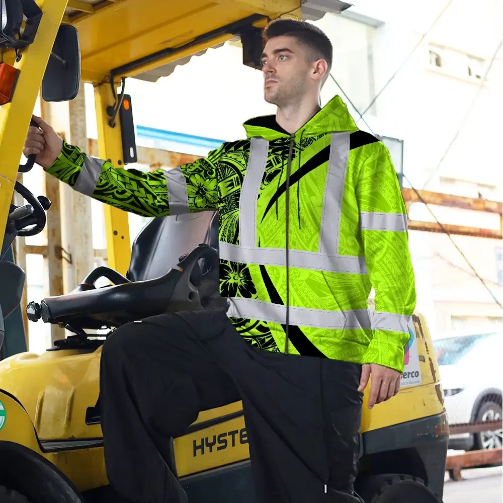 Hi Vis Zip Hoodie Reflective Tapes Green Hawaiian Polynesian Tribal Custom Name Safety Workwear For Workers, Truckers, Operators