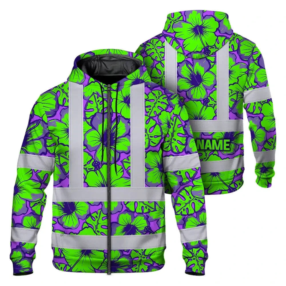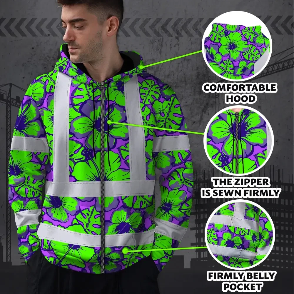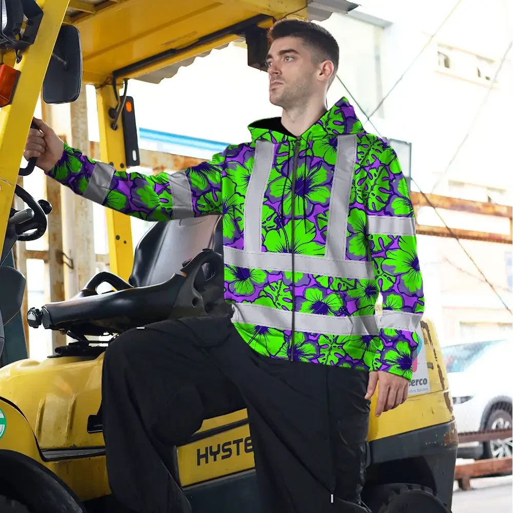 Hi Vis Zip Hoodie Reflective Tapes Green Neon And Violet Flowers Custom Name Safety Workwear For Workers, Truckers, Operators