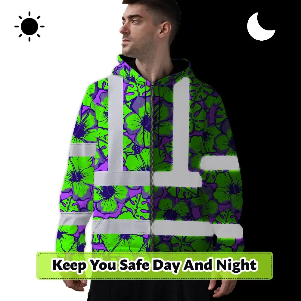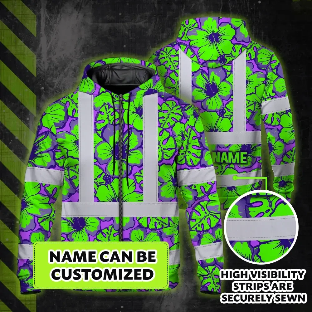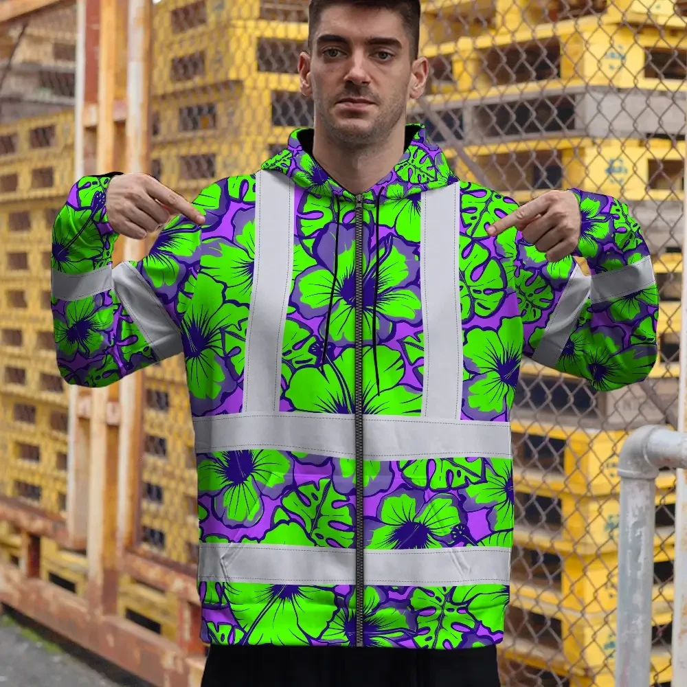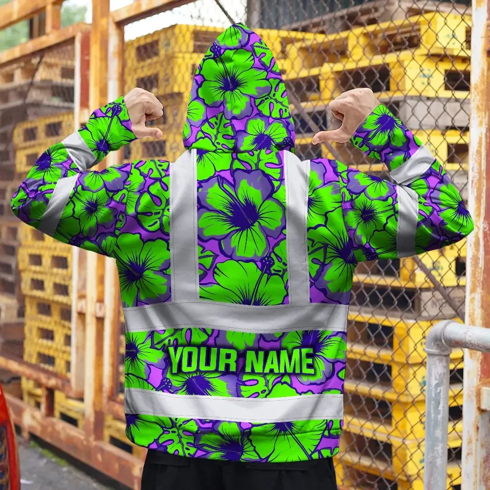 Hi Vis Zip Hoodie Reflective Tapes Green Neon And Violet Flowers Custom Name Safety Workwear For Workers, Truckers, Operators